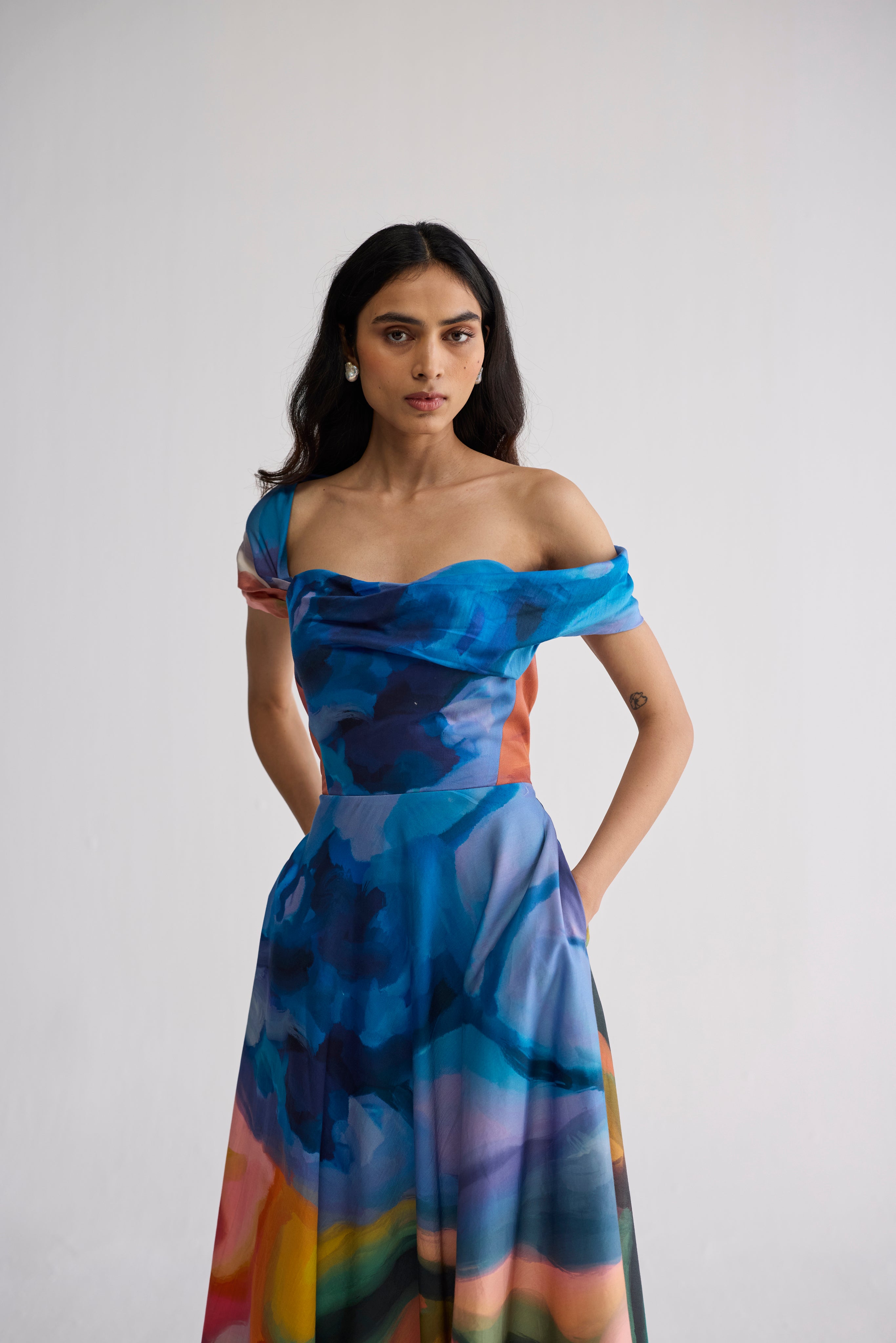 Rainbow Garden Draped Off- Shoulder Dress