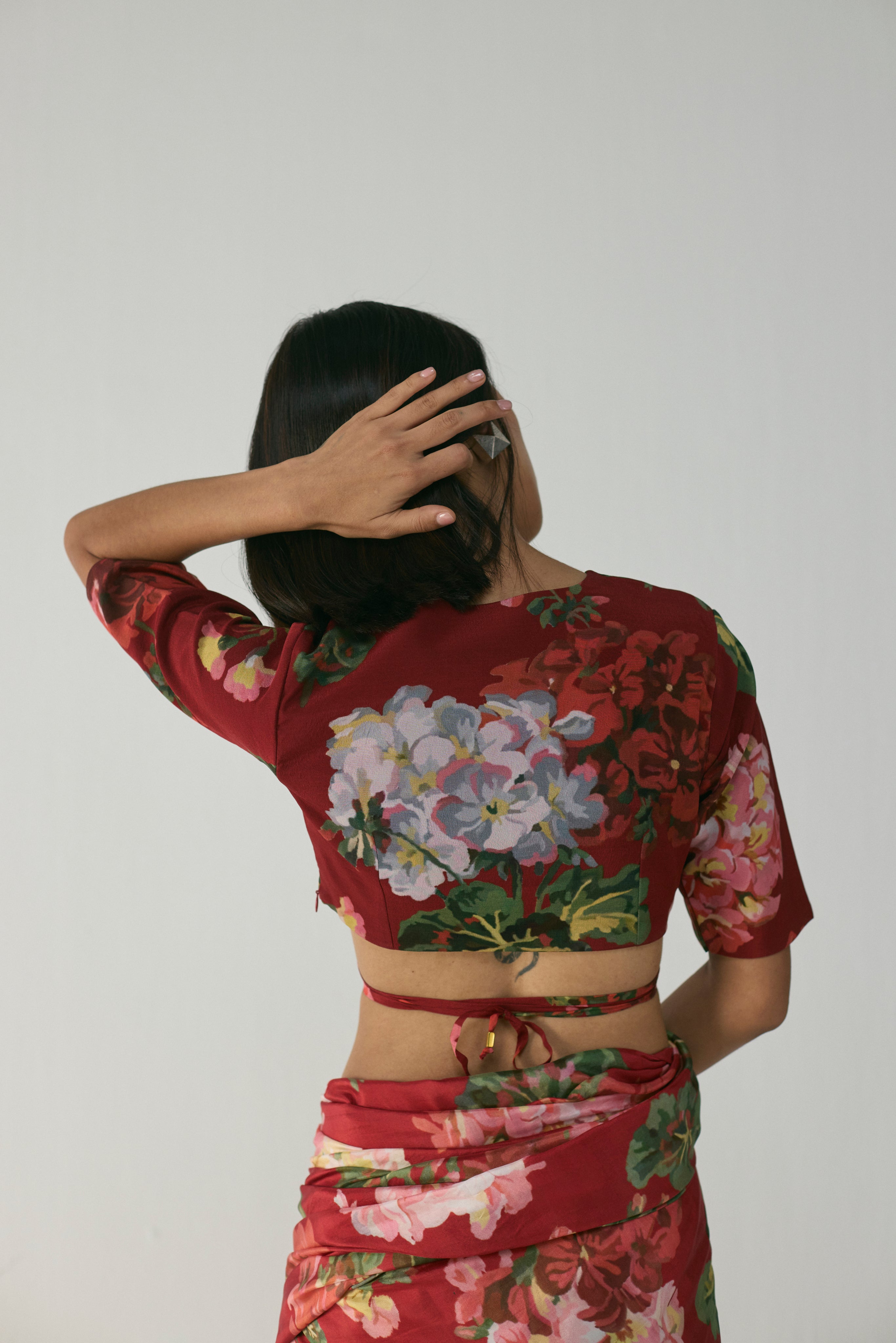 This stunning blouse features a rich, deep red base adorned with an artistic floral print inspired by lush garden blooms. The print brings together layered petals, soft gradients, and painterly strokes in shades of pink, green, white, and coral—creating a romantic yet contemporary visual appeal. The blouse showcases a bold plunging neckline highlighted with intricate hand-embroidered sequins that add dimension and a subtle sparkle. Delicate wrap-around tie details at the waist add a touch of modern sensuality and giving a refined, statement-making look.