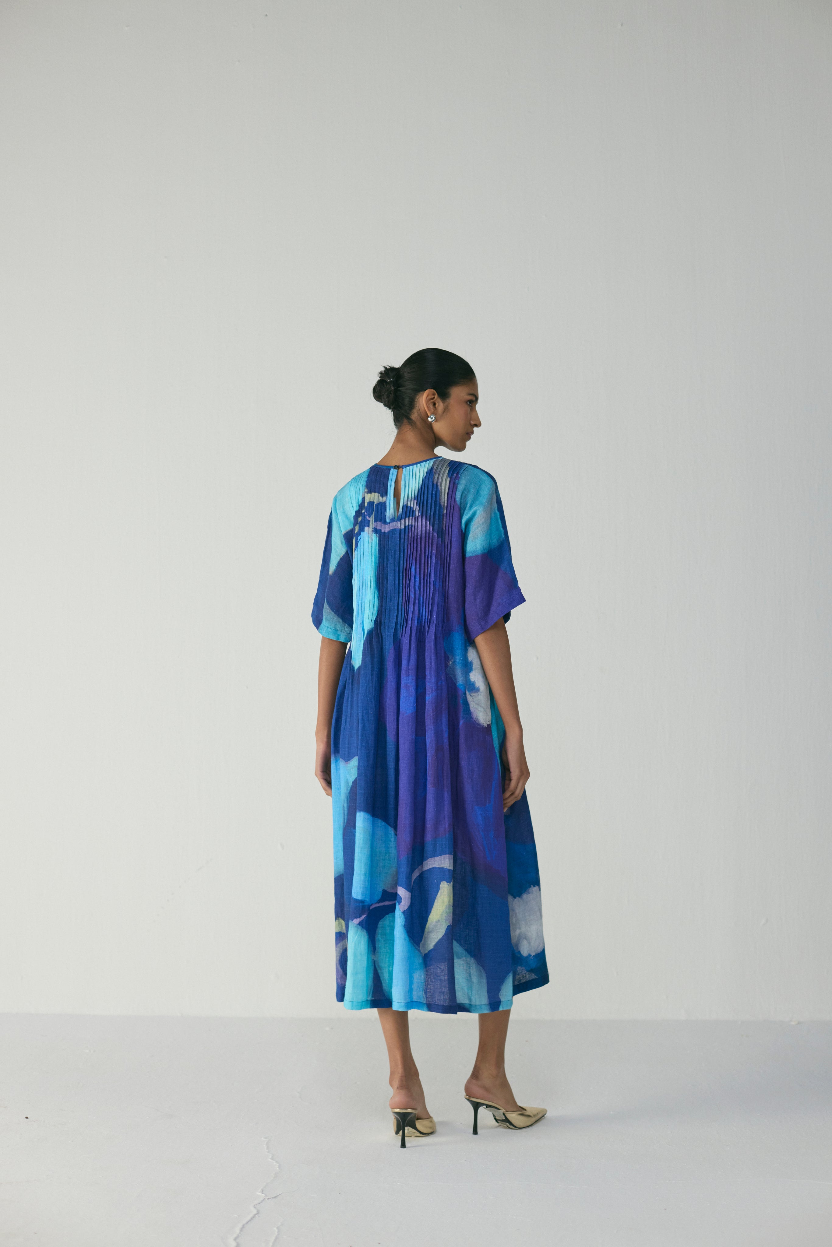 Crafted in a lightweight, breathable Linen fabric, this linen pintucks dress features a hand-painted-inspired print in striking hues of cobalt, aqua, and deep navy — evoking a sense of abstract movement and serene depth.