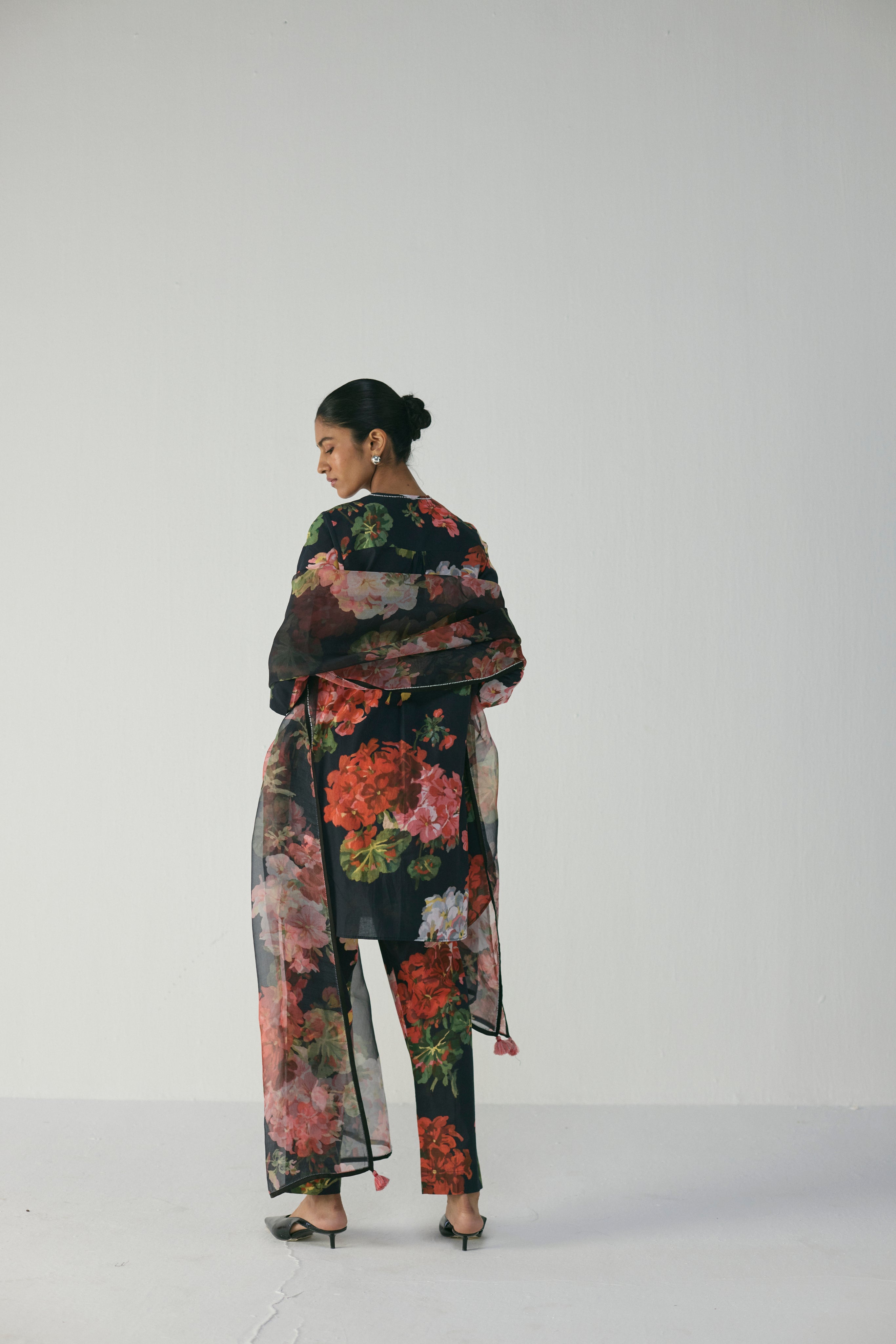 A lightweight, ethereal organza dupatta featuring an all-over painterly floral print in vibrant hues of pink, red, green, and soft ivory against a dark base. The sheer fabric drapes fluidly, creating a soft, romantic silhouette with beautiful movement. The dupatta is finished with a fine contrasting edge, delicately accented with small tassel details on the corners, adding subtle charm.