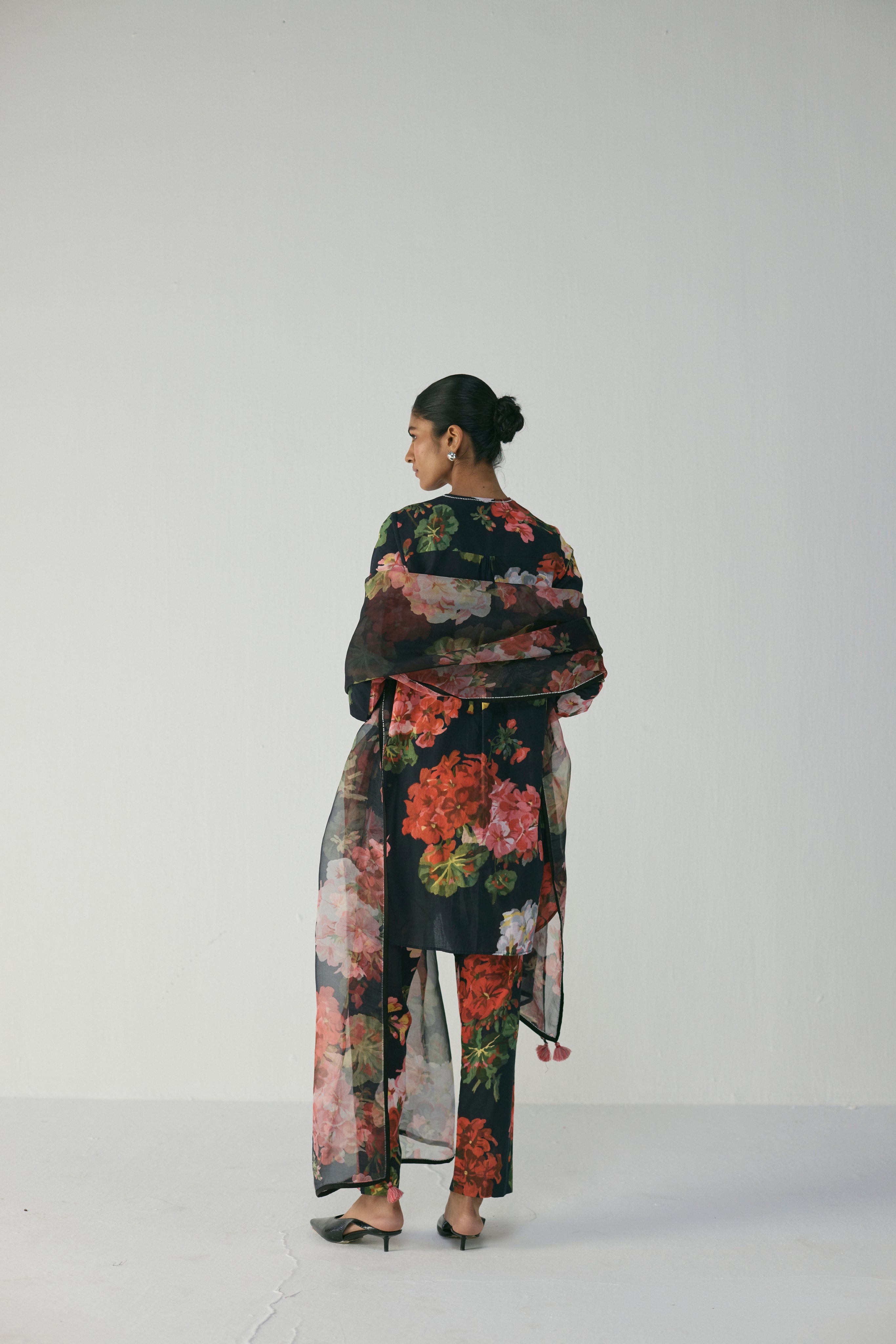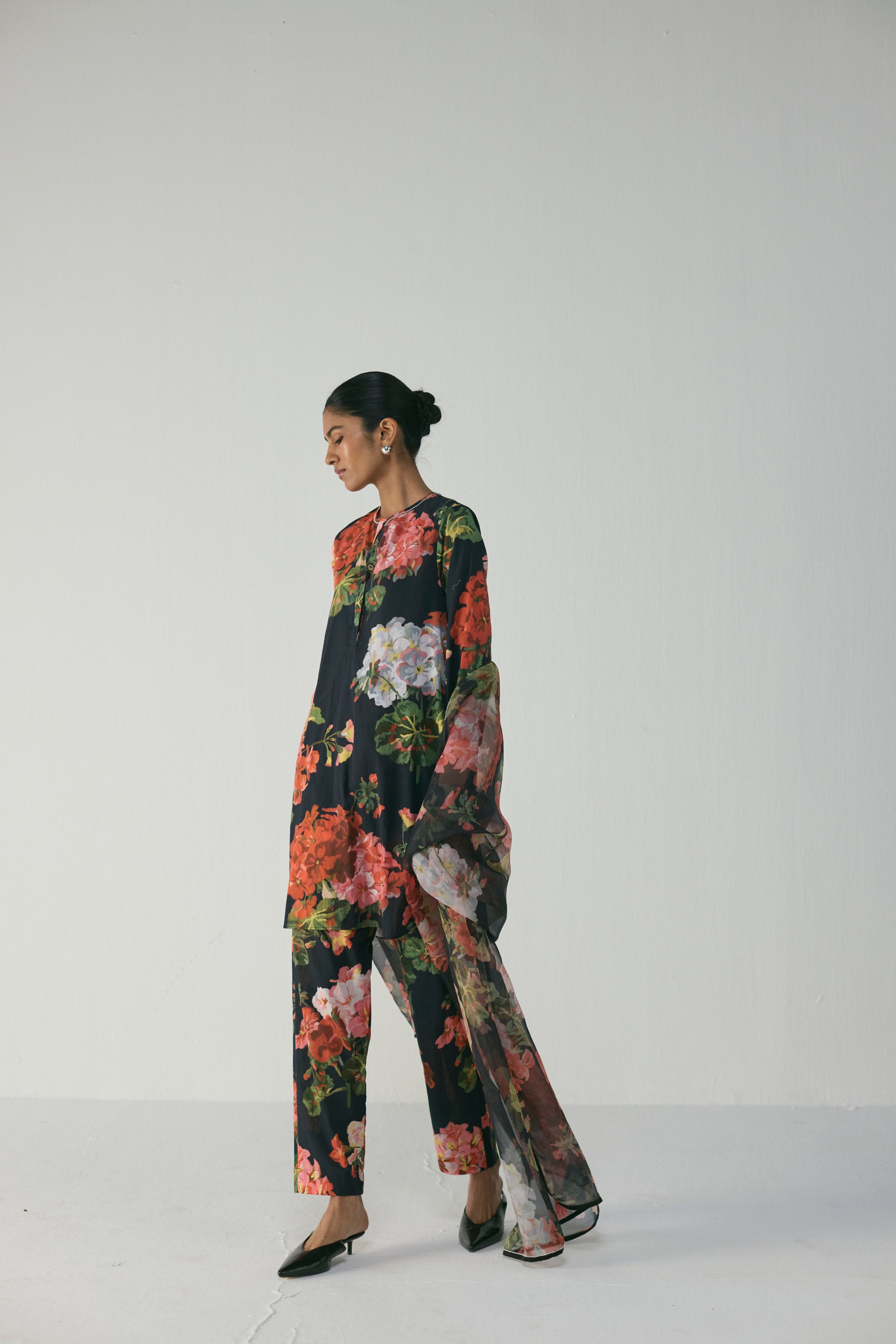 This striking floral kurta set showcases a bold play of blooms in vibrant red, blush, and green hues against a deep black base. Crafted in soft crepe fabric, it offers a fluid drape and effortless sophistication.