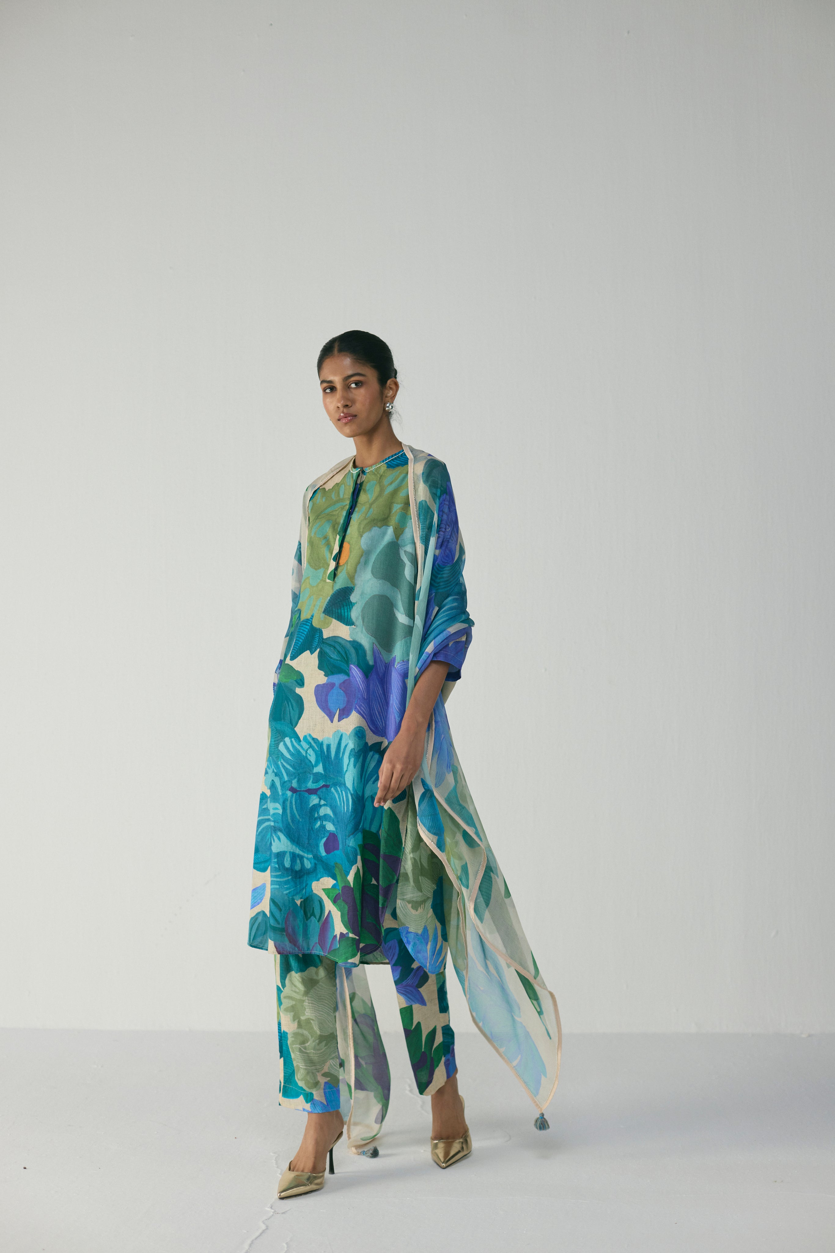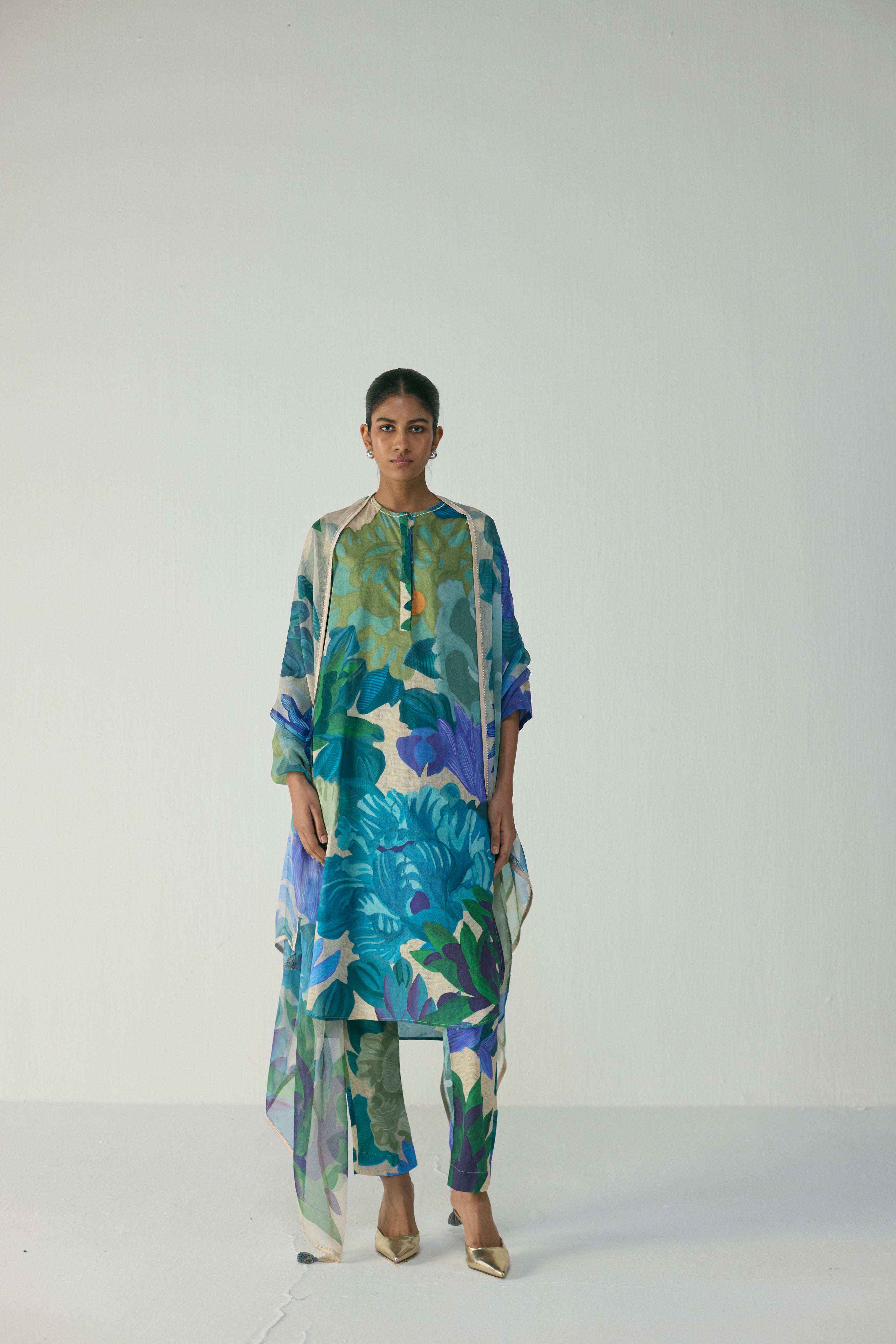 This elegant kurta set brings together effortless comfort and contemporary botanical artistry. Designed in a relaxed straight silhouette, the kurta features a clean round neckline with a front placket, full sleeves, and a fluid drape that flatters all body types. Paired with matching printed trousers and a lightweight, sheer dupatta, this ensemble creates a coordinated look with beautiful movement and sophistication. Crafted from breathable, soft fabric, it is ideal for daytime dressing, relaxed festive wear, or elevated casual outings.