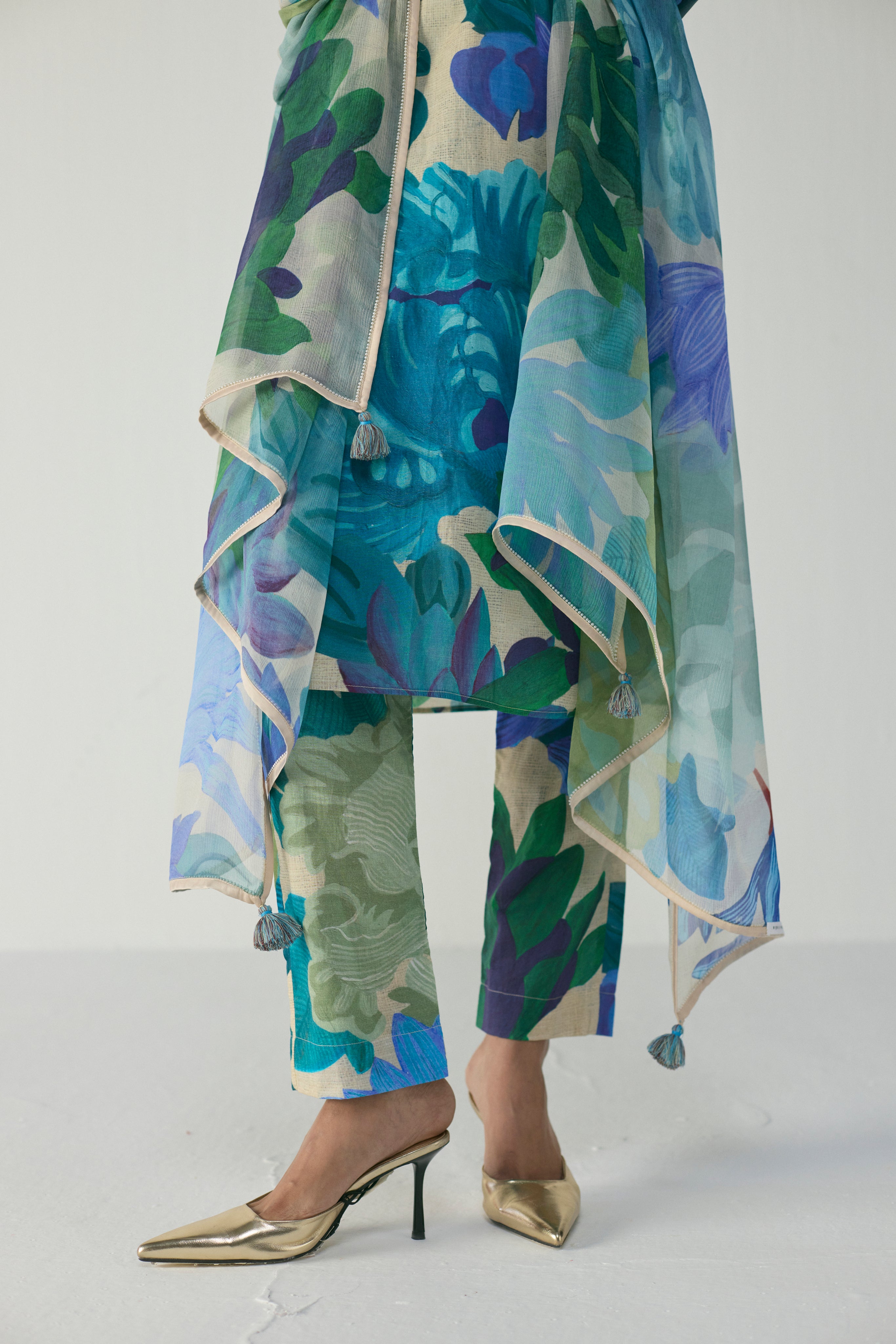 The set is adorned with a striking painterly botanical print, inspired by lush tropical foliage. Oversized leaves and abstract florals unfold in refreshing tones of teal, turquoise, ocean blue, emerald green, and soft lilac, layered over a natural beige textured base. The print blends watercolor gradients and hand-rendered detailing, giving the ensemble an artistic depth and a sense of organic calm. The interplay of cool tones against the neutral backdrop creates a serene yet statement-making visual.