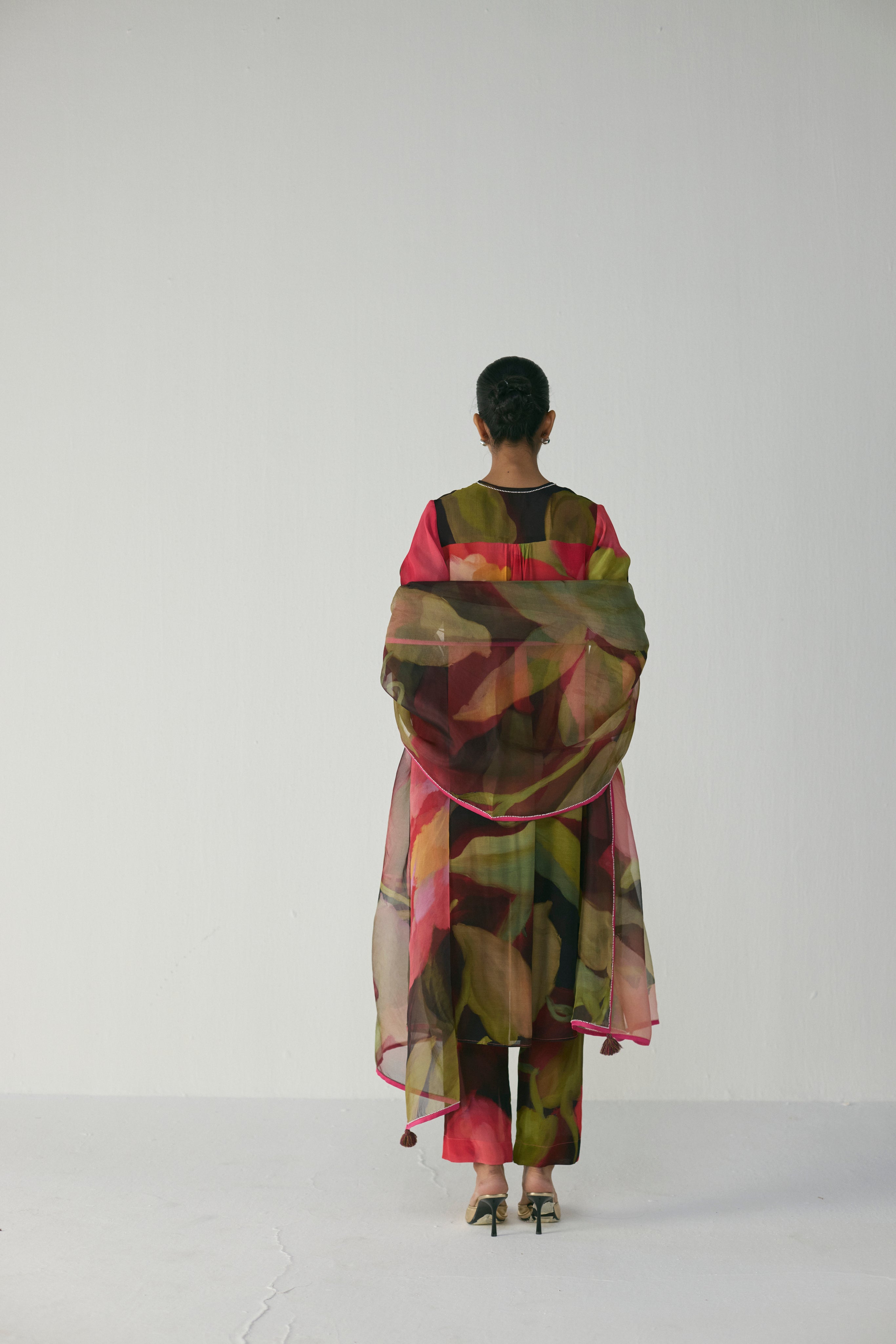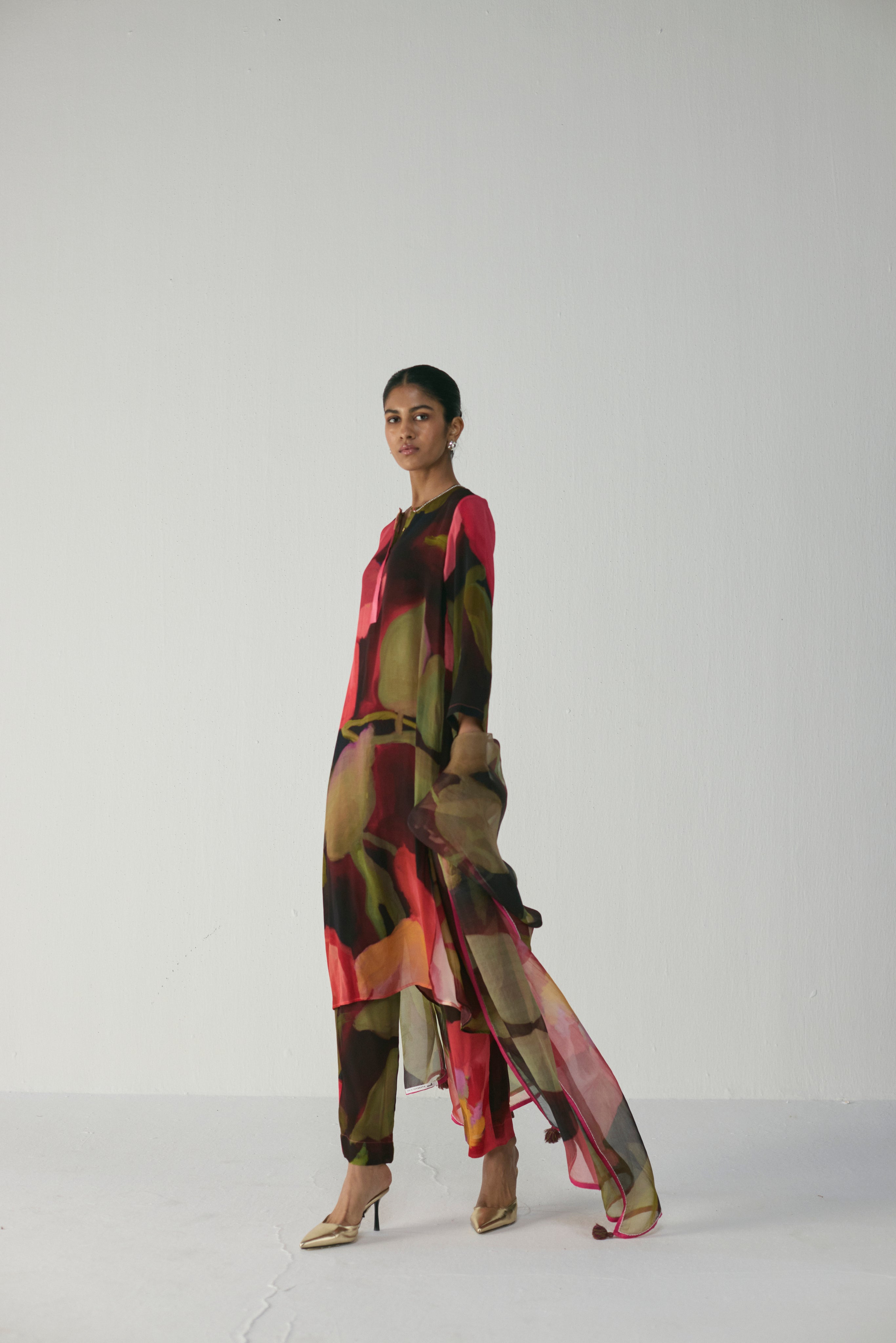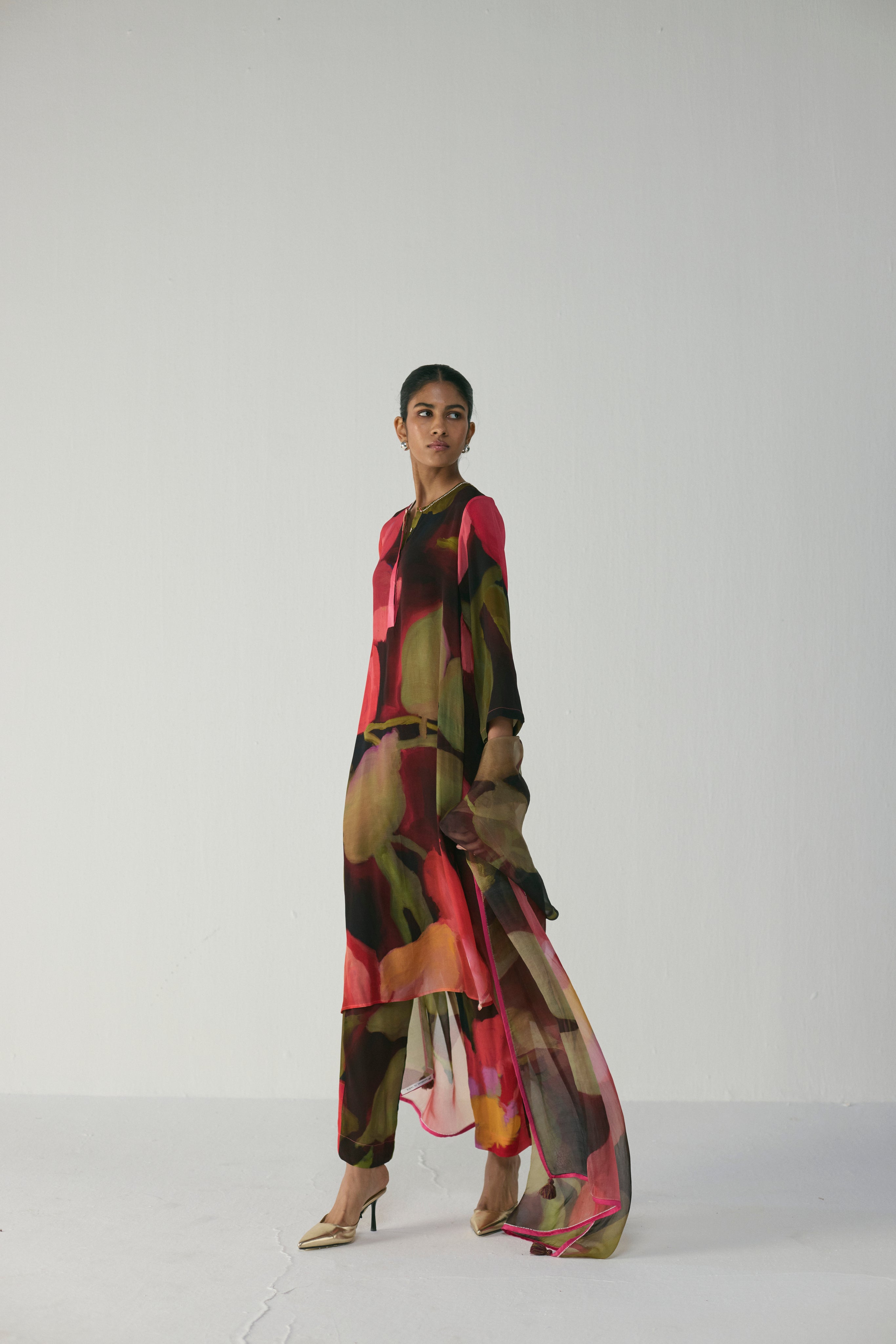 The Kurta is a straight-cut, long-sleeved kurta with a comfortable, relaxed fit. It features a neckline collar with a hidden placket. The fabric appears to be a lightweight crepe, allowing the print to drape elegantly. The trousers are mid-rise, full-length, and tailored in a comfortable along with the side pockets , straight, or slightly wide-leg cut, continuing the same dynamic print for a unified look.