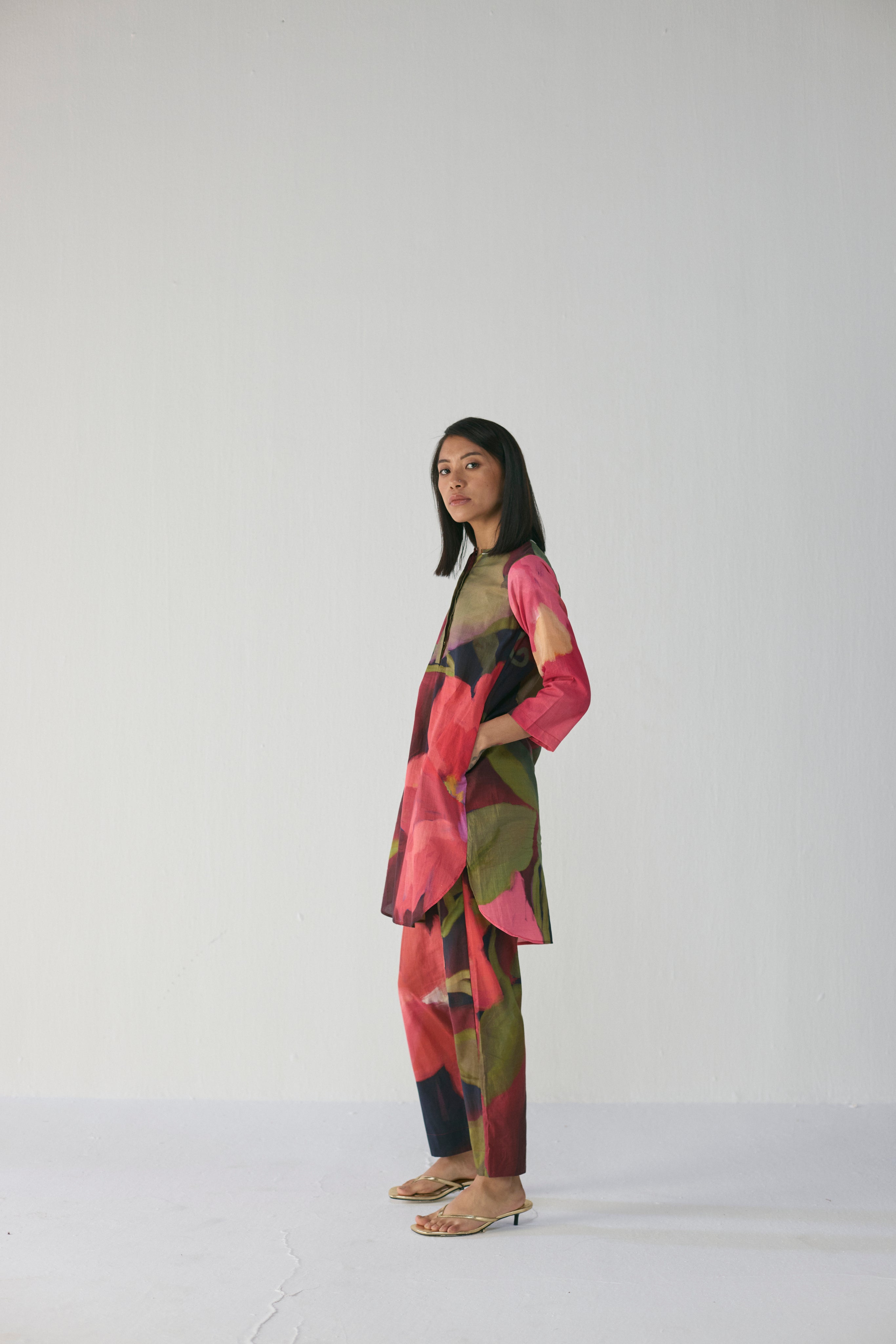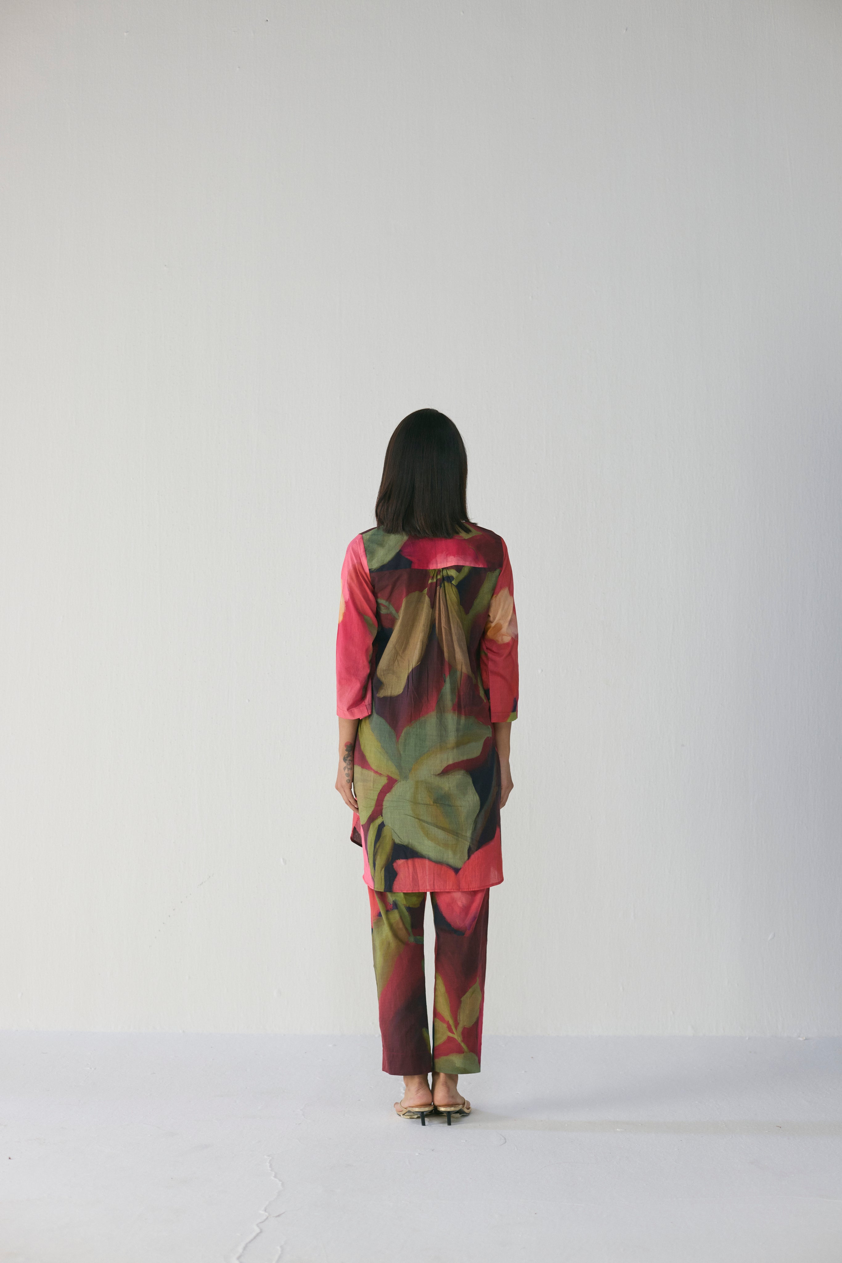The kurta is designed with a straight, relaxed silhouette, a keyhole neckline, and full sleeves, making it both comfortable and refined for everyday elegance or special occasions. The coordinated trousers mirror the floral pattern, creating a harmonious, contemporary look that balances comfort with artistry.