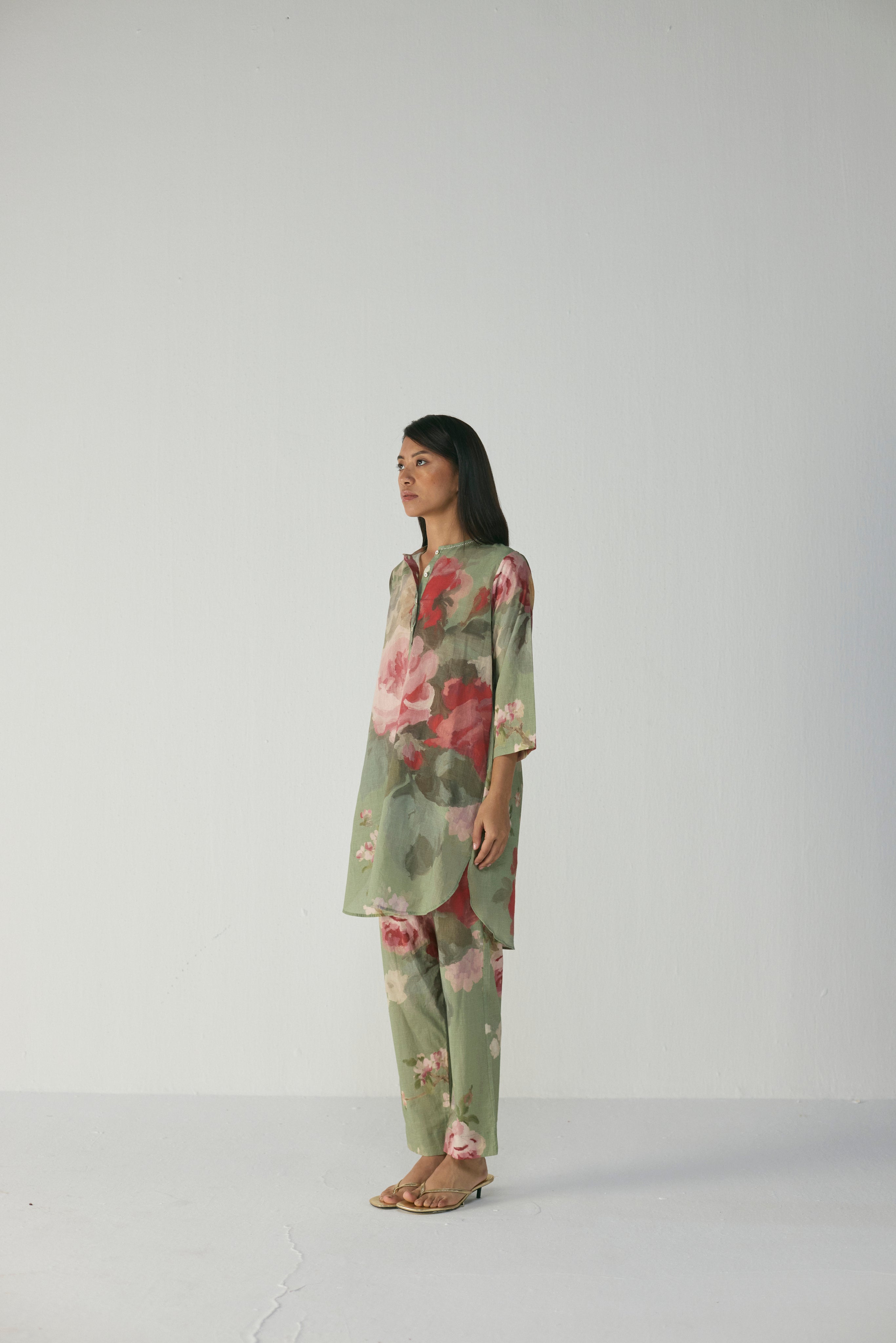 The kurta set is adorned with a stunning painterly floral print inspired by hand-painted botanical artwork. Soft, blurred roses in delicate hues of blush pink, deep rose, and creamy ivory bloom across a calming sage-green backdrop, creating a soothing yet elevated aesthetic. The ensemble is crafted in a lightweight, airy fabric that drapes beautifully while allowing ease of movement, making it ideal for both casual outings and refined daytime gatherings.
