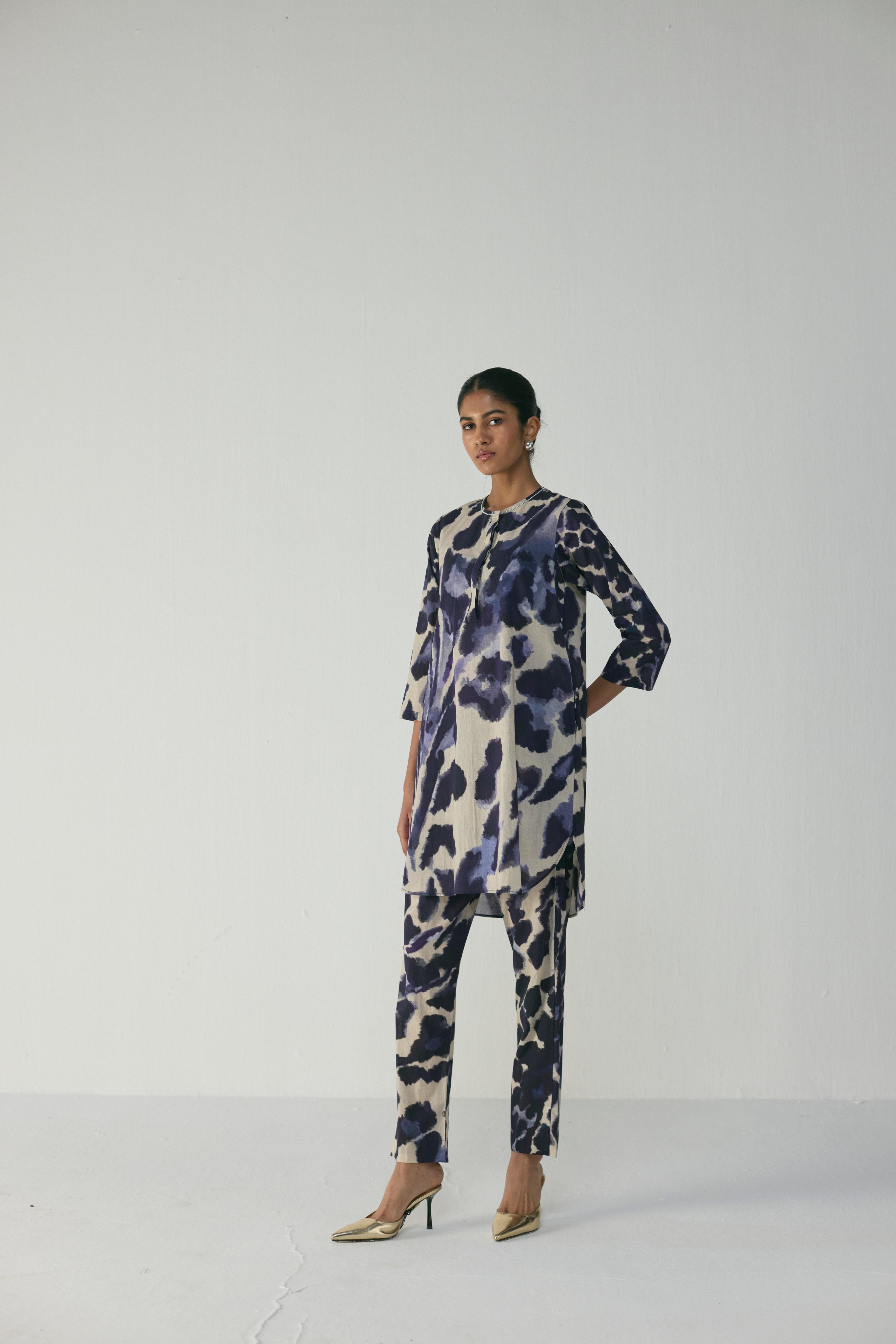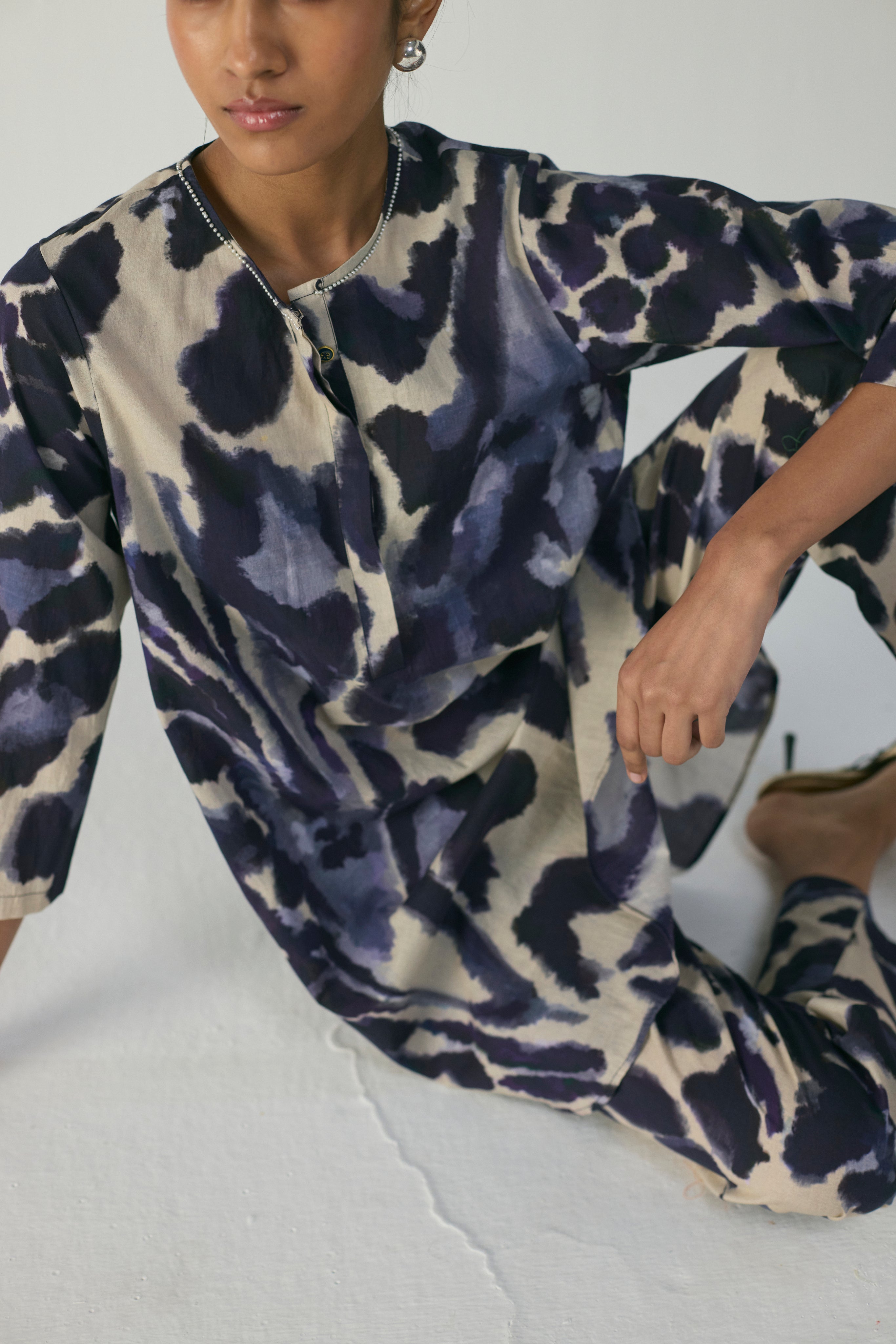 This Indigo Abstract Cotton Kurta Set is designed for comfort and versatility. Crafted in soft, breathable cotton, the set features a relaxed straight-cut kurta paired with matching trousers — both adorned with a painterly abstract print in deep indigo and ivory tones.