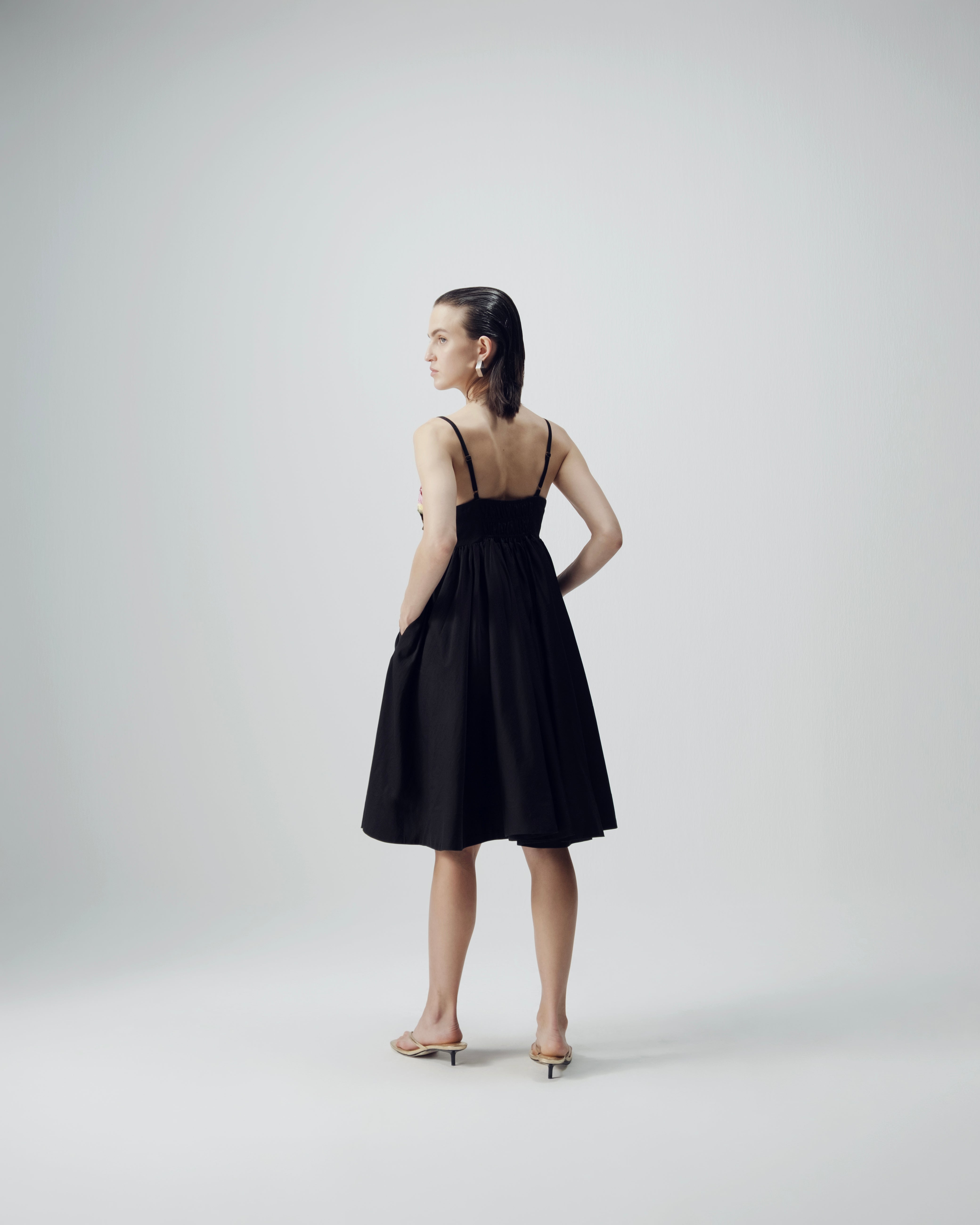 Elevate your wardrobe with this chic black midi dress, designed with a blend of minimal elegance and artistic detailing. The dress features delicate shoulder straps and a soft, flowy silhouette that falls gracefully below the knee. Its highlight is the beautifully crafted floral patch machine embroidery on the bodice—an intricate arrangement of pink blossoms and lush green leaves that adds a romantic, handcrafted charm to the otherwise sleek and modern design. Comfortable, lightweight, and effortlessly stylish, this dress makes a perfect choice for brunches, intimate gatherings, evening outings, or statement daywear.