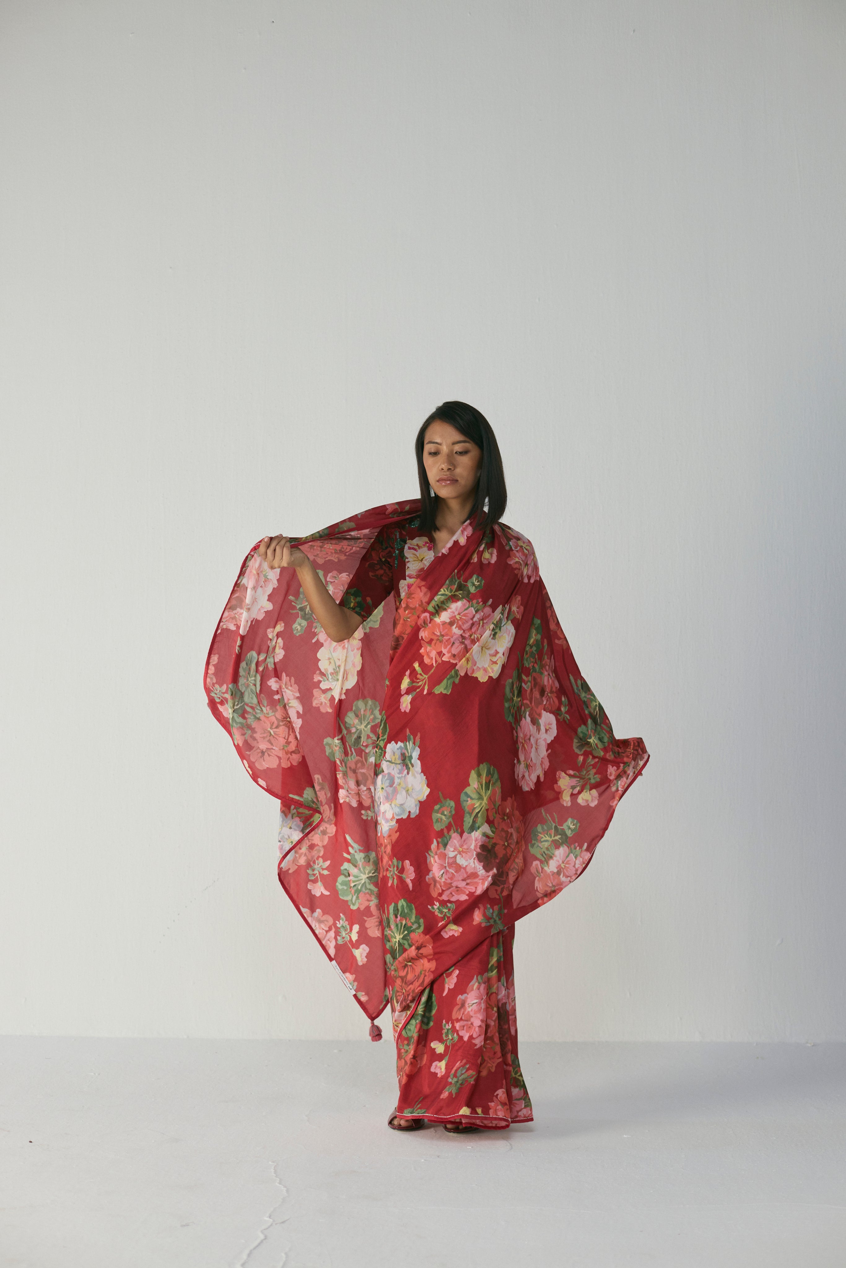 This saree features a striking painterly floral print set on a rich ruby-red base, creating an elegant yet bold visual impact. The artwork showcases blooming roses, daisies, and lush foliage in harmonious shades of blush pink, soft coral, ivory, and leafy greens. The florals carry a hand-painted, watercolor-inspired texture, giving the saree an artistic depth and a luxurious, crafted feel. The placement of the print enhances both the drape and the movement of the saree, making it visually captivating from every angle.