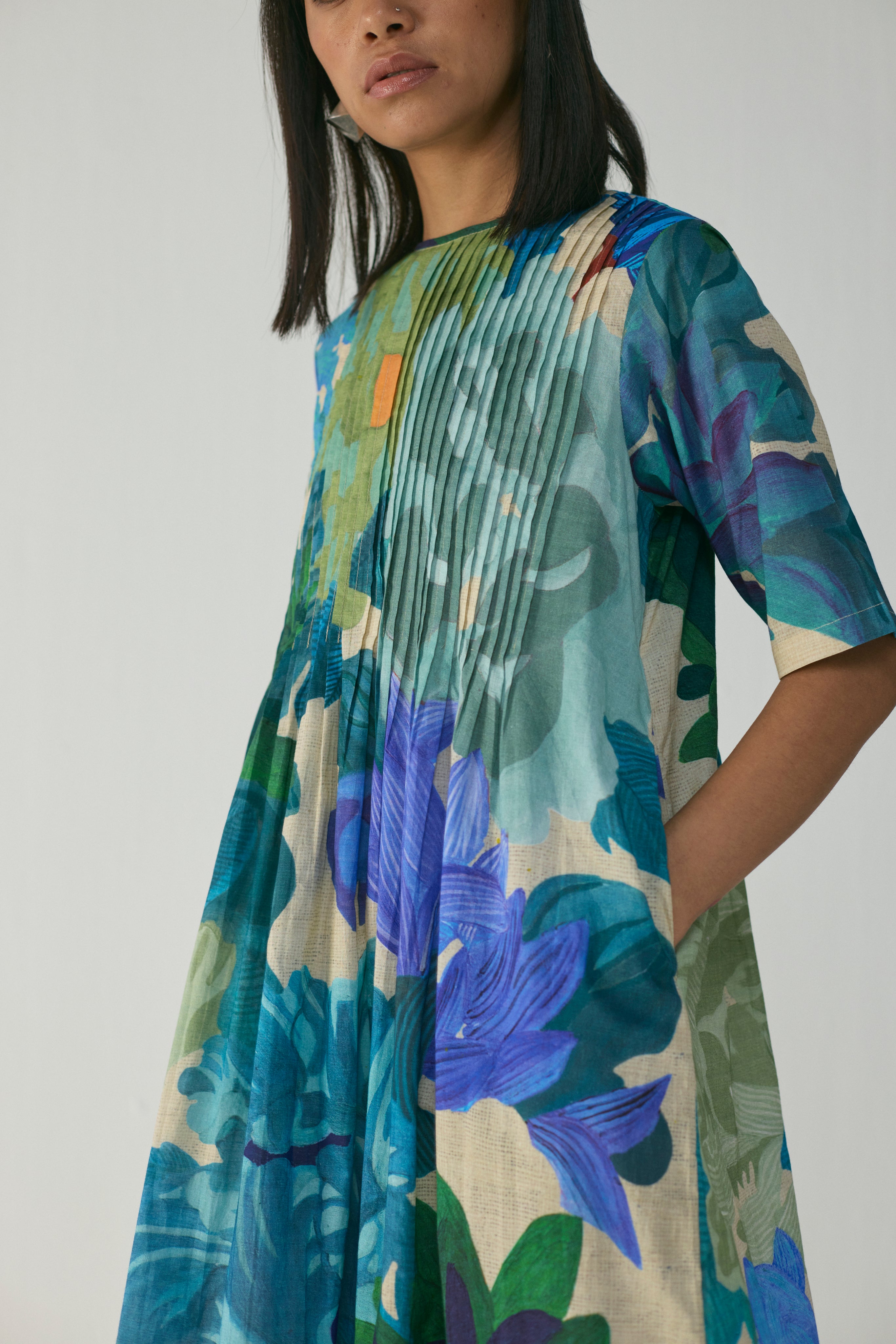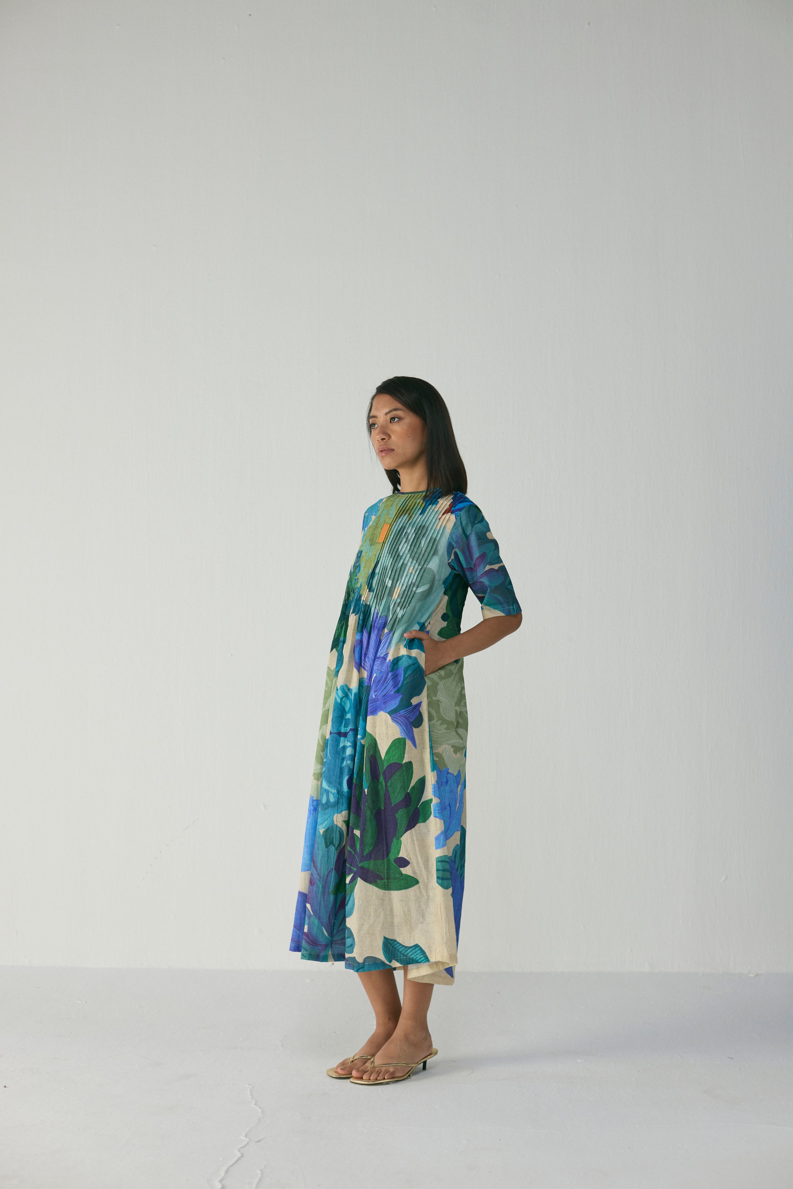 The dress showcases a vibrant botanical-inspired print in refreshing shades of teal, cobalt blue, leaf green, and deep aqua, set against a neutral, textured beige base. The oversized floral and foliage motifs have a painterly, hand-rendered character, blending gradients, delicate brushstrokes, and layered leafy patterns. The interplay of cool tones with organic forms creates a soothing, nature-infused visual statement—bold yet elegant, ideal for the modern wardrobe.