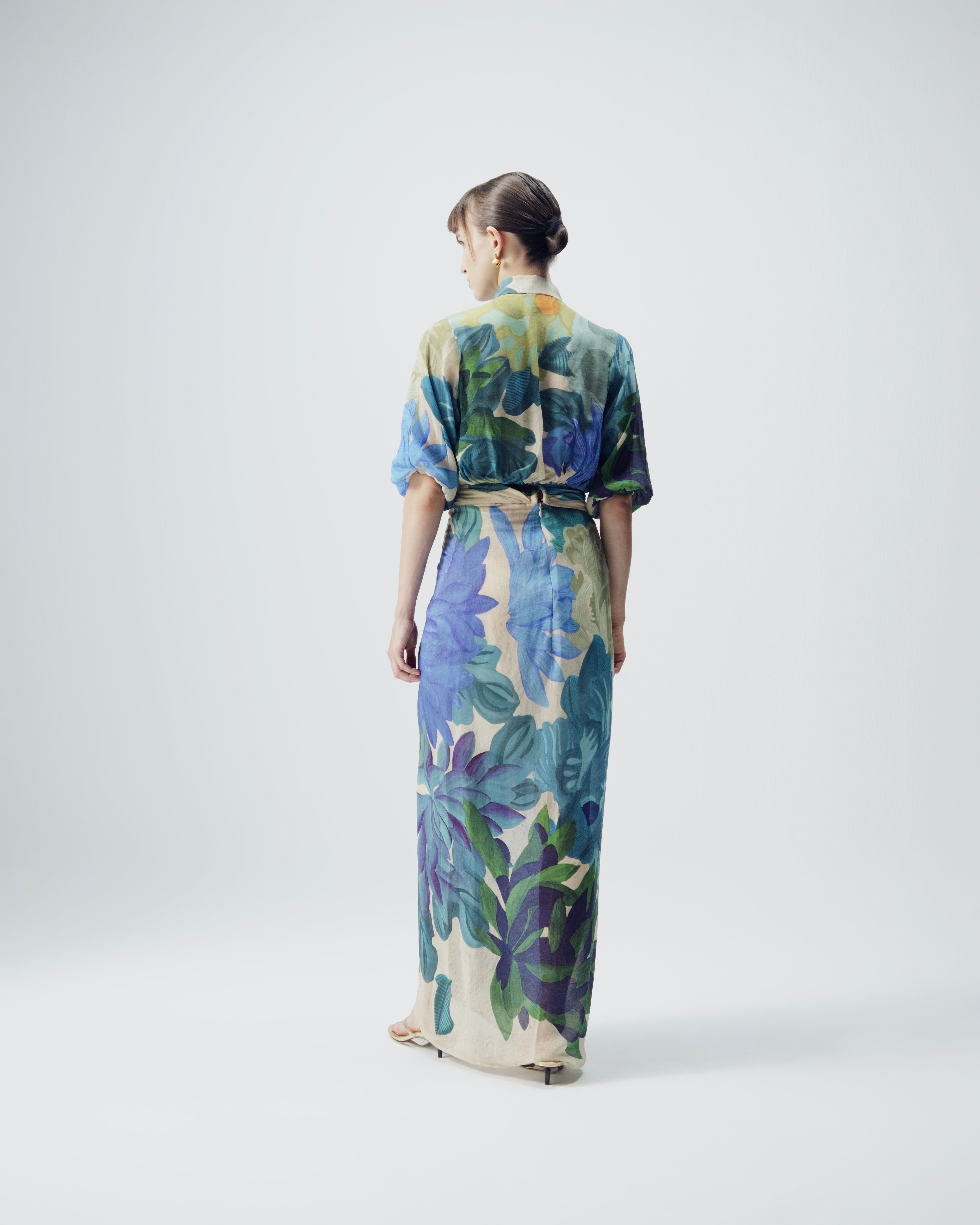The set features a lightweight printed shirt with a classic collar and relaxed sleeves, styled here in a knotted fashion for a modern, youthful edge. Paired with a fluid printed drape skirt that sits beautifully on the body, the ensemble offers movement, comfort, and elevated casual elegance. Perfect for vacations, beachside evenings, brunch outings, or statement summer dressing.