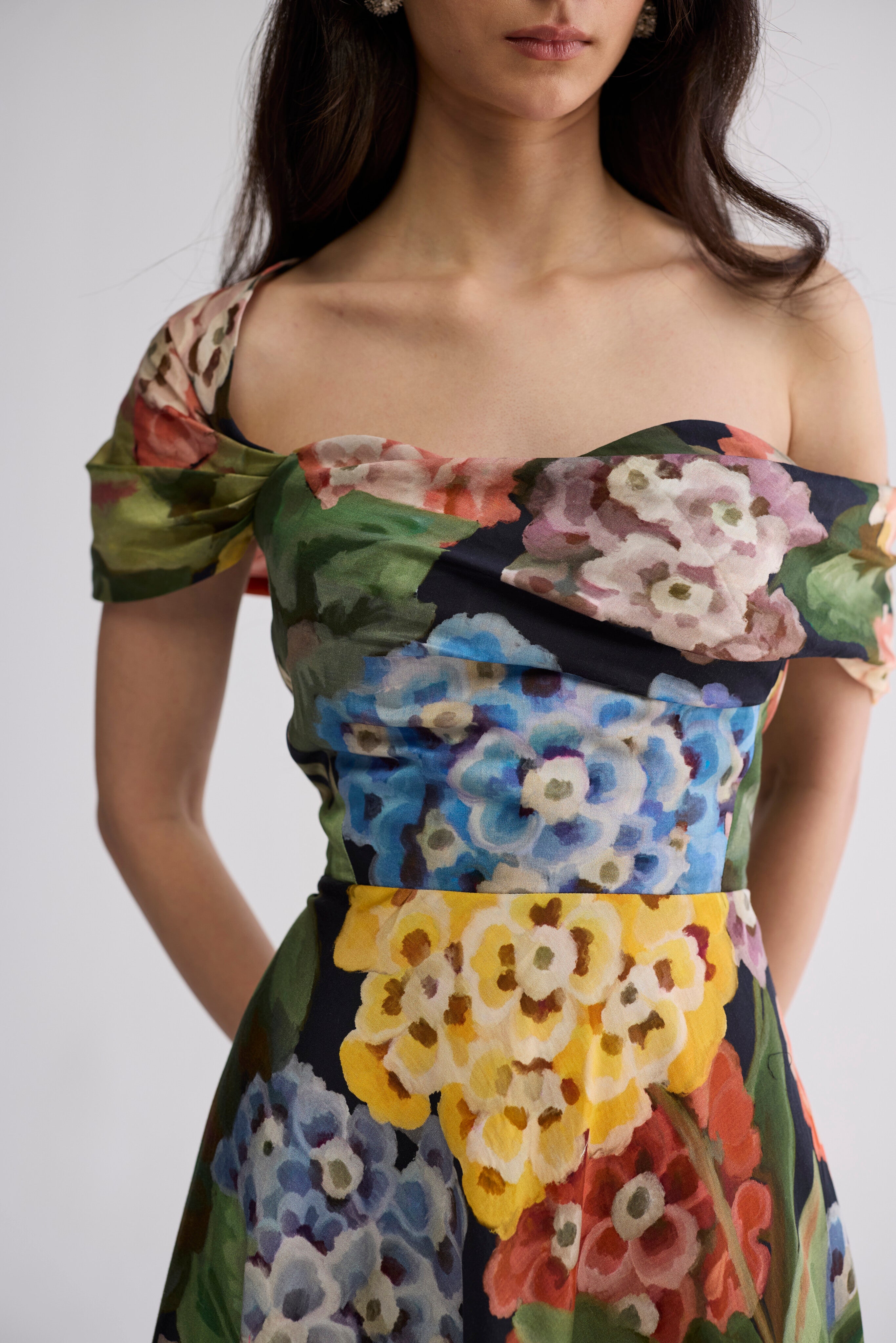 Soft waves or a sleek low bun enhance the neckline; go for natural makeup with a fresh glow or a subtle bold lip to match the floral tones.