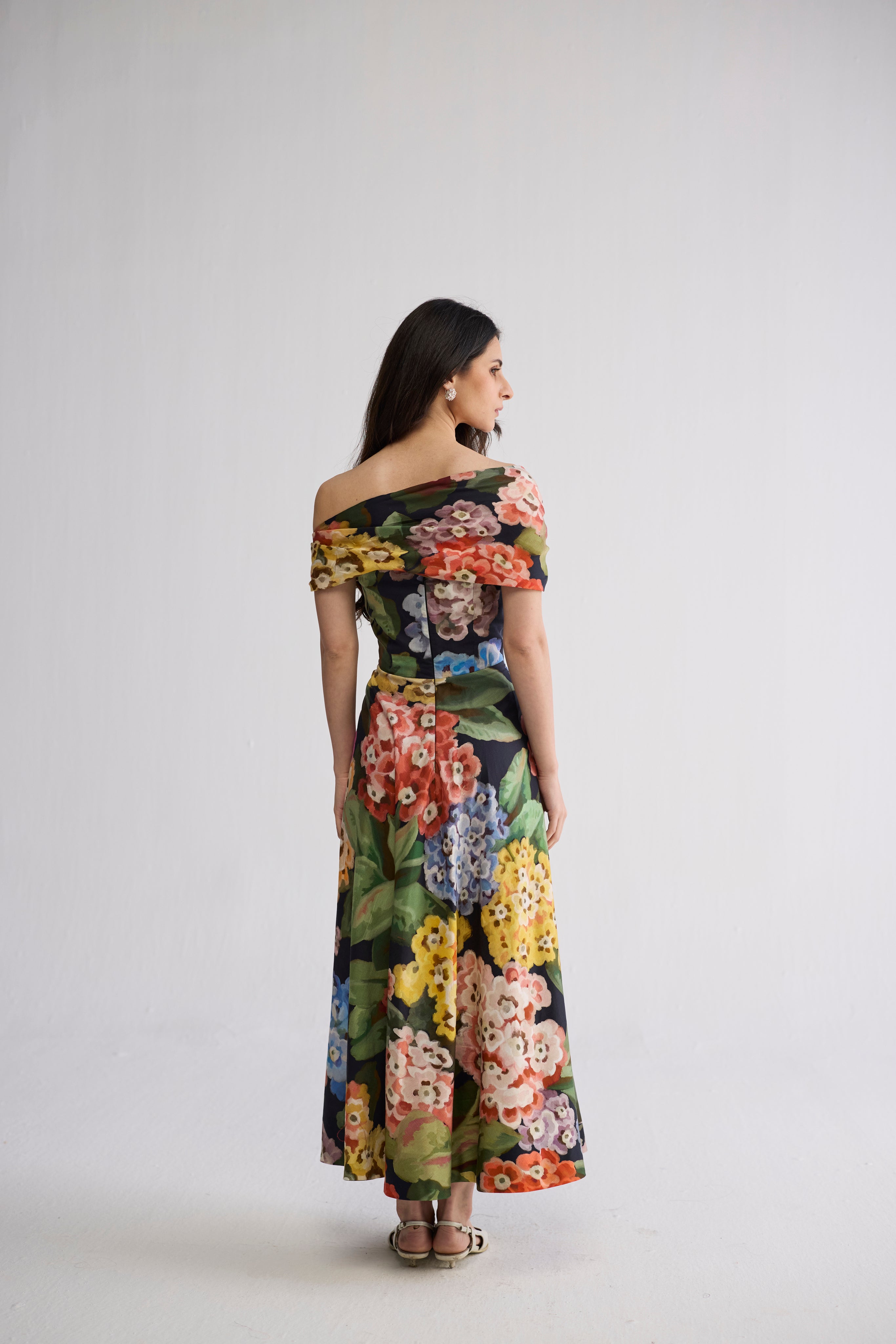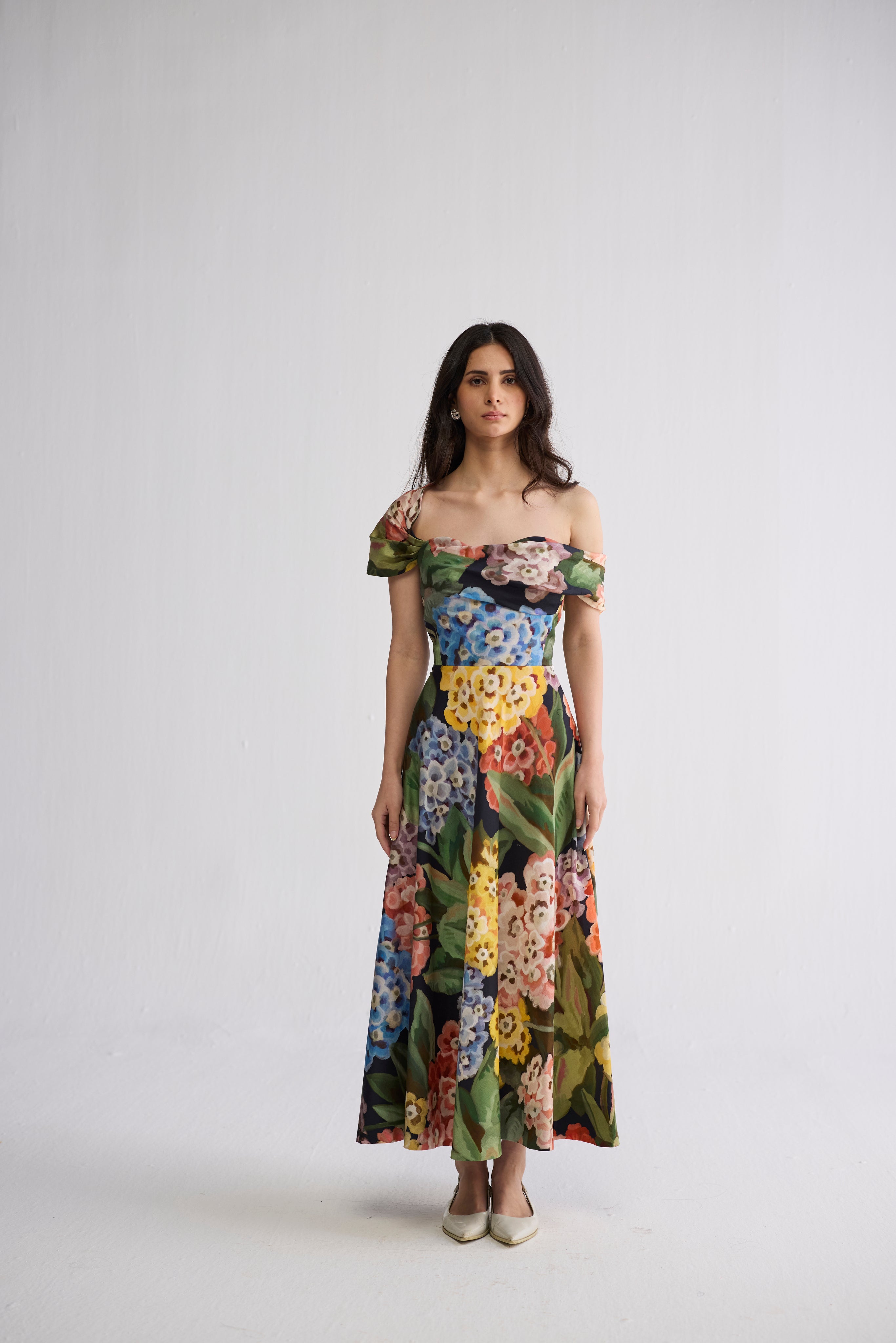 This is an off-shoulder, midi-length A-line silhouette that elegantly skims the body. The fitted bodice highlights the waist, while the skirt flares out gently into a structured A-line shape, creating a flattering and feminine profile. The off-shoulder neckline adds a touch of romantic softness, balancing the structured fall of the skirt. The length sits mid-calf, making it versatile for both day and evening wear.