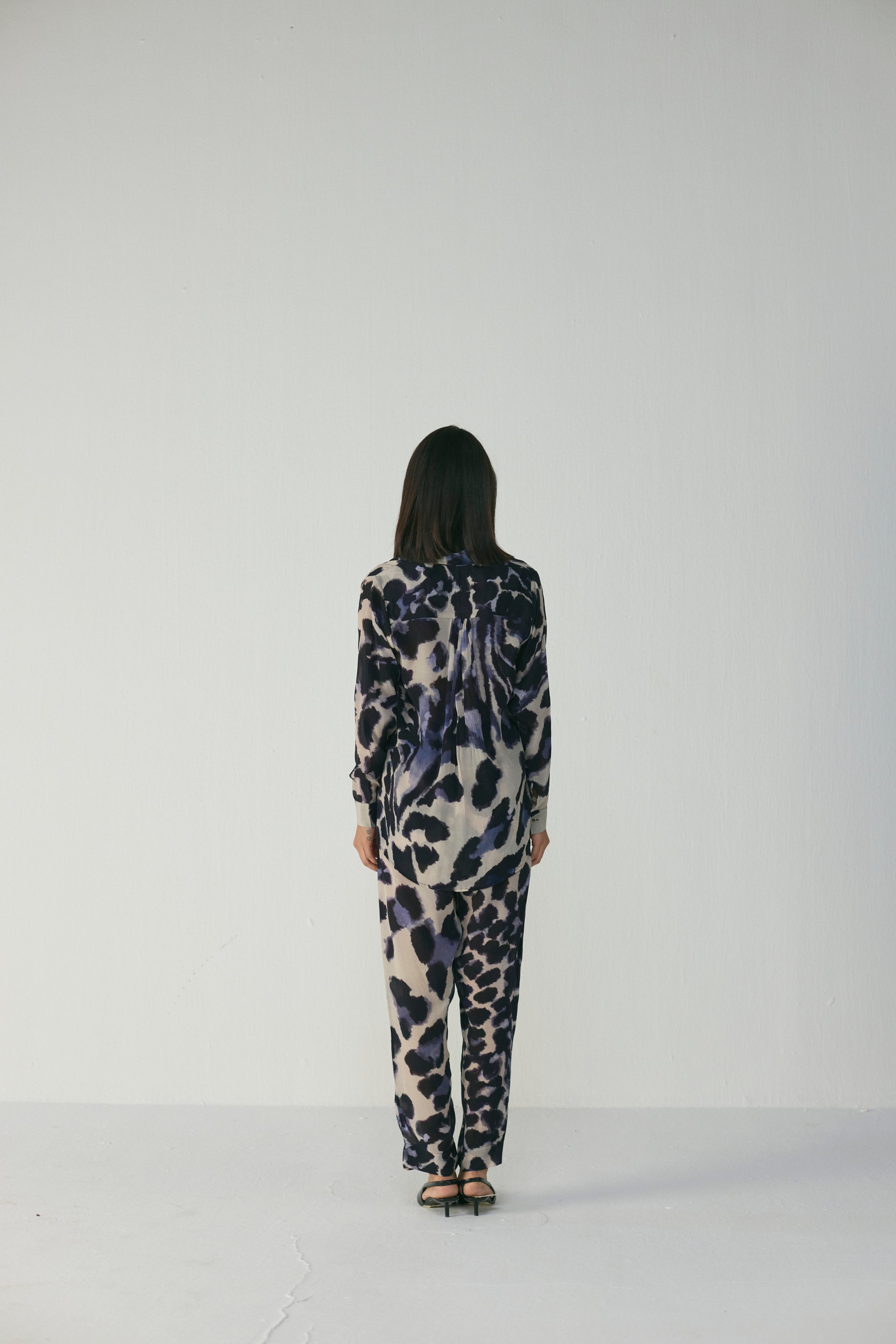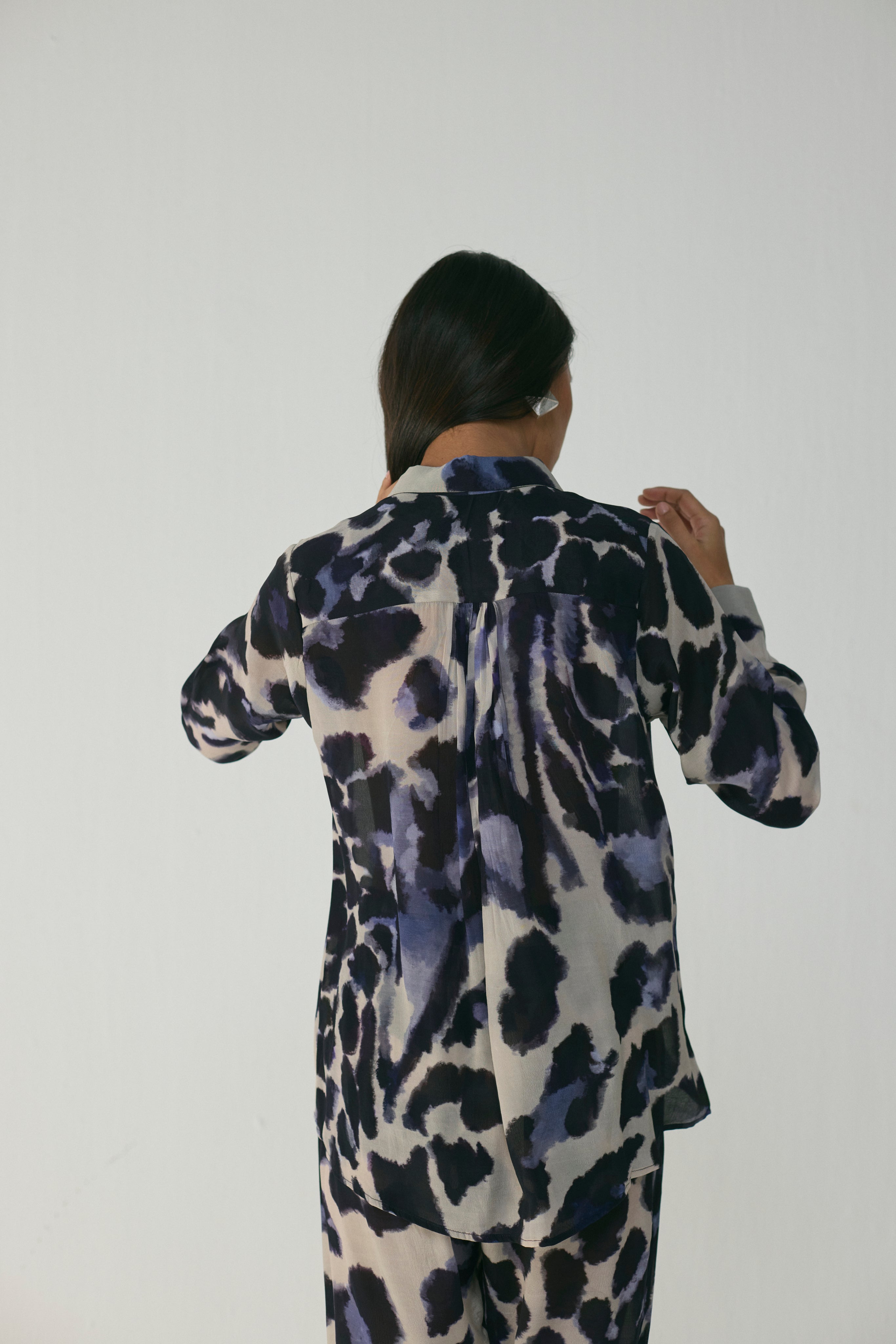 Crafted in luxurious crepe, this chic co-ord set redefines relaxed sophistication. Featuring a button-down shirt and matching straight-fit pants, the set showcases an abstract painterly print in deep navy and ivory tones, bringing a contemporary edge to a timeless silhouette. The soft crepe fabric offers fluidity, comfort, and a graceful drape, making it ideal for both casual elegance and elevated occasions.