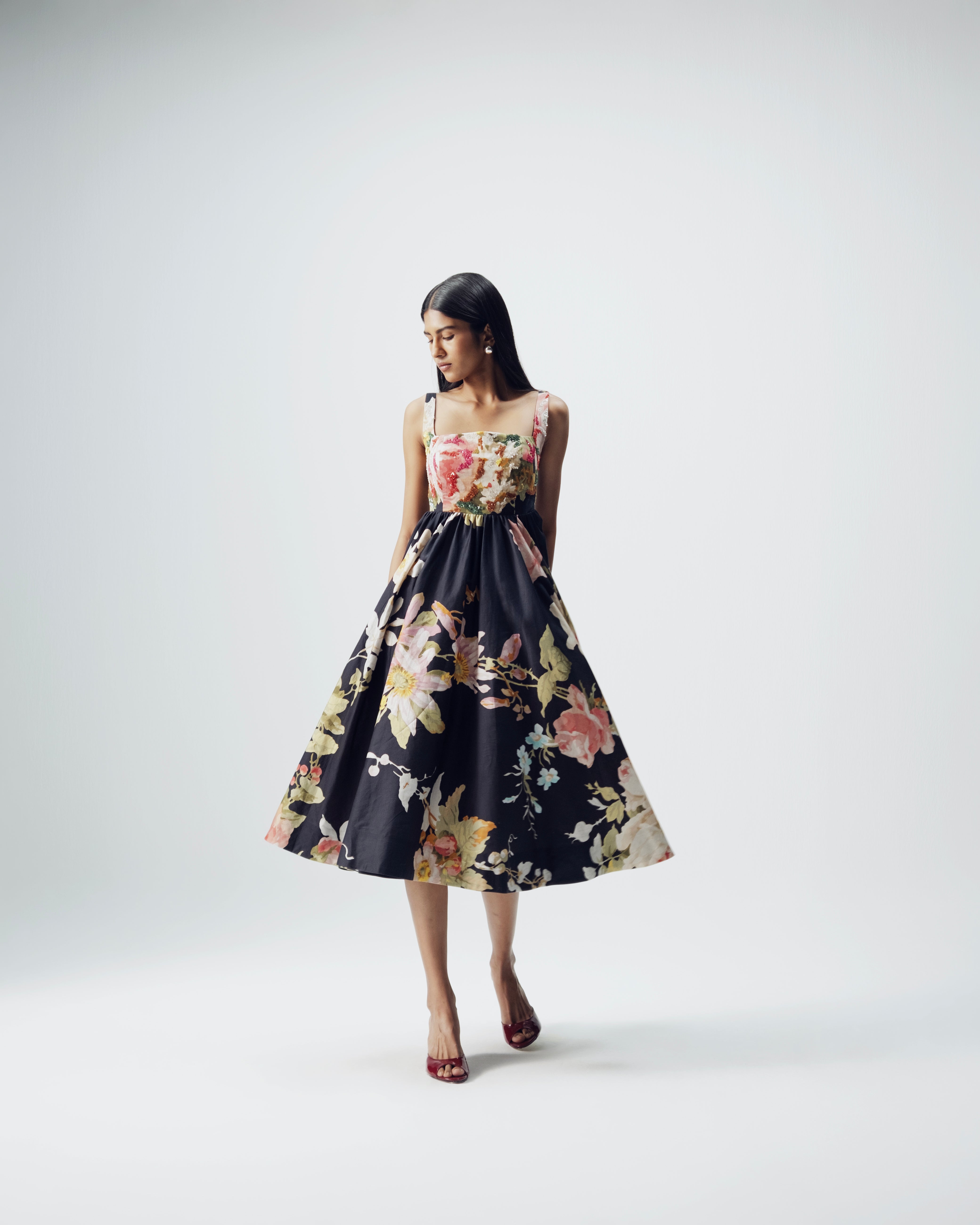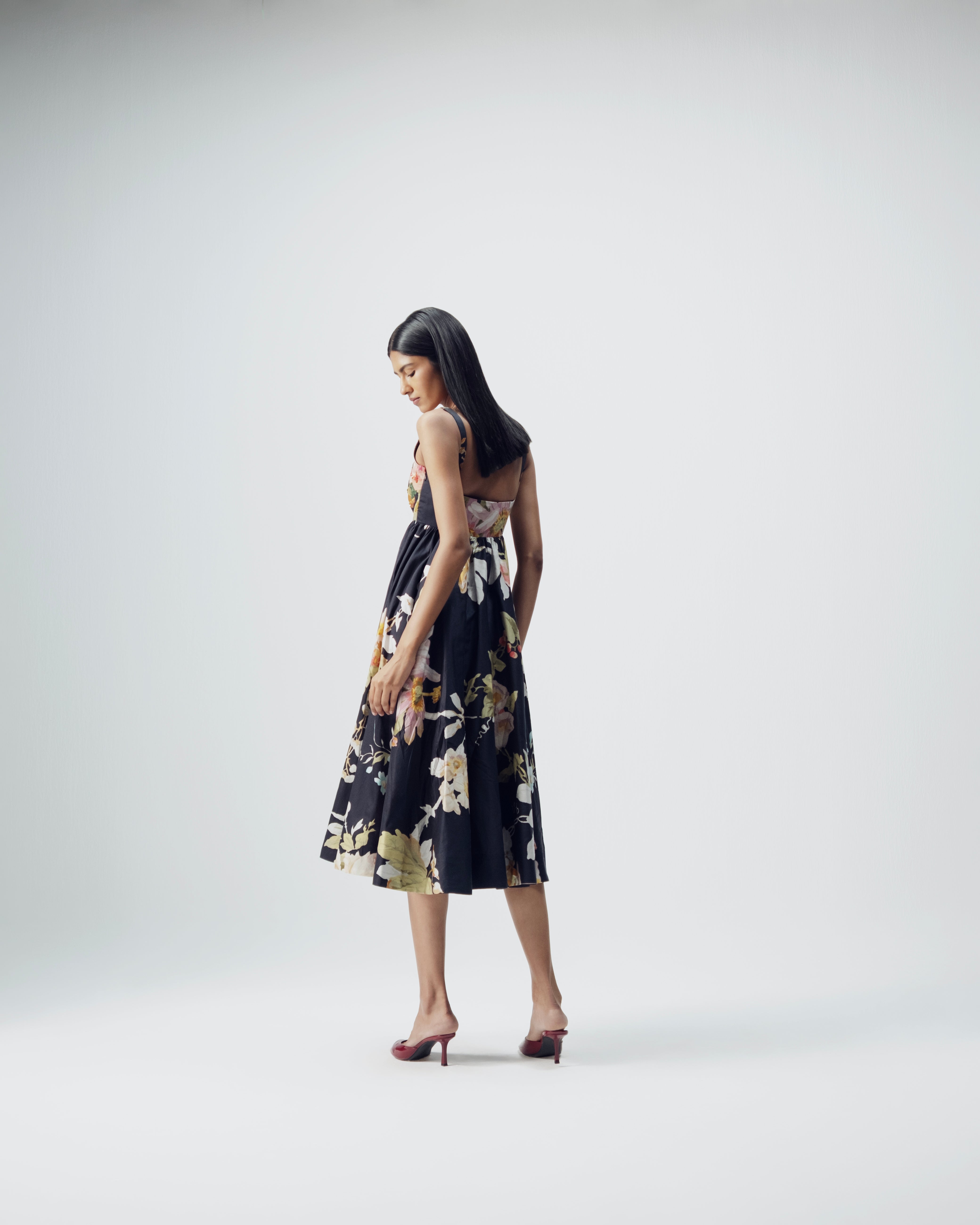 Step into effortless elegance with this flared Dress, featuring a romantic floral print that blends soft blush, coral, and ivory tones against a deep, inky backdrop. Designed with slim shoulder straps and a structured bodice, this dress gracefully flows into a full, gathered midi skirt that moves beautifully with every step. The silhouette is feminine, flattering, and refined—ideal for daytime events, garden parties, or an elevated evening out.
