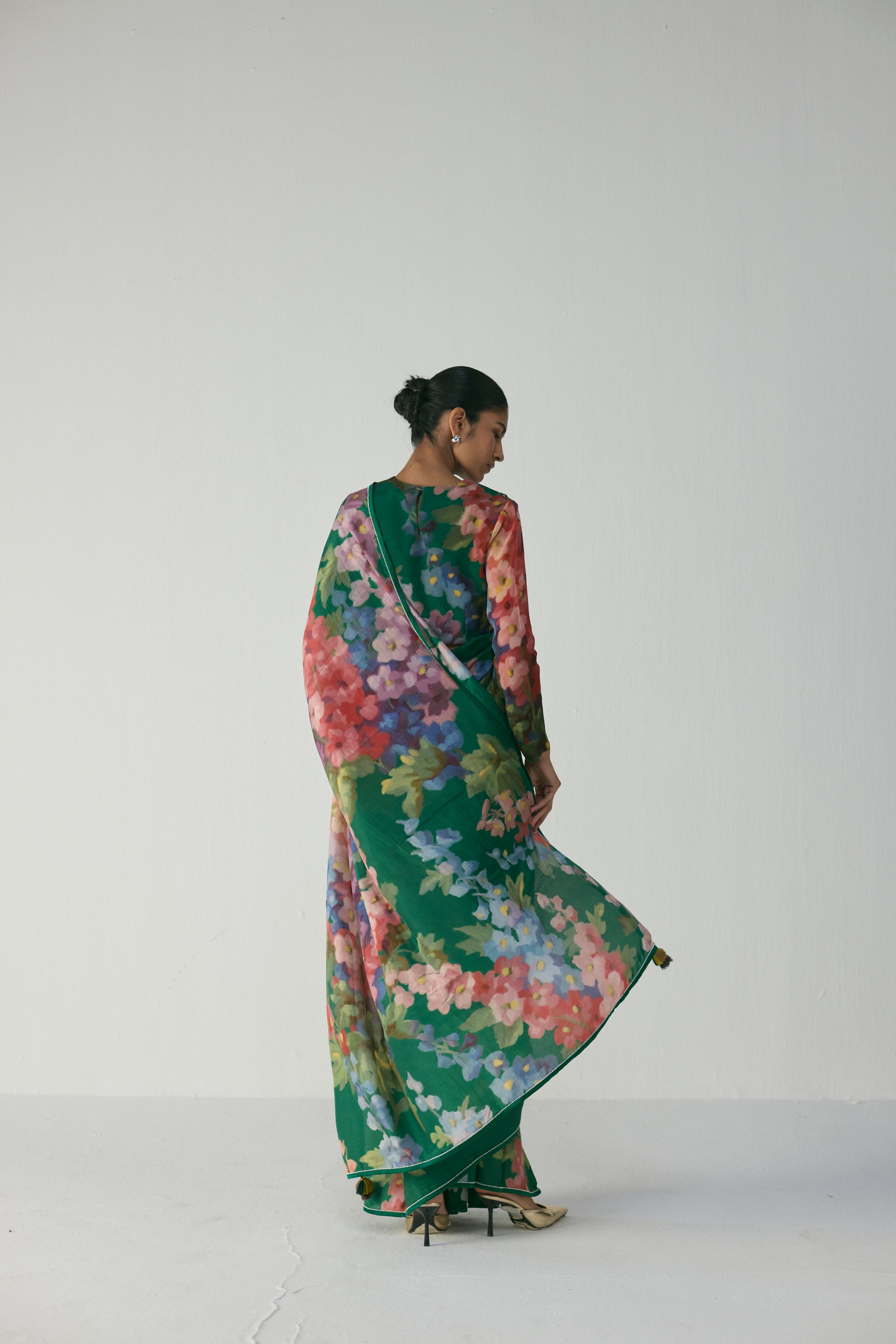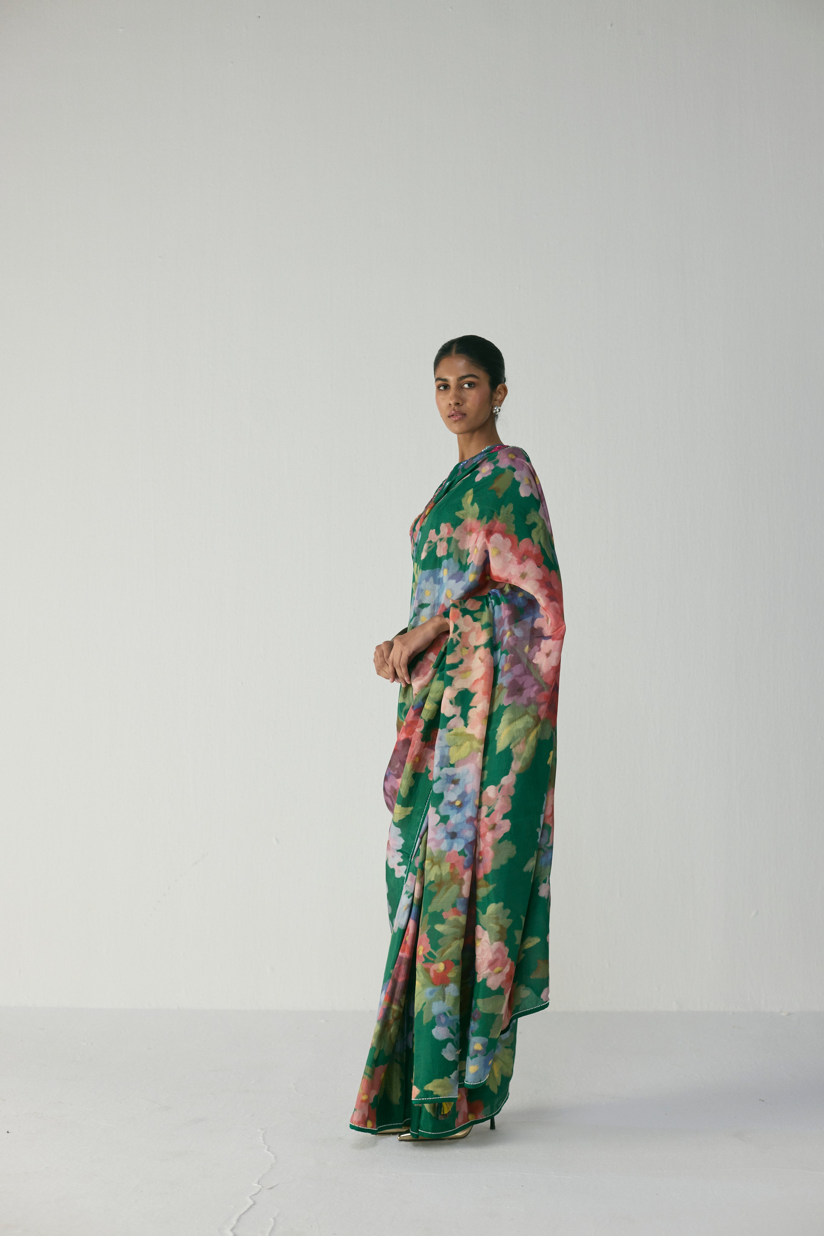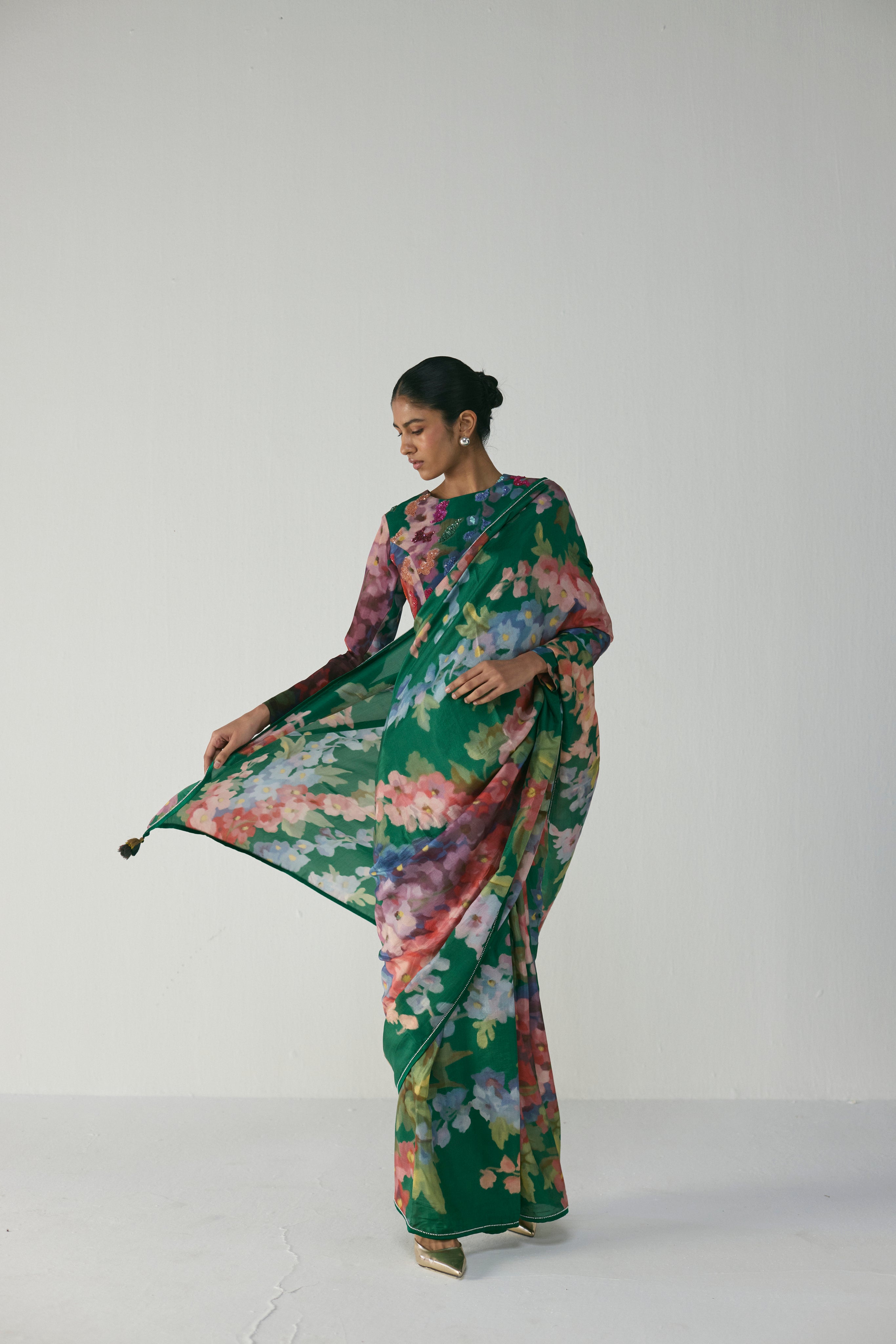 This exquisite saree is crafted in luxurious silk, featuring a lush painterly floral print in vibrant hues of green, pink, lilac, and amber. The print evokes a sense of romantic nostalgia, seamlessly blending nature-inspired artistry with contemporary elegance.