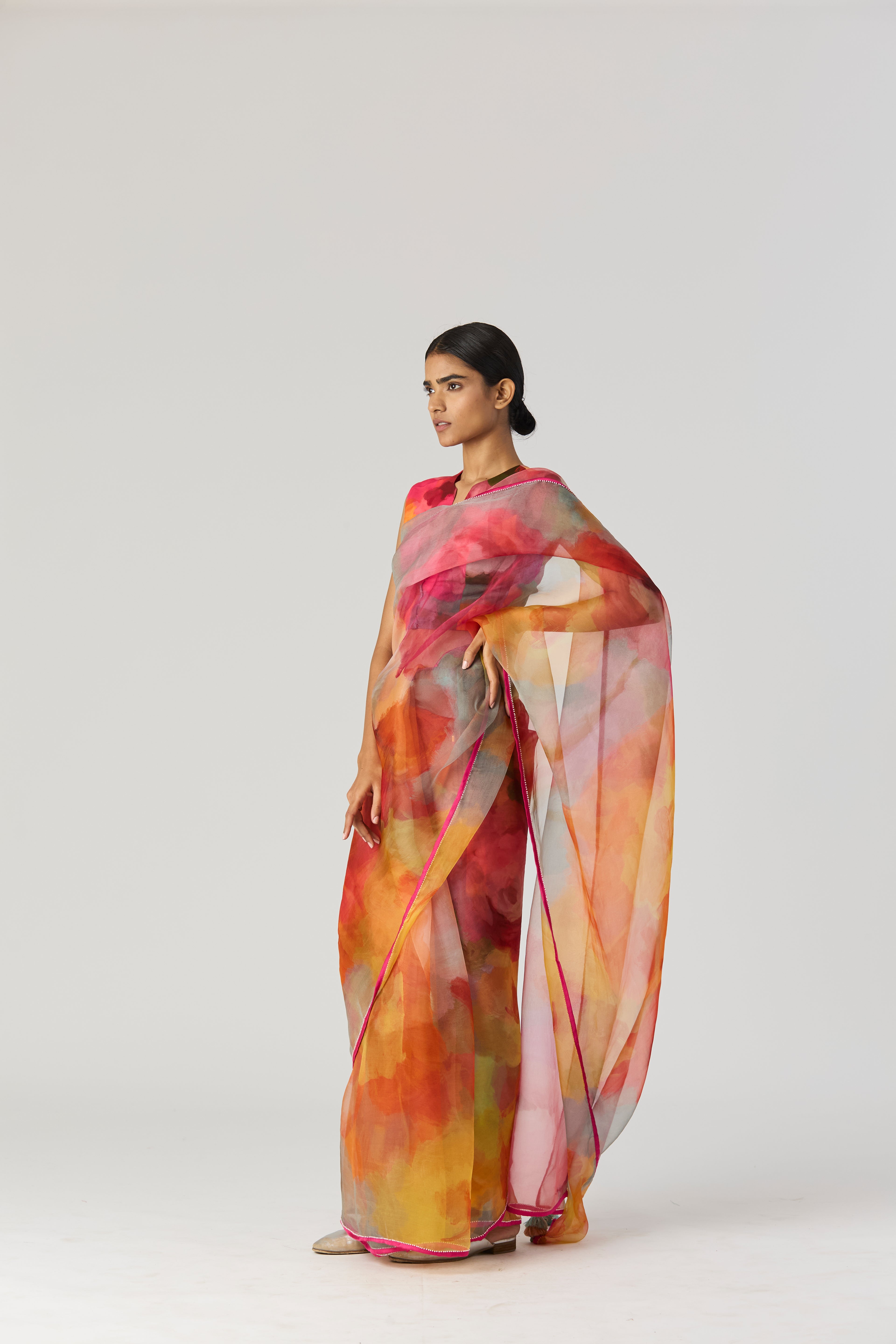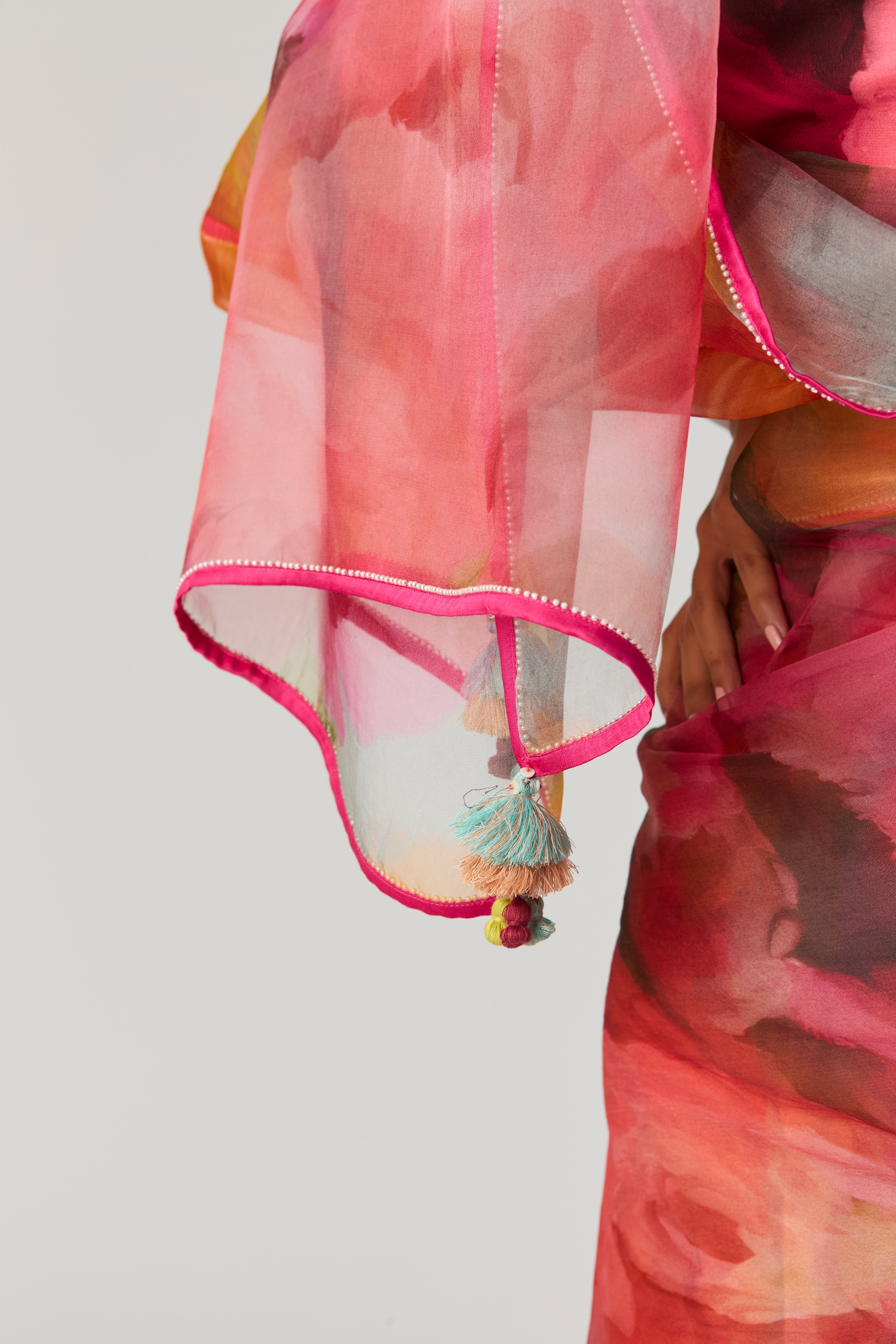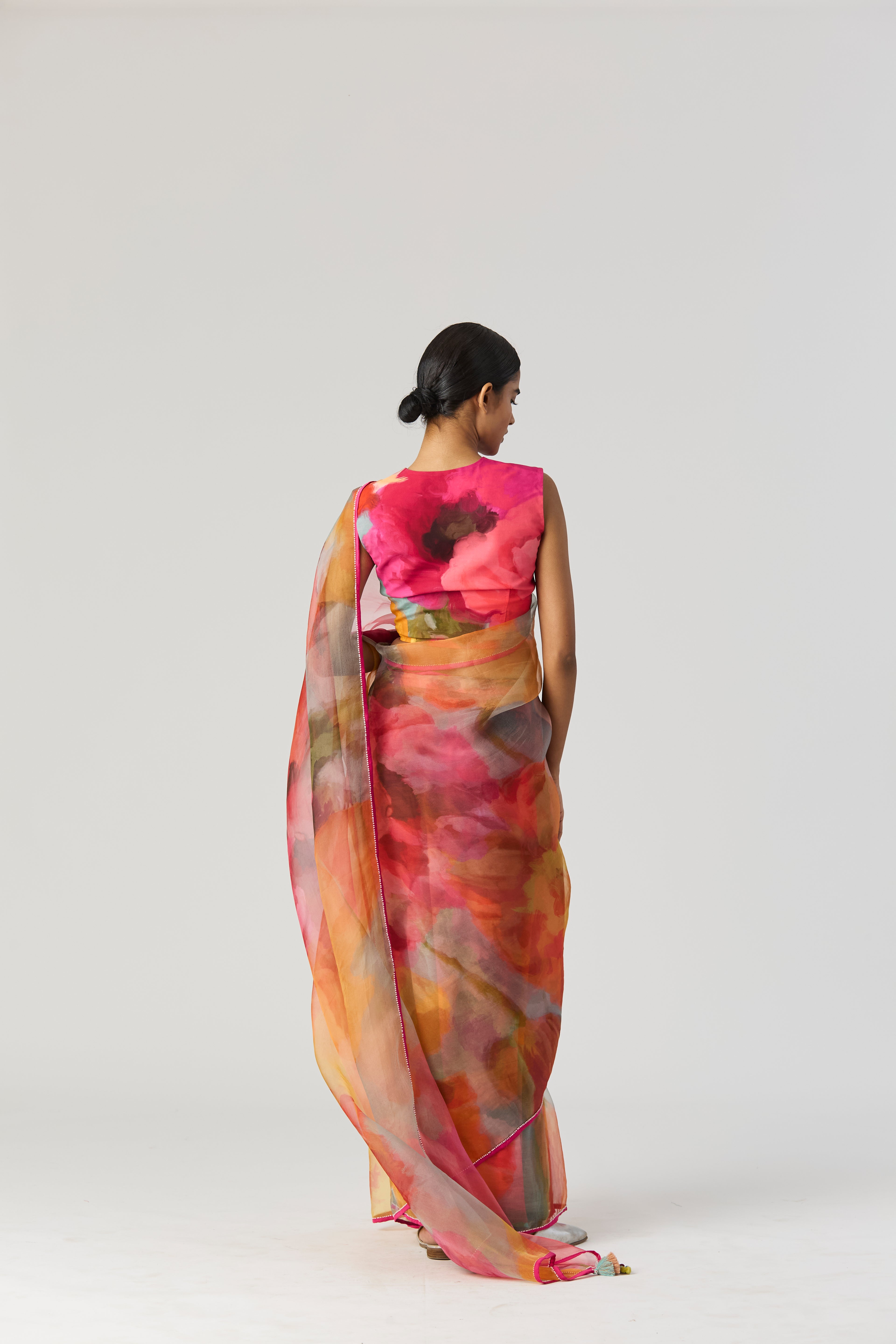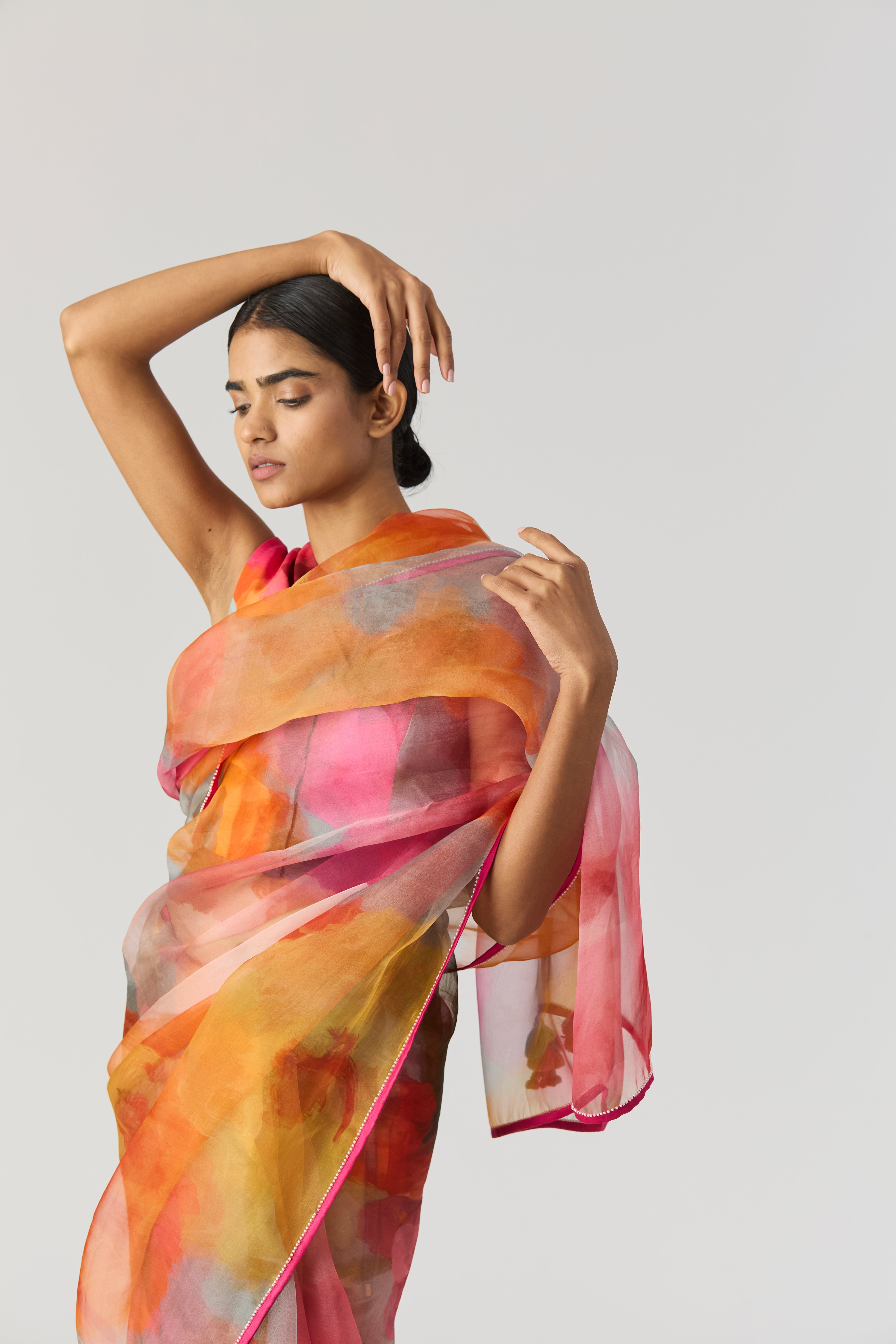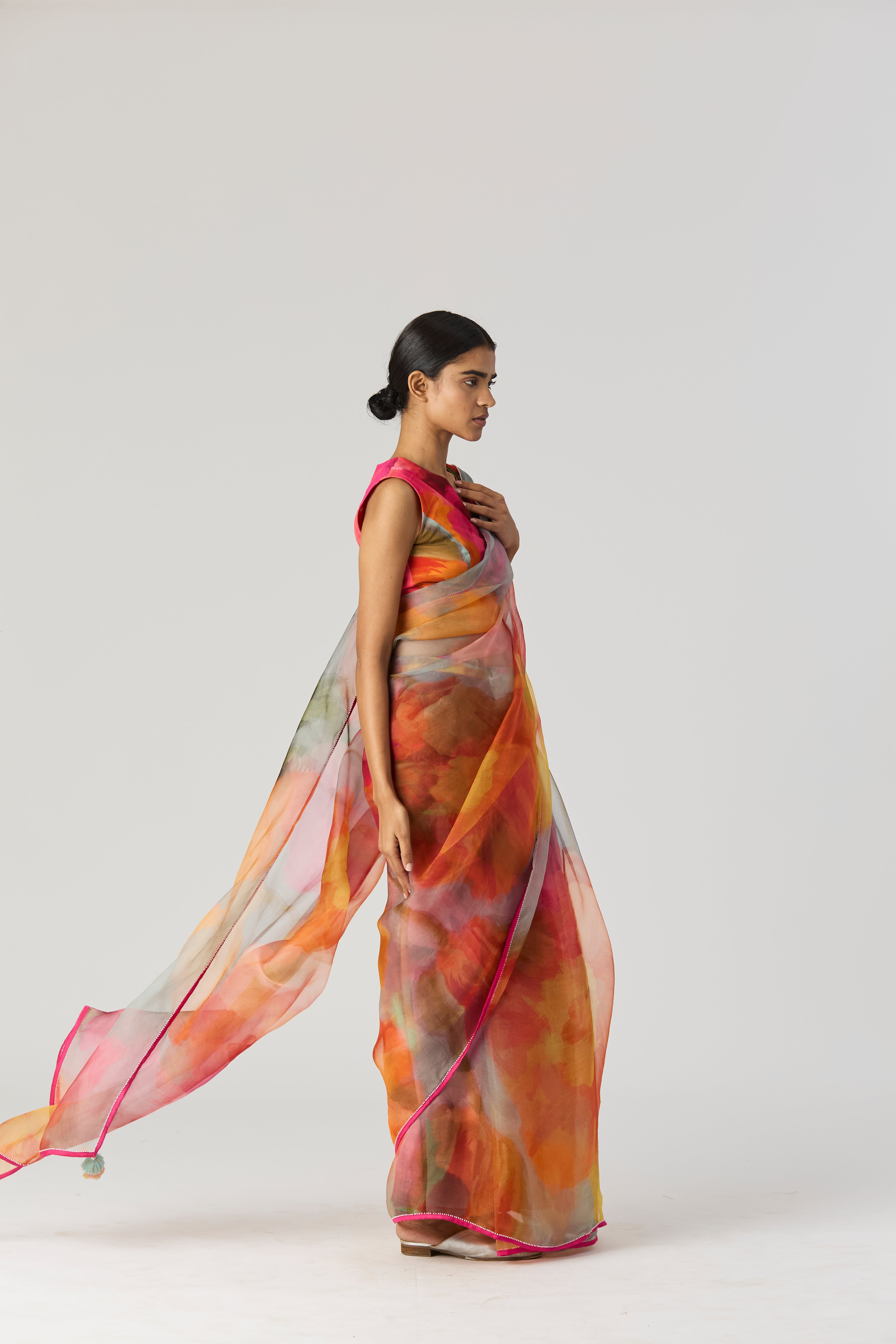 The veronica saree is printed on pure silk organza . It is finished with a delicate Dori piping all around in a rani pink color. The pallu has a tassel detail.