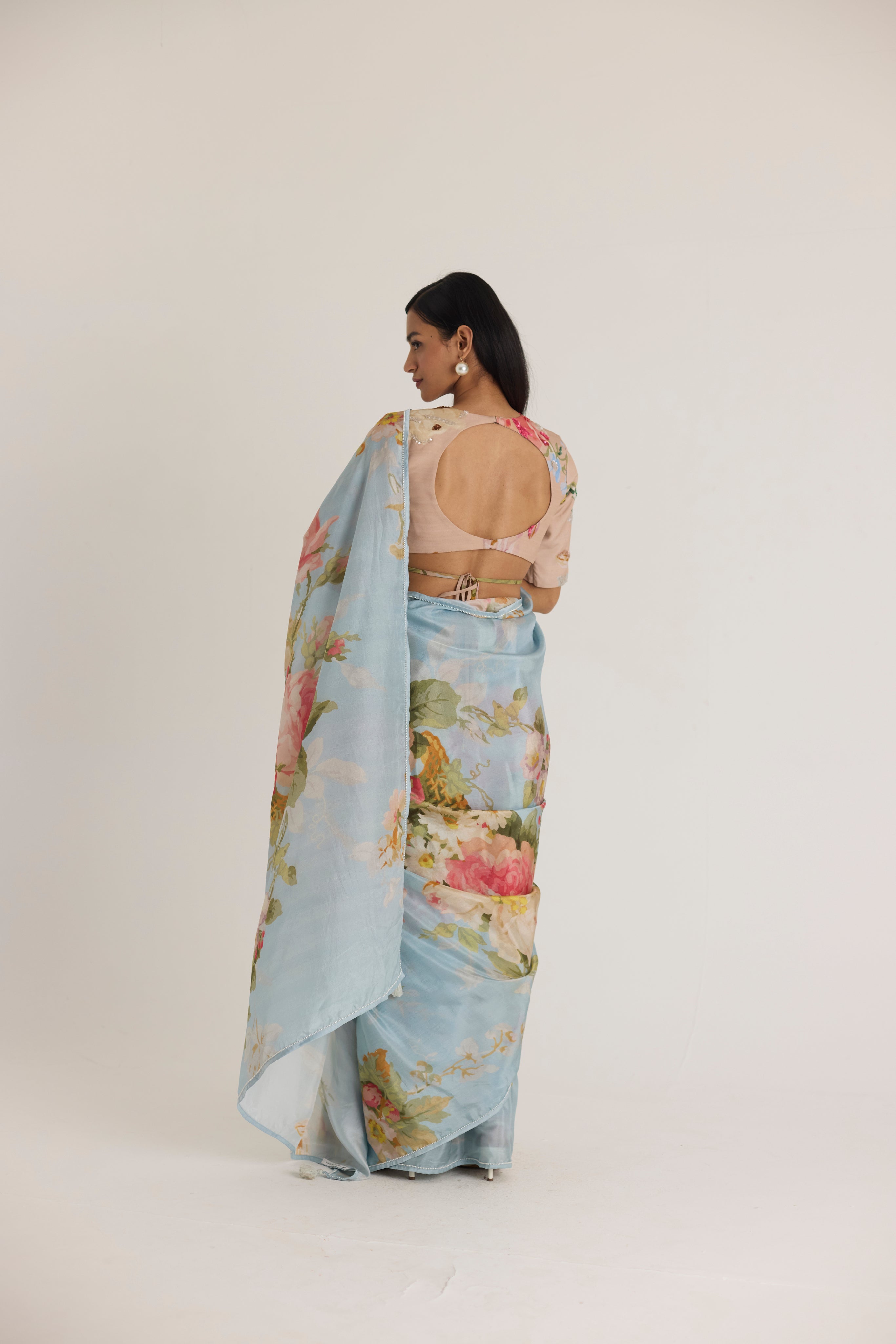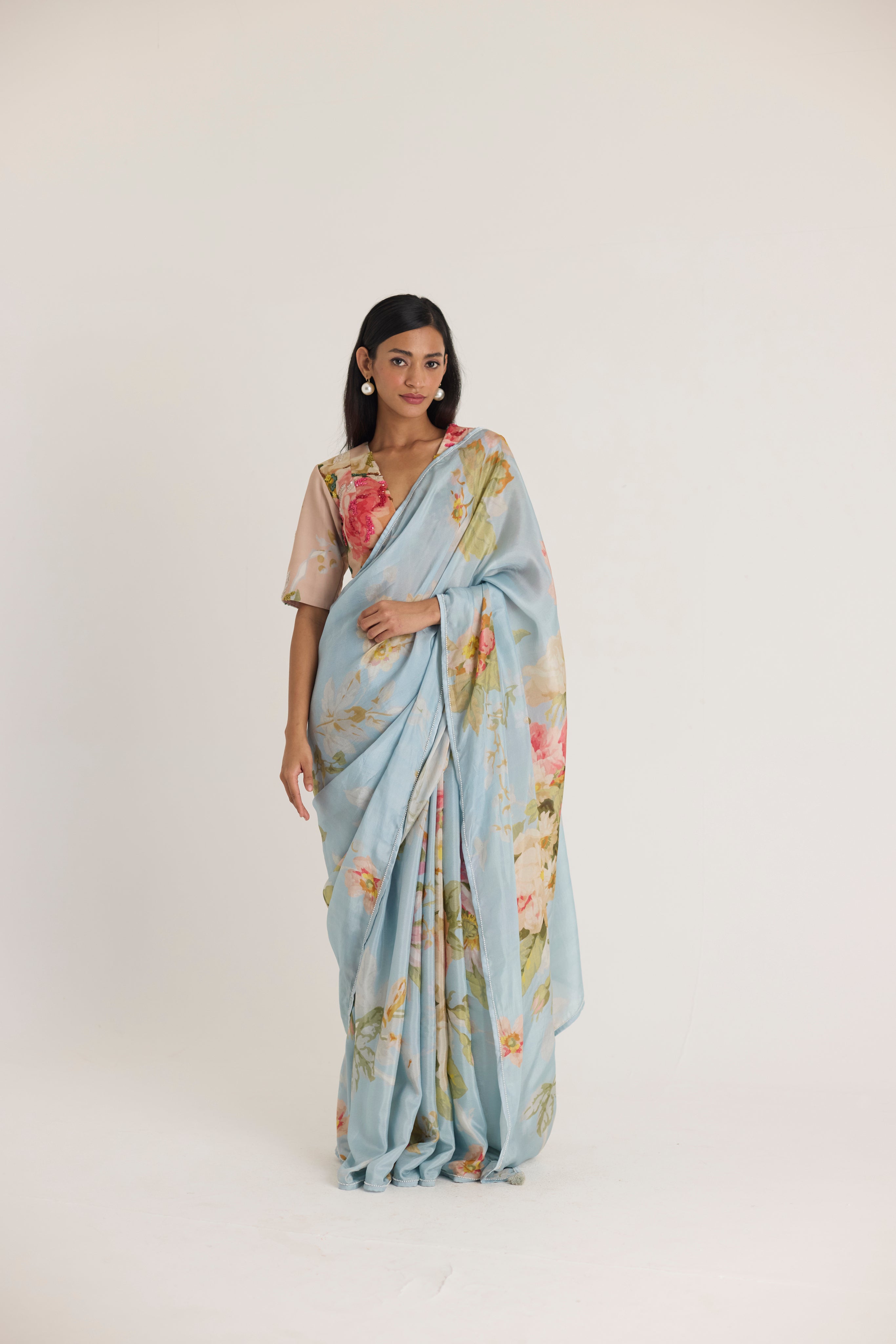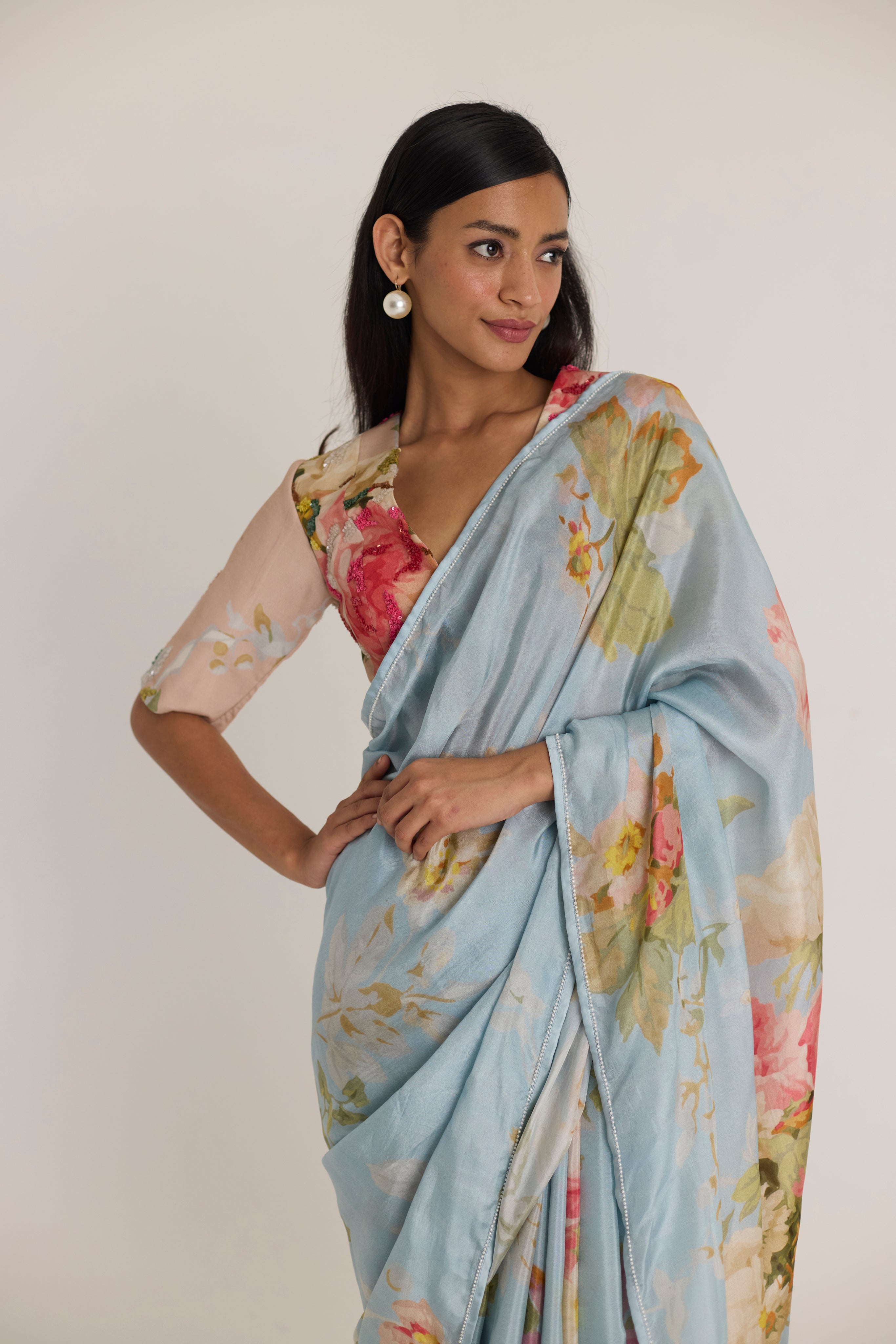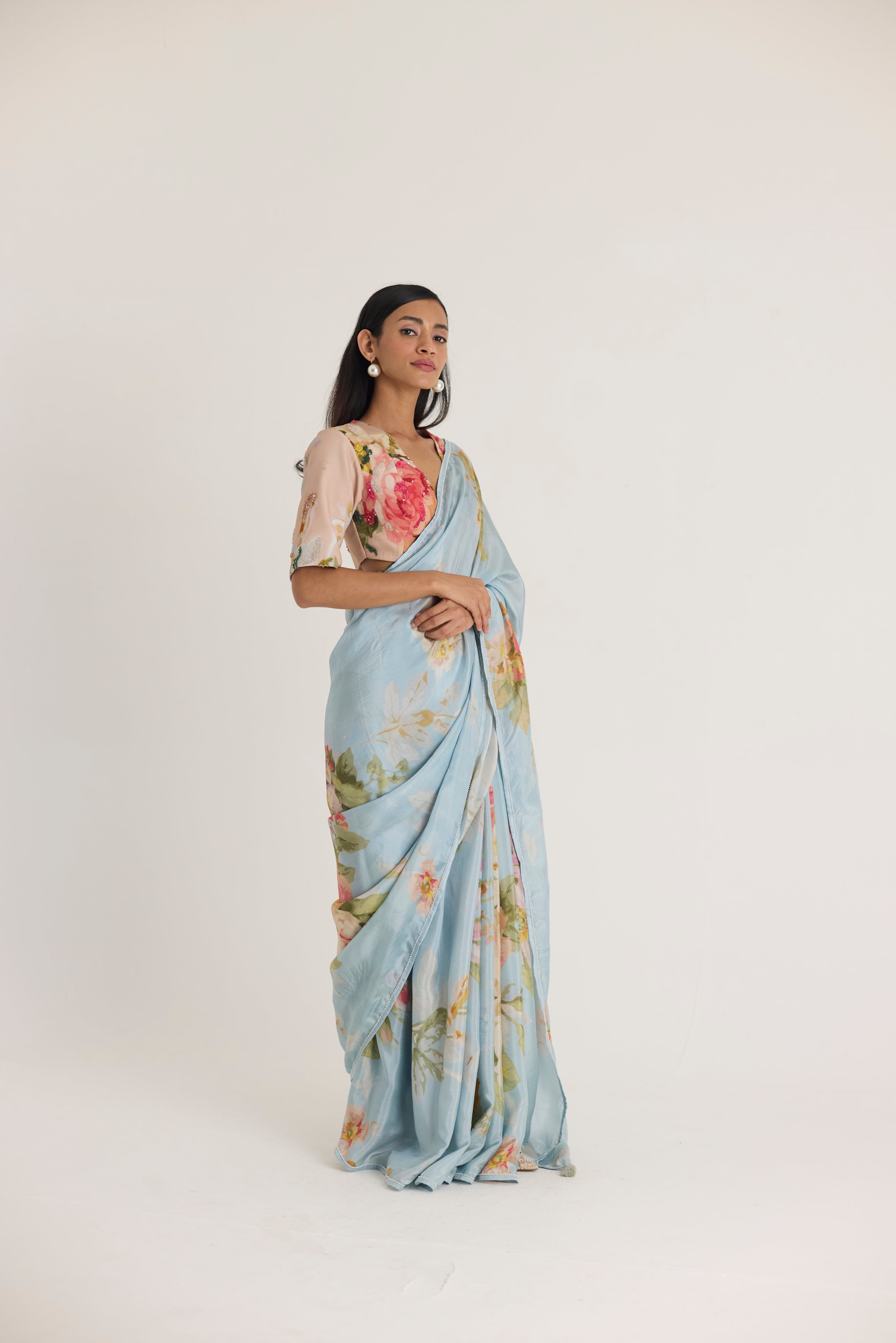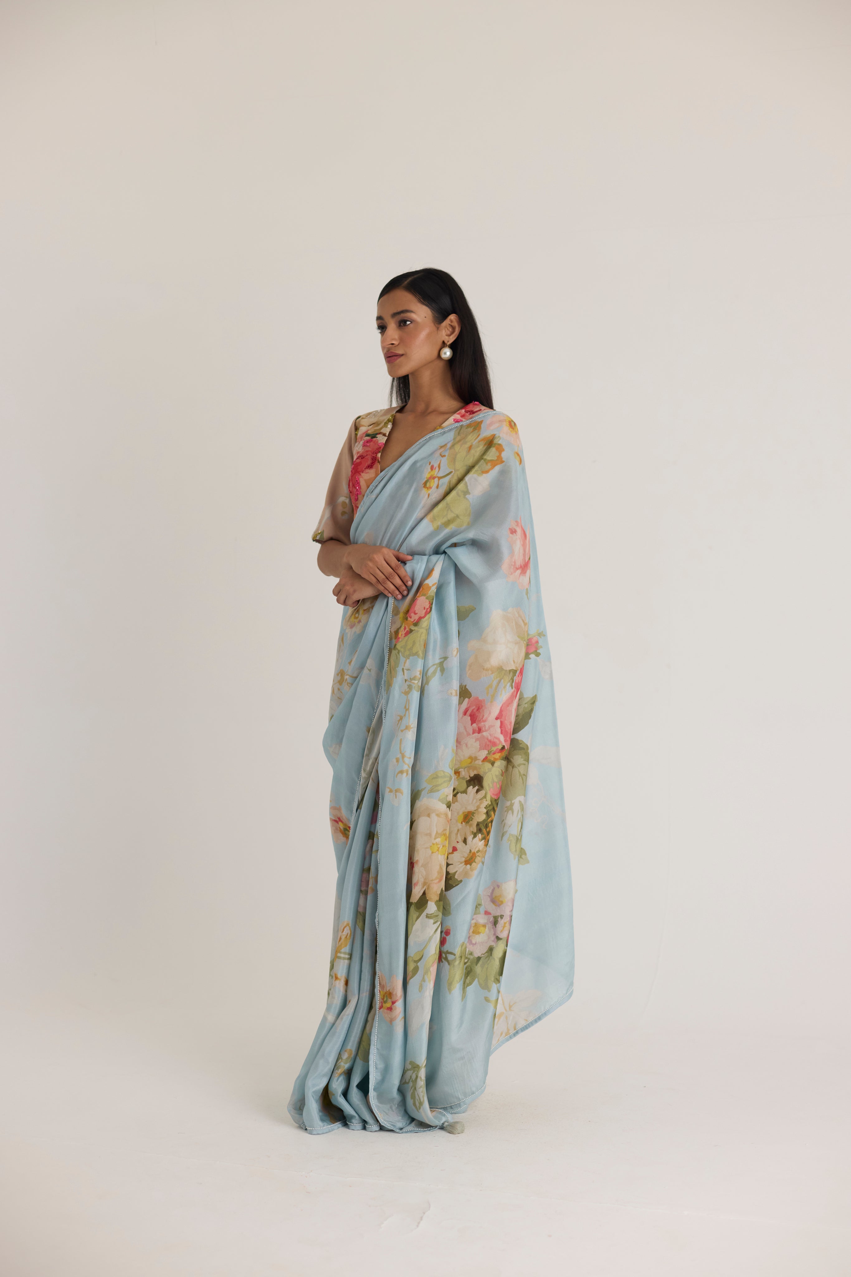 Draped in soft pastel hues, this exquisite saree showcases a delicate floral print on a serene sky-blue base. The painterly blooms in soft pinks, greens, and muted tones evoke a dreamy, romantic aesthetic. Crafted from lightweight, flowy fabric, the saree offers effortless grace and movement, making it perfect for both daytime and evening occasions.