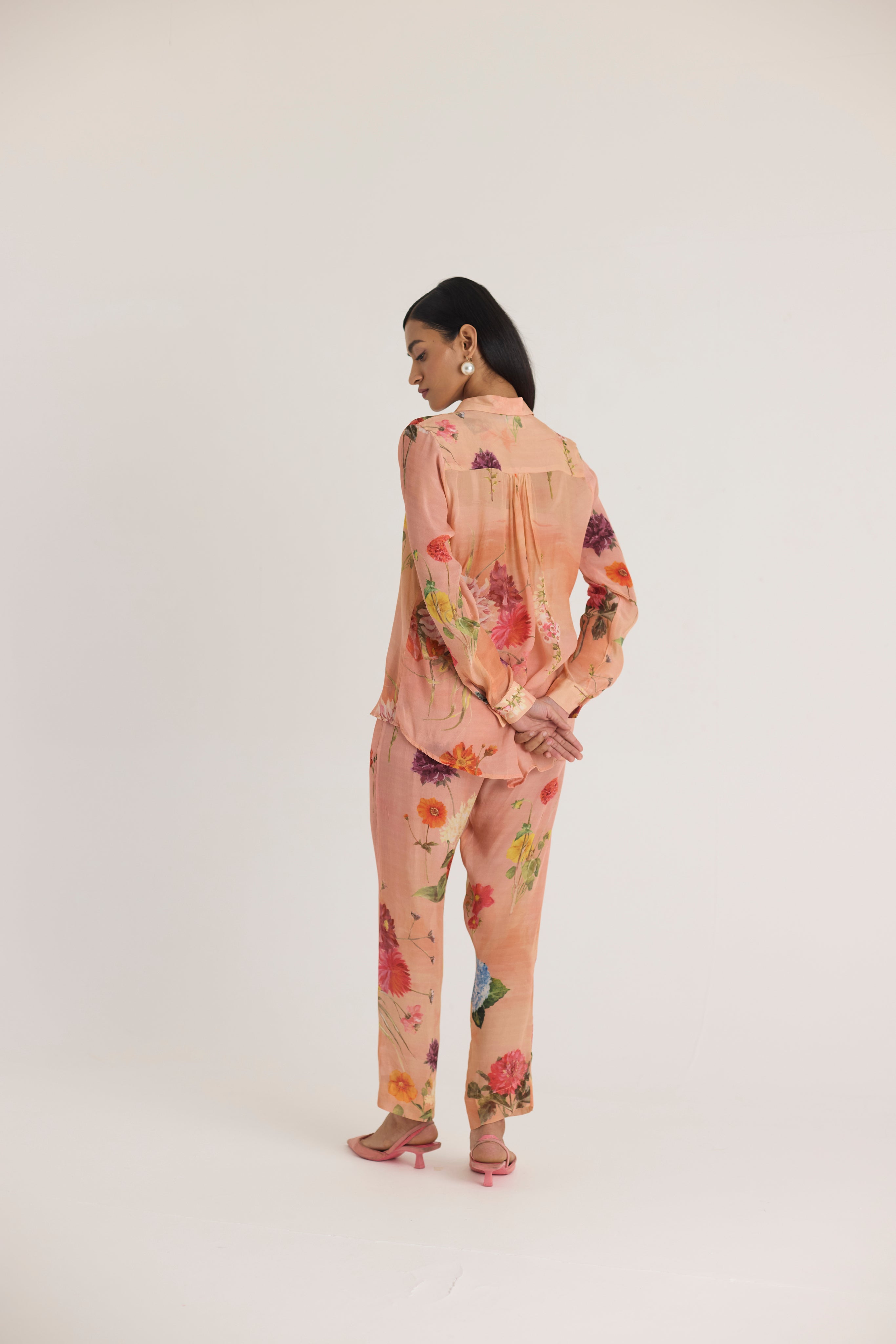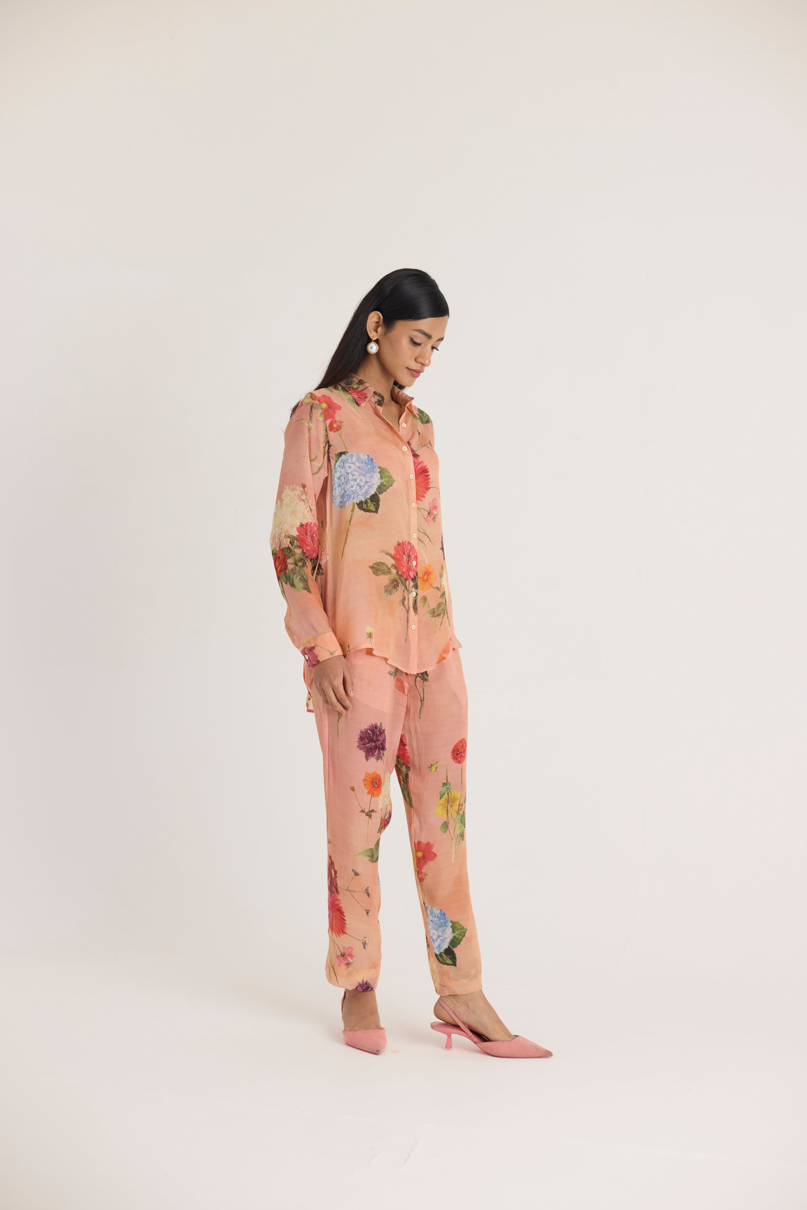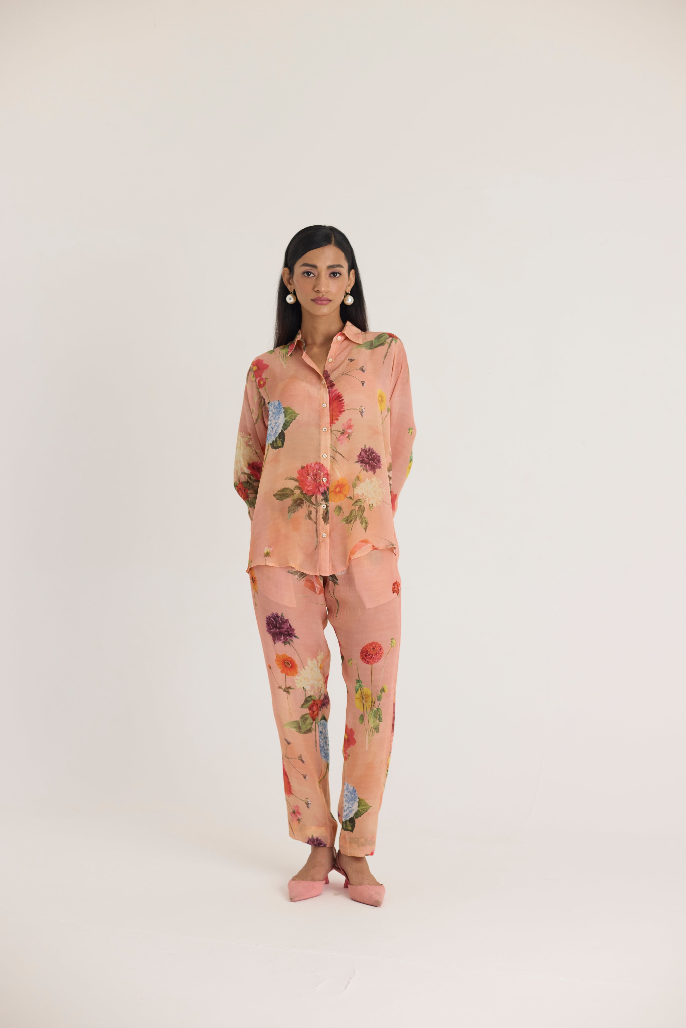 Pair this floral set with minimal pearl or gold jewelry and neutral-toned footwear for an effortlessly graceful look.