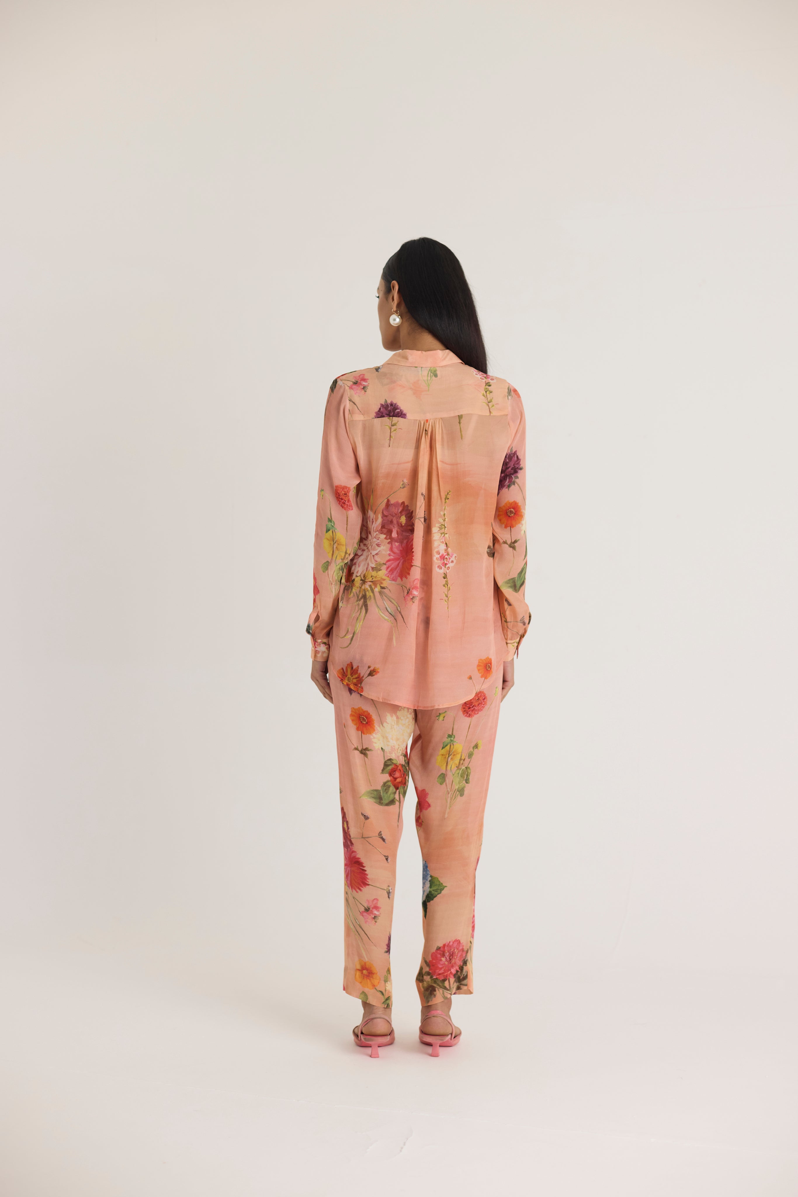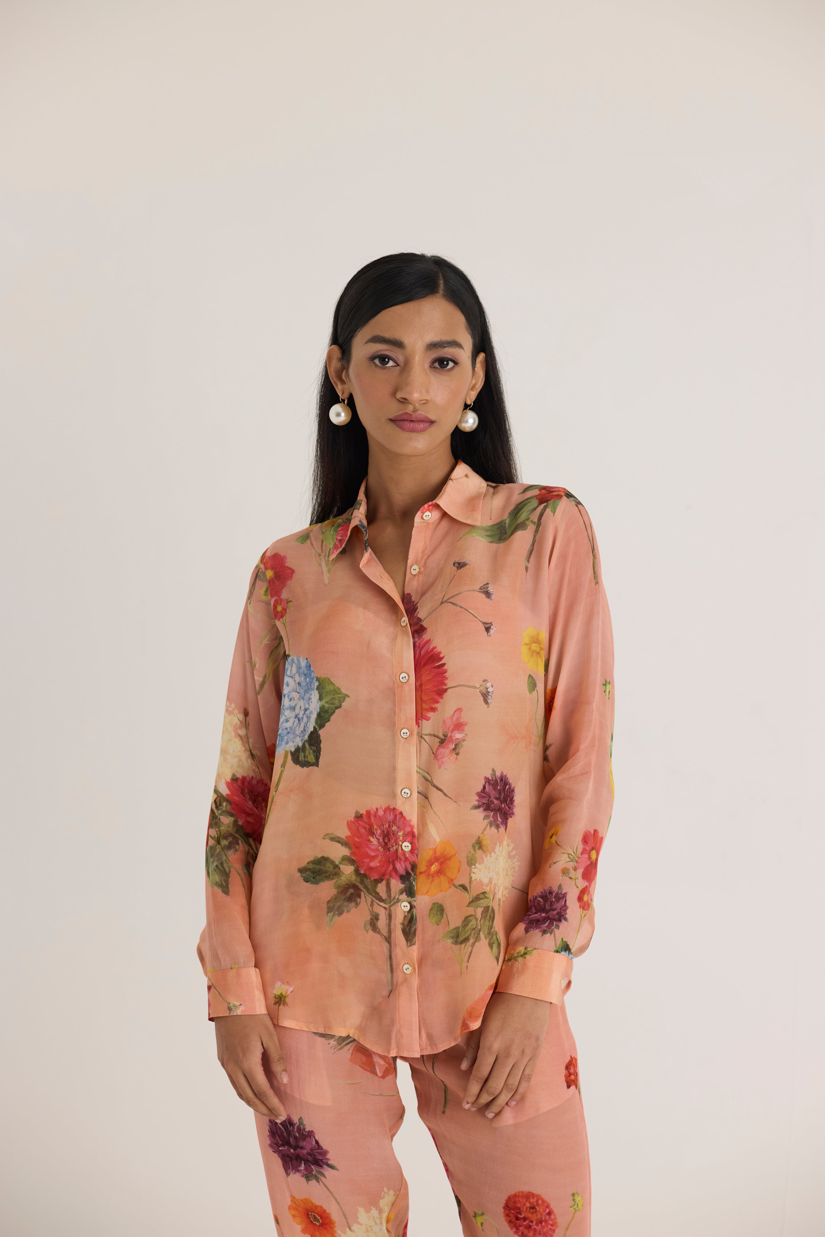 Elevate your wardrobe with this effortlessly chic floral-printed ensemble, exuding timeless elegance. The warm peach-toned base is adorned with an exquisite botanical print featuring an array of delicate blossoms in vibrant hues. This soft yet striking design captures the essence of a serene garden, making it perfect for both daytime sophistication and evening charm.