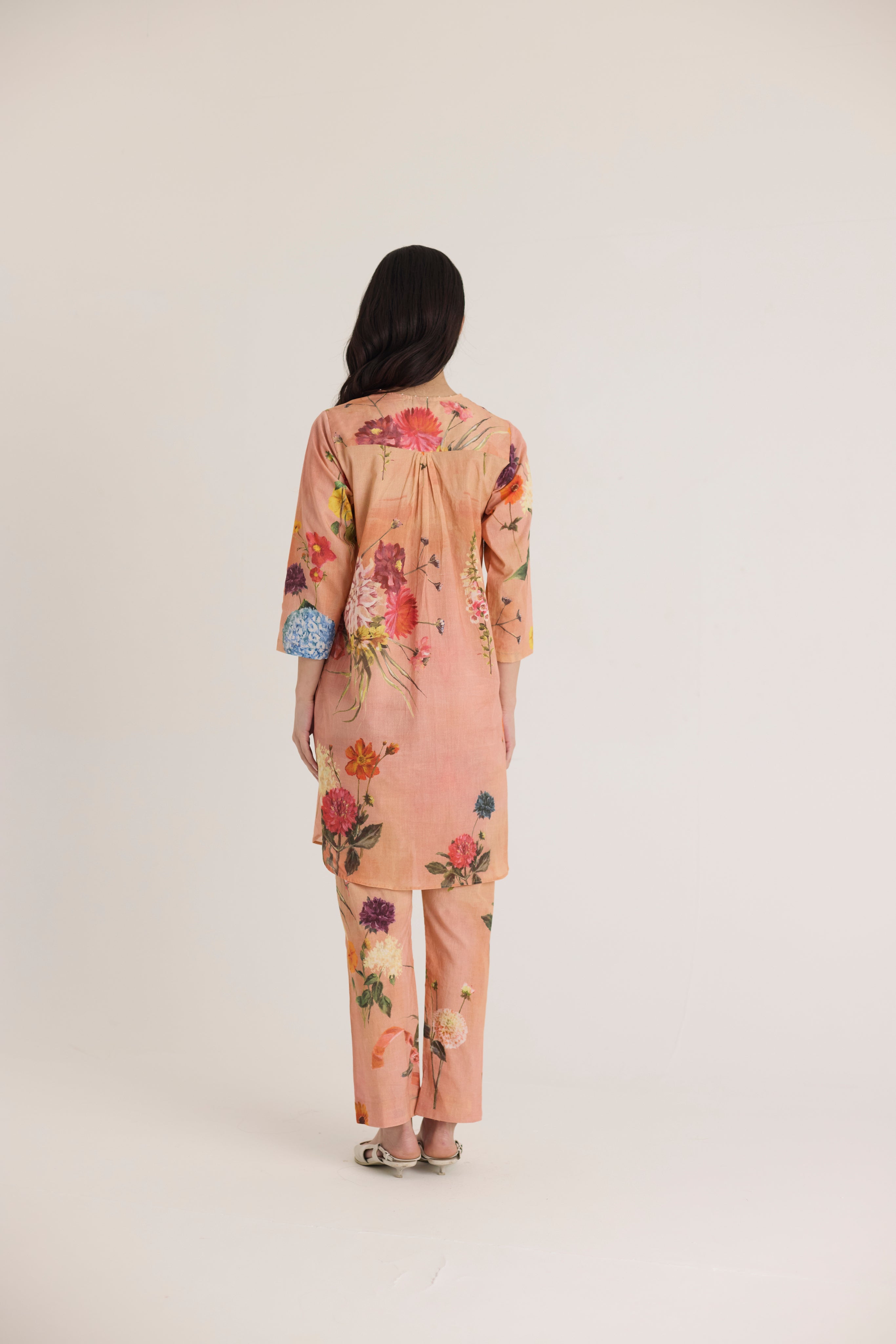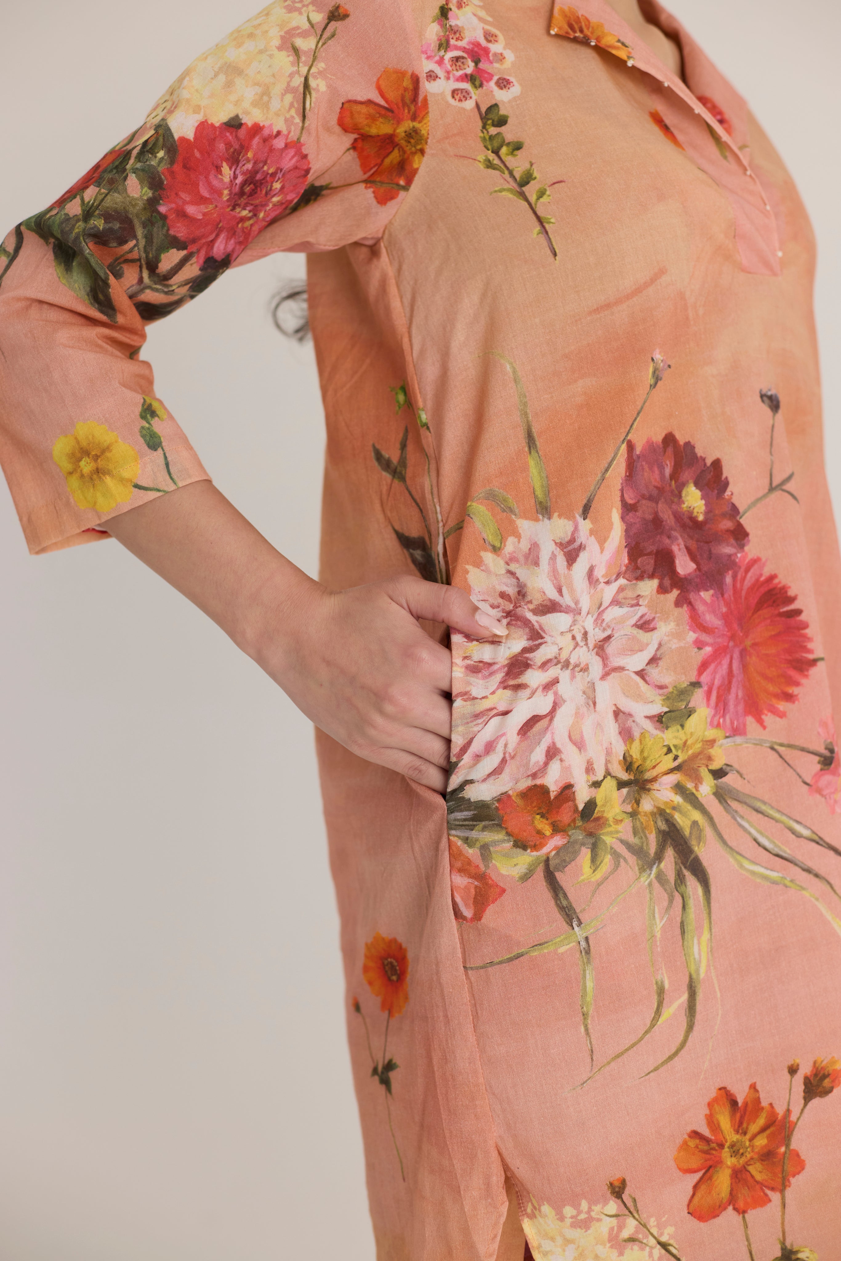 Elevate your everyday wardrobe with this elegant peach-hued floral ensemble, featuring a flowy, straight-cut kurta with matching trousers. The digitally printed botanical motifs in vibrant shades of pink, red, and yellow exude a fresh, summery charm. Made from a lightweight, breathable fabric, this set ensures all-day comfort while maintaining a refined aesthetic.