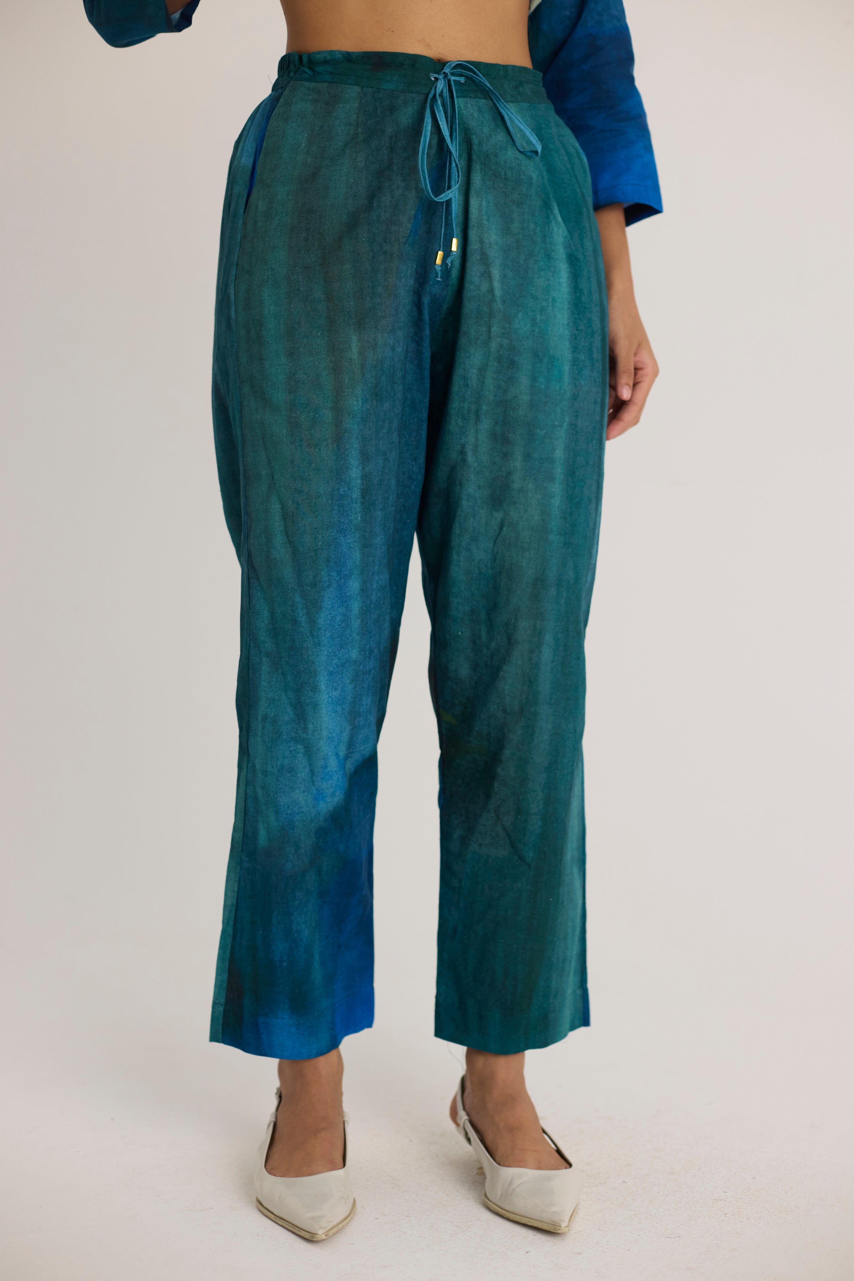 A sophisticated kurta set featuring a mesmerizing deep teal base, reminiscent of watercolor brushstrokes. The highlight of the design is a striking, oversized floral print of a golden dahlia, adding a bold yet elegant touch. The relaxed silhouette, round neckline, and delicate buttoned placket enhance the effortless charm of this piece.