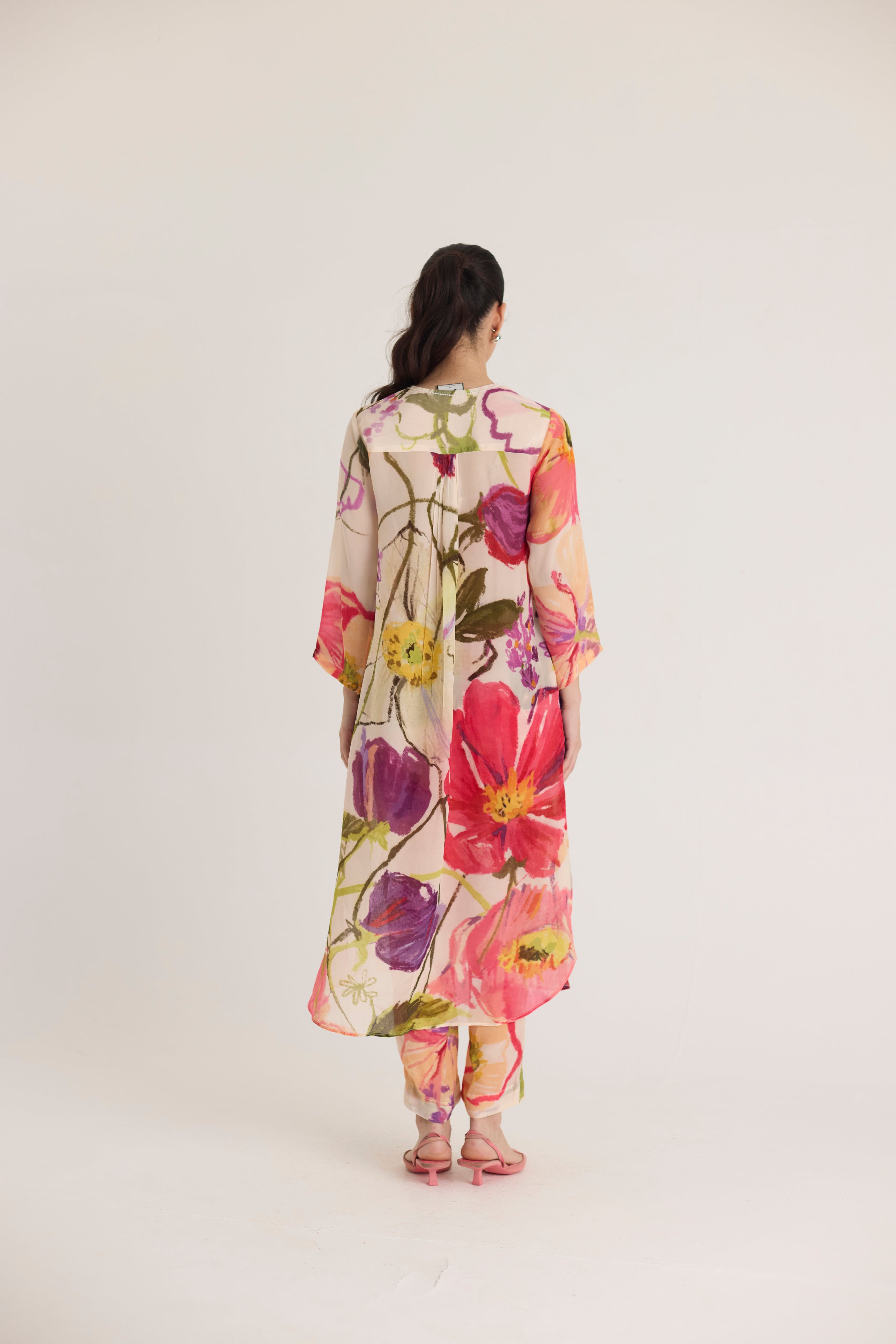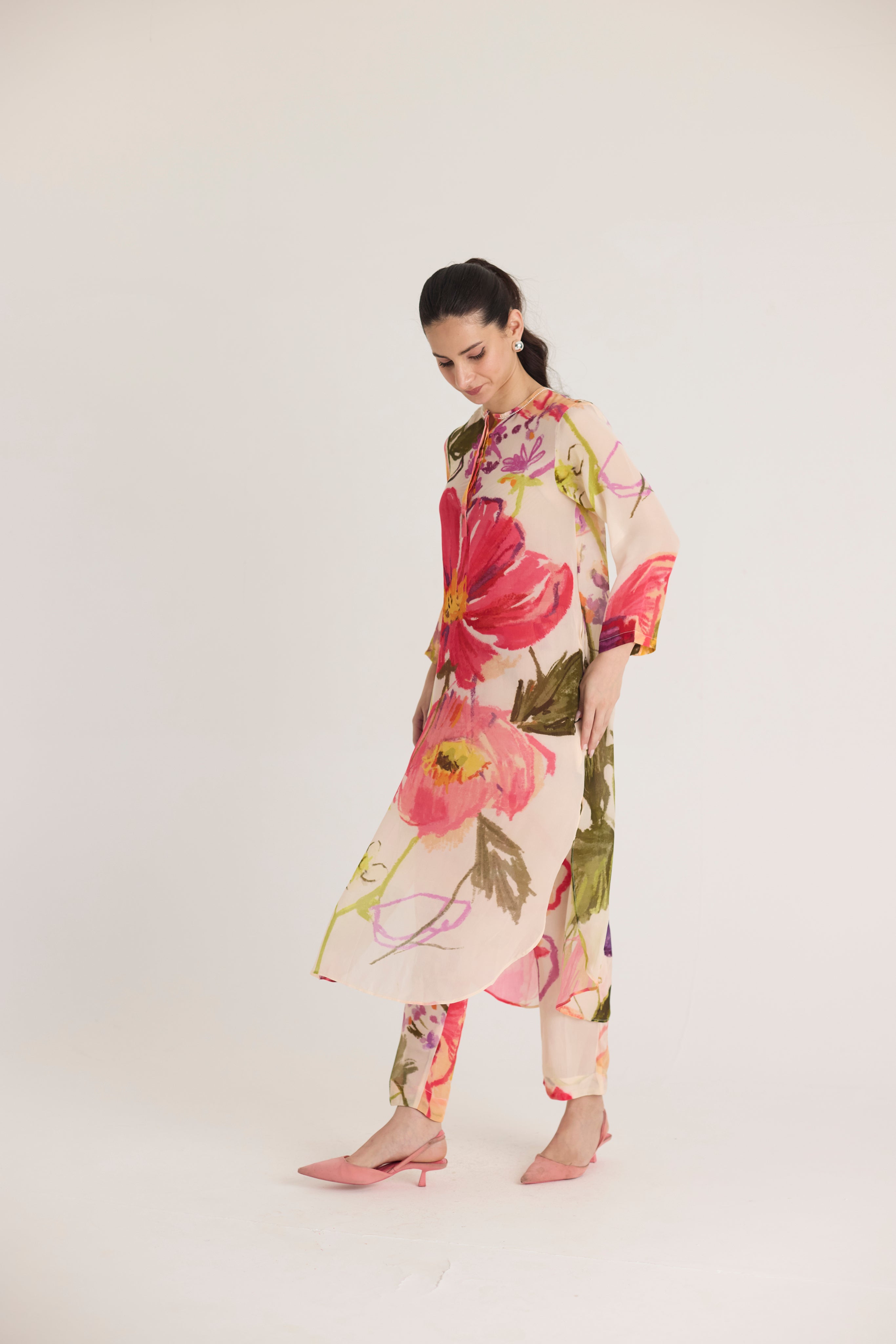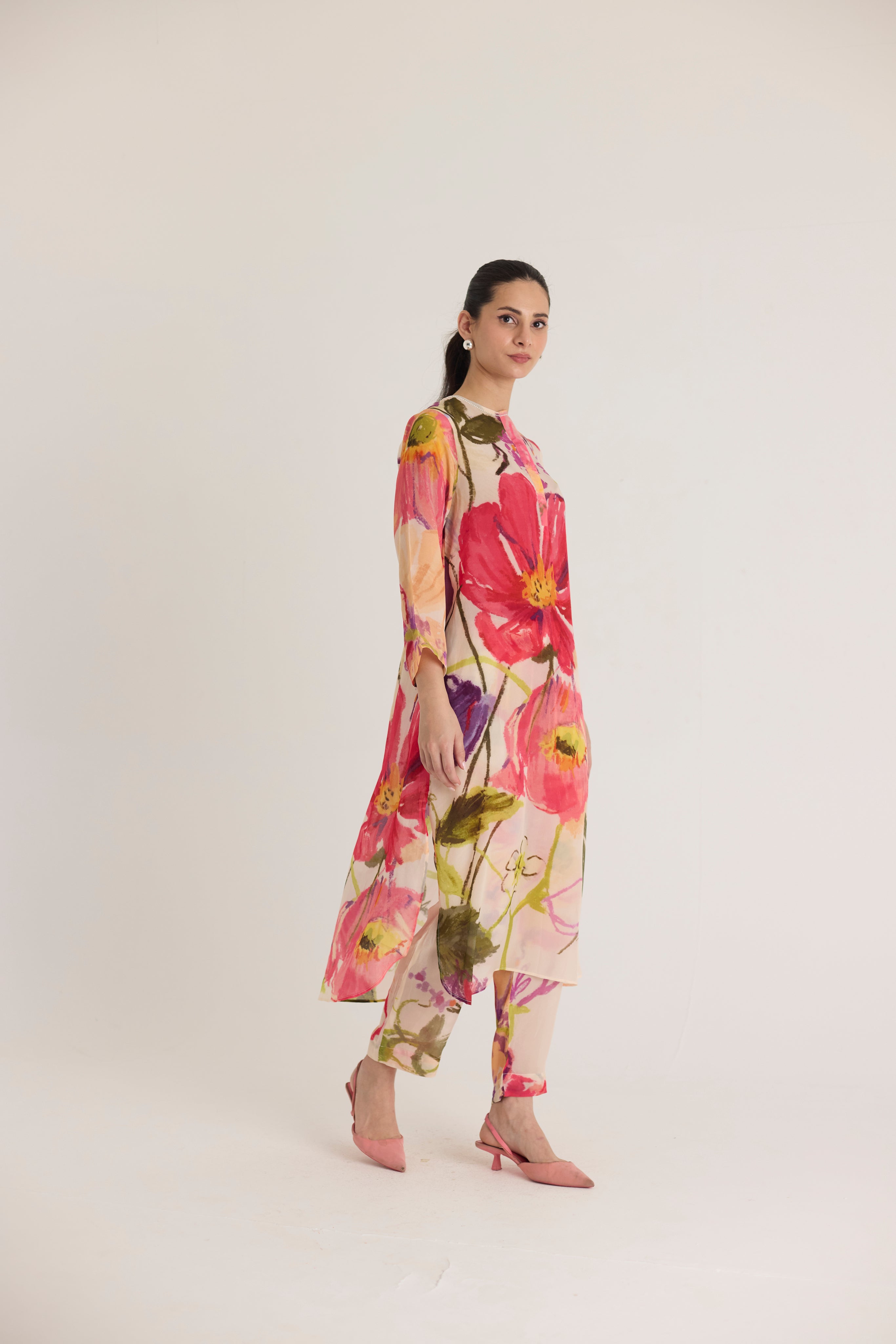 This flowy kurta set features a striking oversized floral print in vibrant hues of red, pink, and green, beautifully contrasted against a soft blush base. The painterly blooms add an artistic touch, making this outfit perfect for contemporary sophistication.
