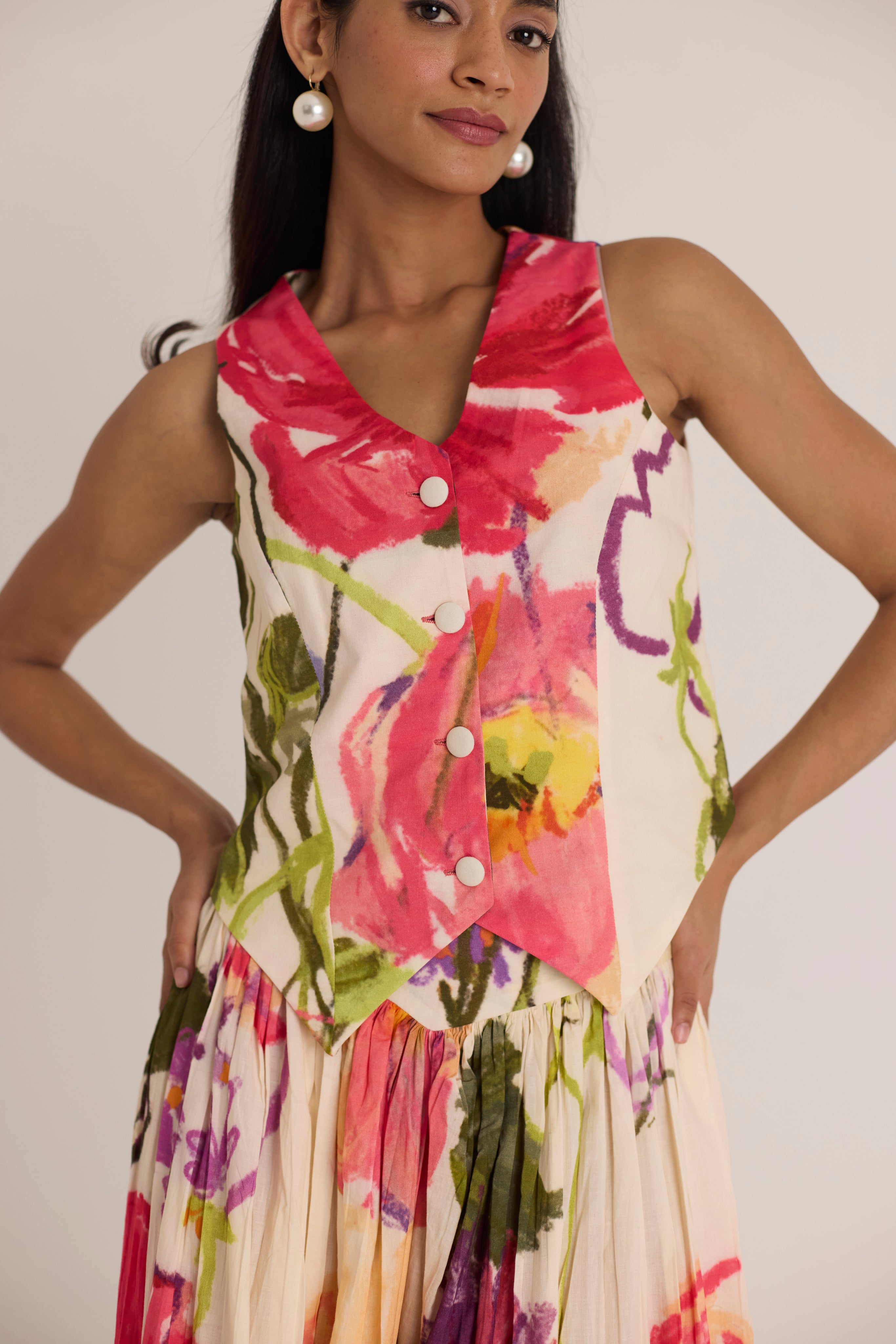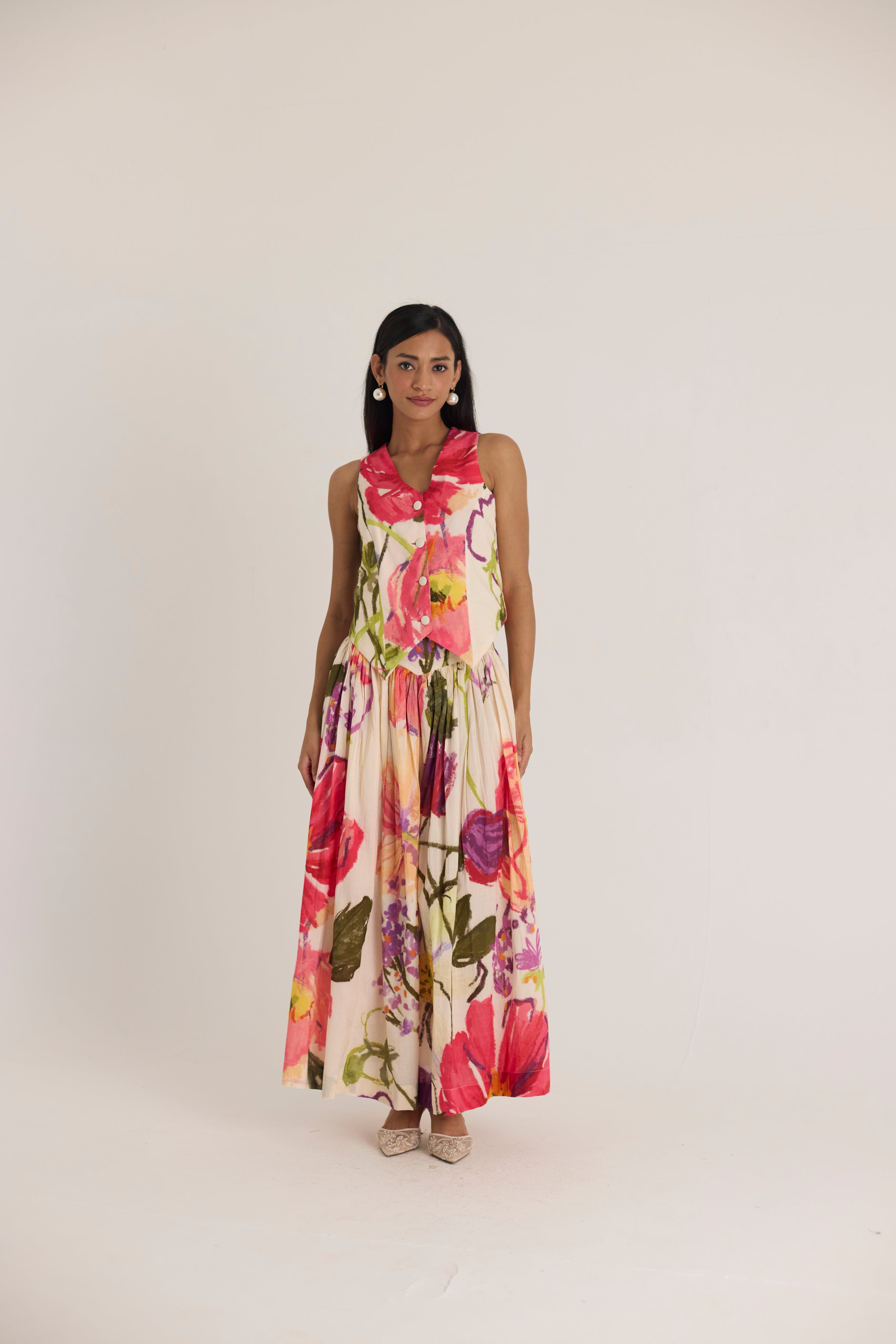 Make a bold statement with this floral waistcoat and skirt set, designed to bring artistic elegance to your wardrobe. The structured waistcoat features a sharp, pointed hem and a tailored fit, creating a striking silhouette. Paired with the matching high-waisted skirt, this co-ord set showcases a stunning watercolor-inspired floral print in vibrant shades of red, pink, green, and purple. Crafted from lightweight fabric, it offers both style and comfort.