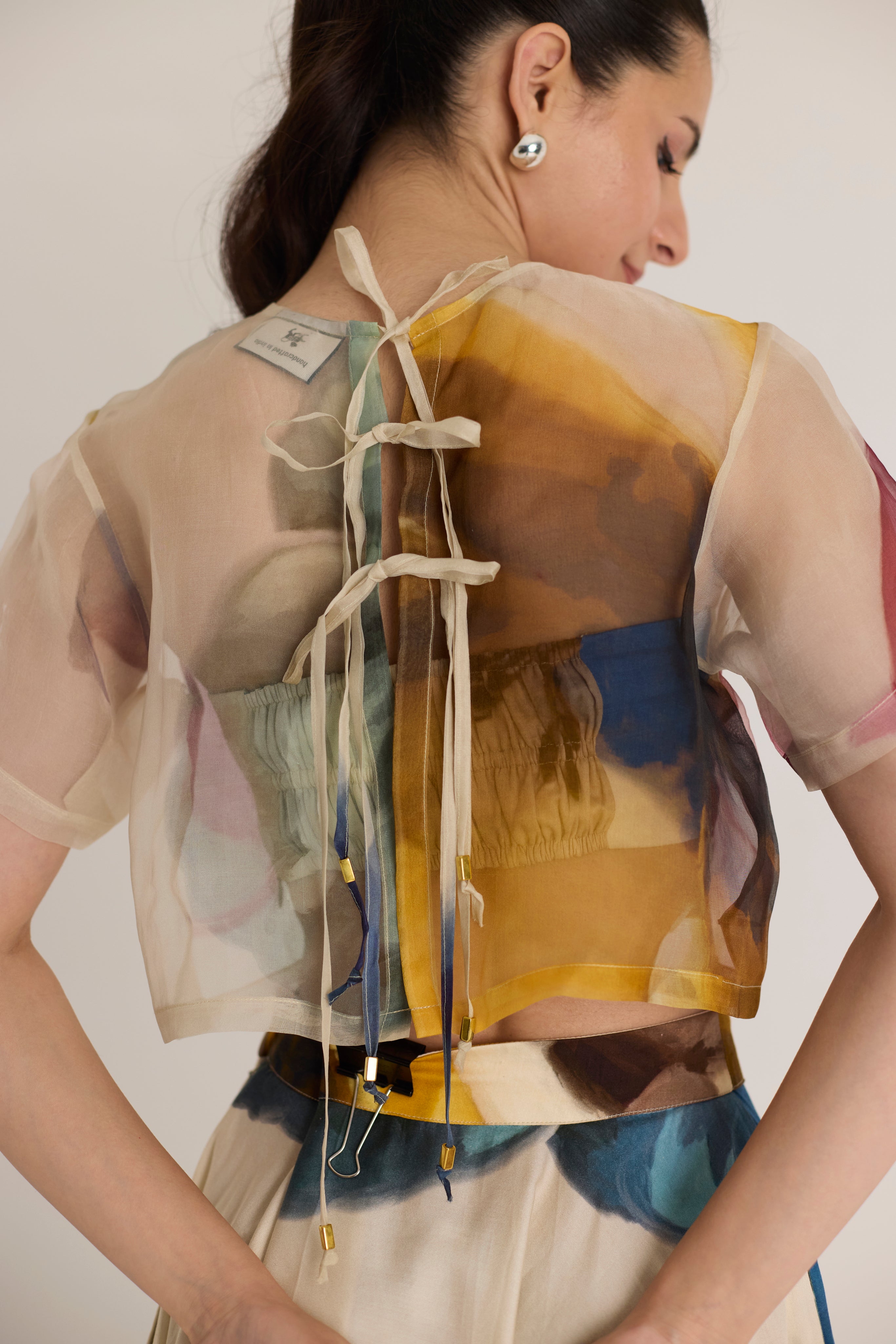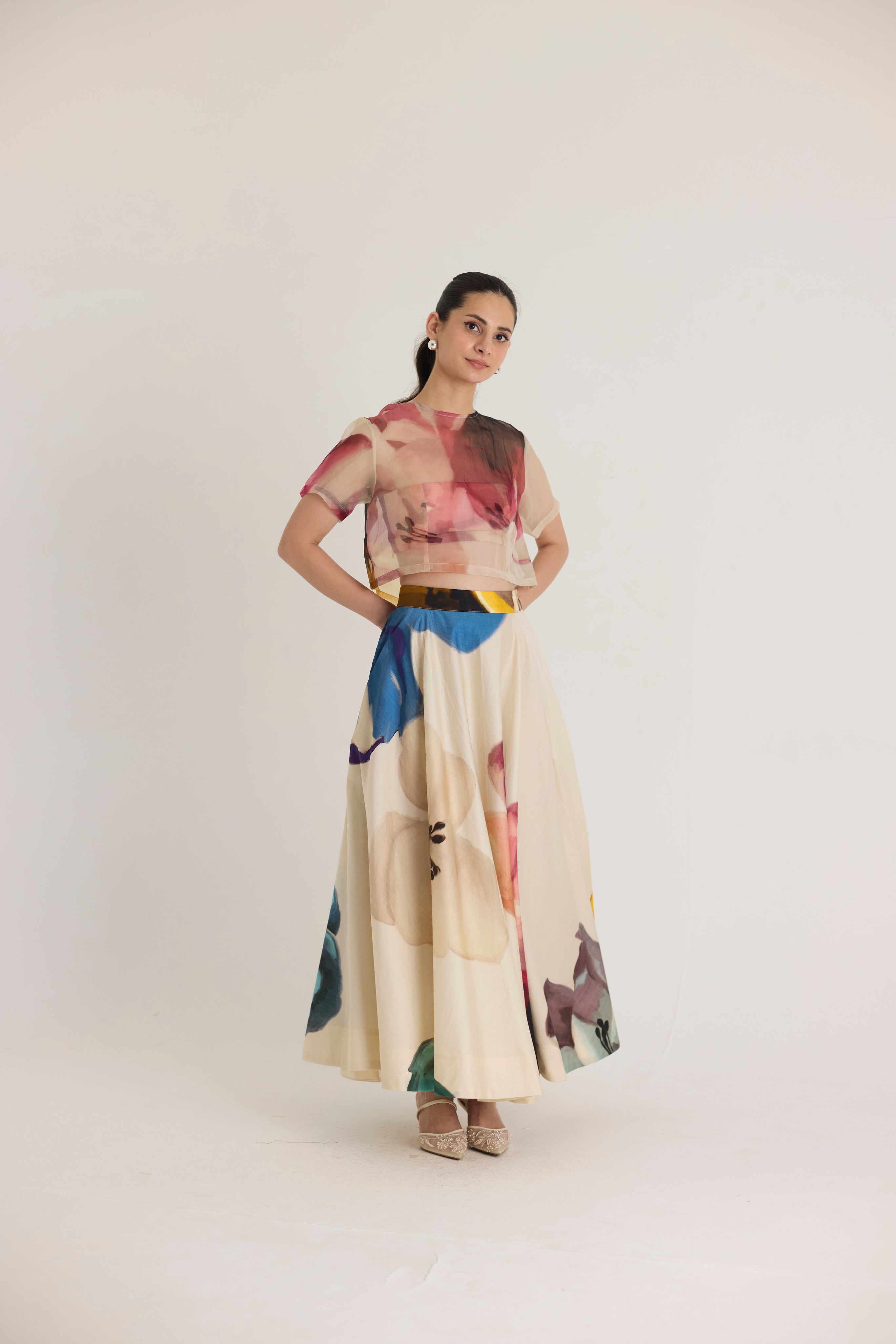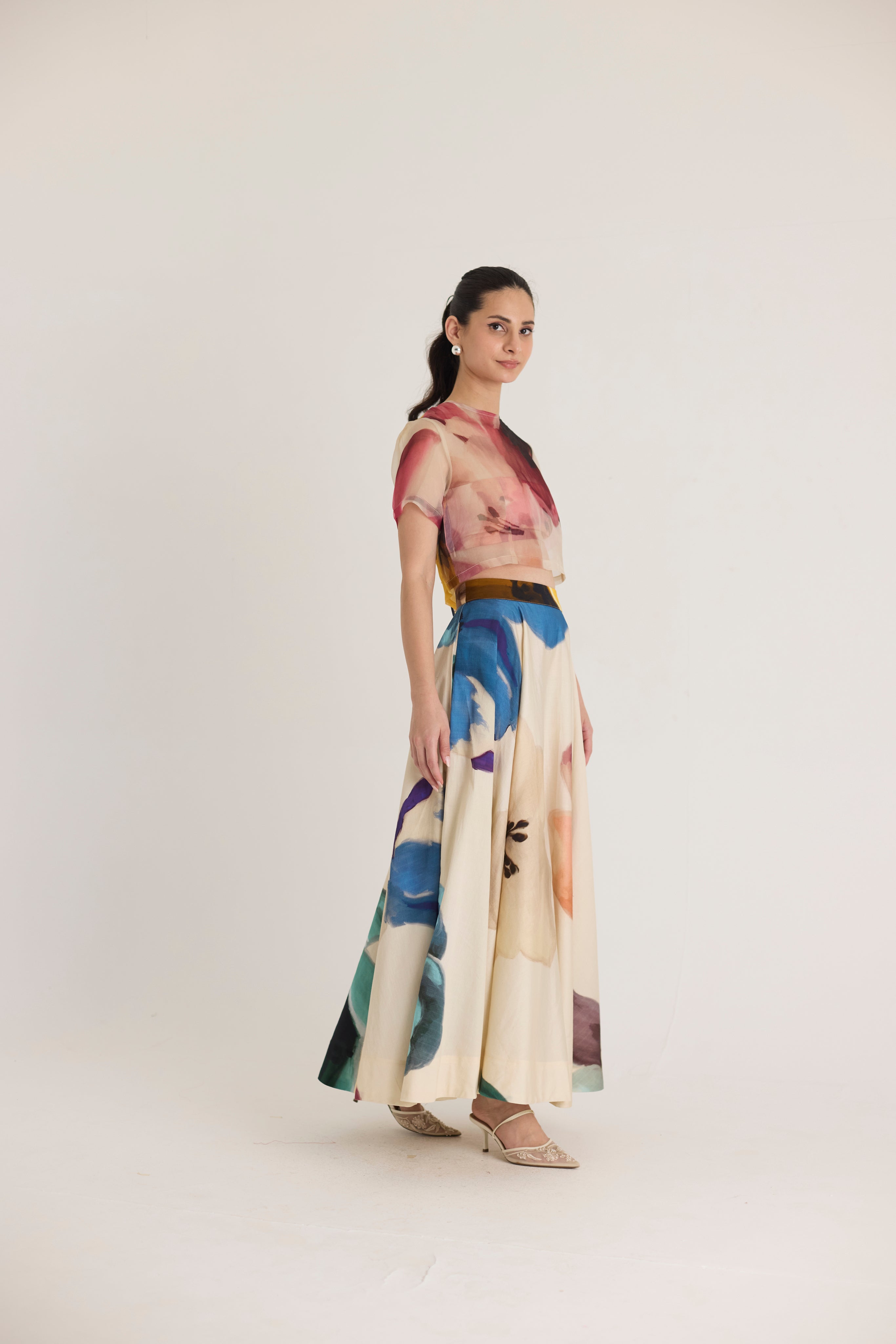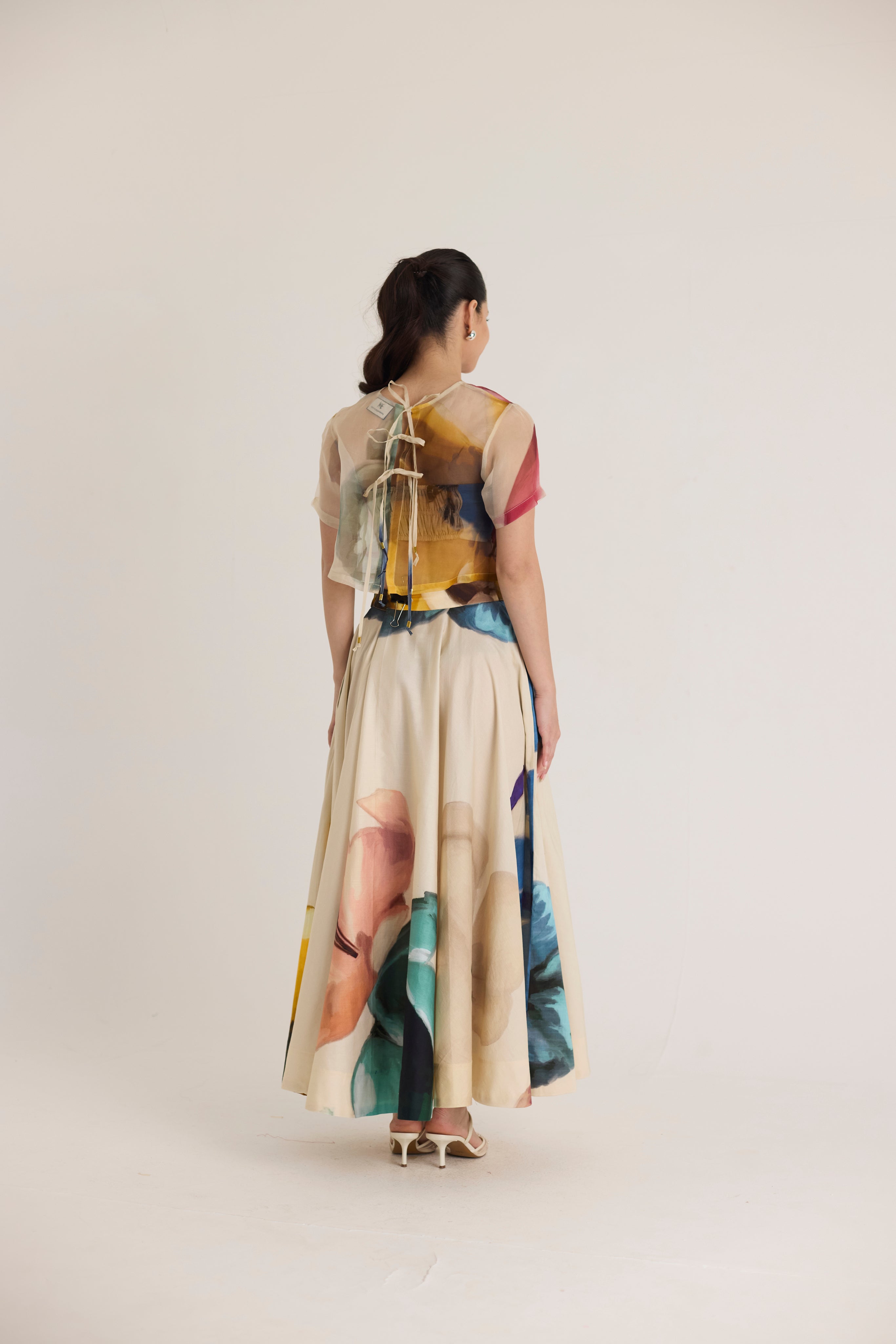 A dreamy three piece set featuring a sheer crop top layered over a structured bustier and a flowing high-waisted maxi skirt. The delicate organza top adds a modern touch to the classic silhouette, while the abstract watercolor-inspired print brings a bold yet elegant aesthetic.