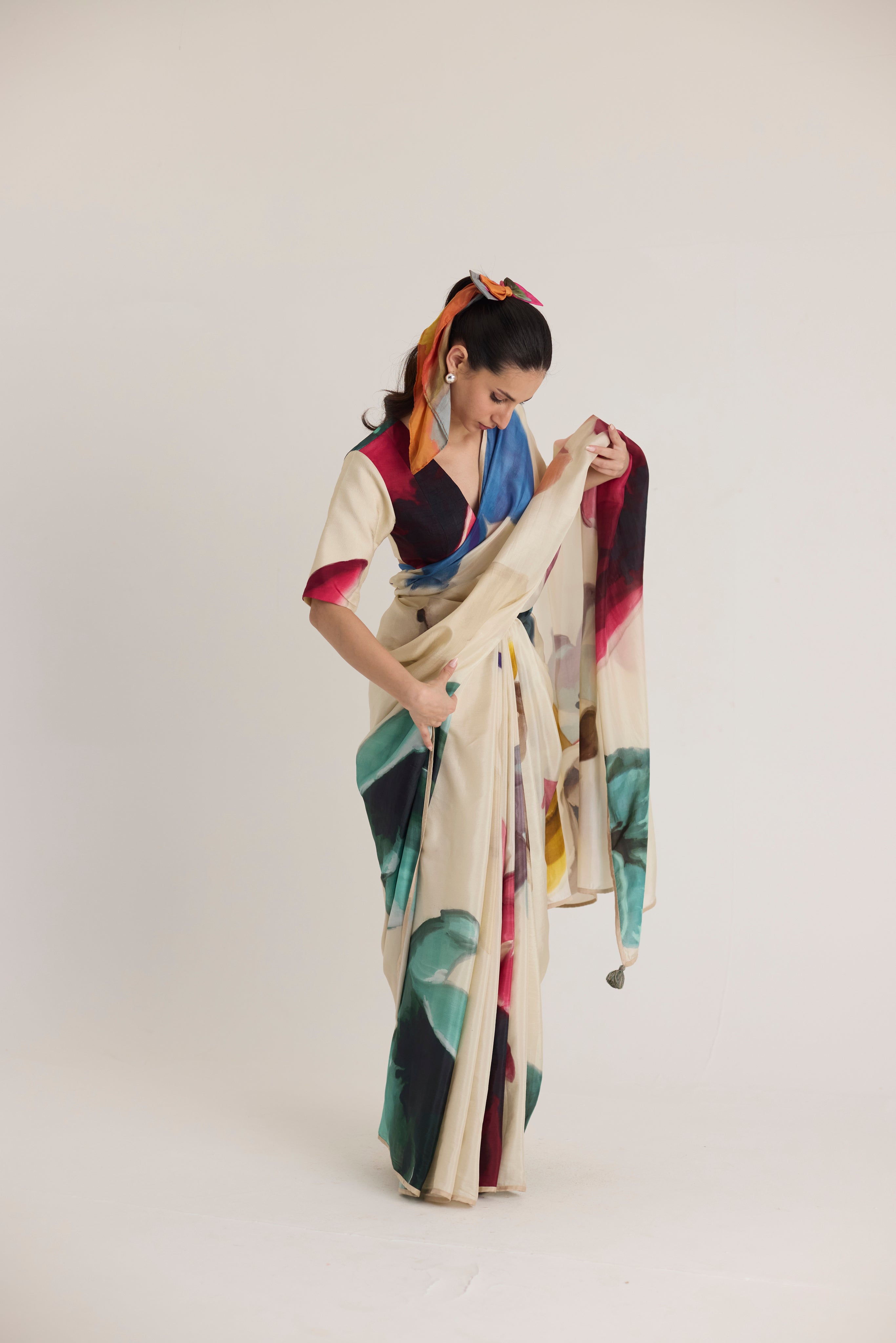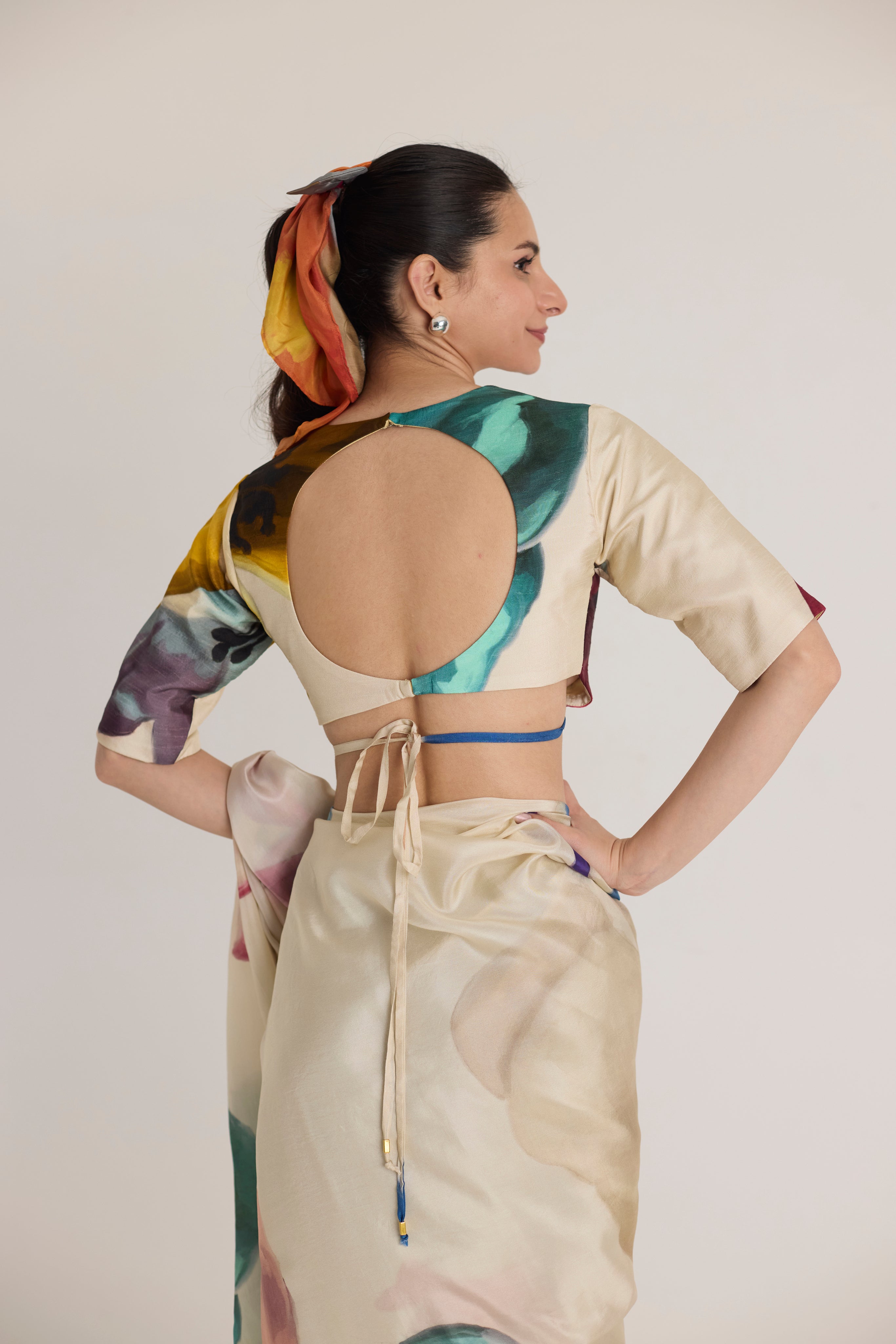 Adorned with an abstract floral print, this blouse showcases bold strokes of deep crimson, earthy beige, mustard yellow, and teal against a soft ivory base. The seamless fusion of watercolor-like hues creates an artistic, painterly effect, evoking the essence of nature in motion.