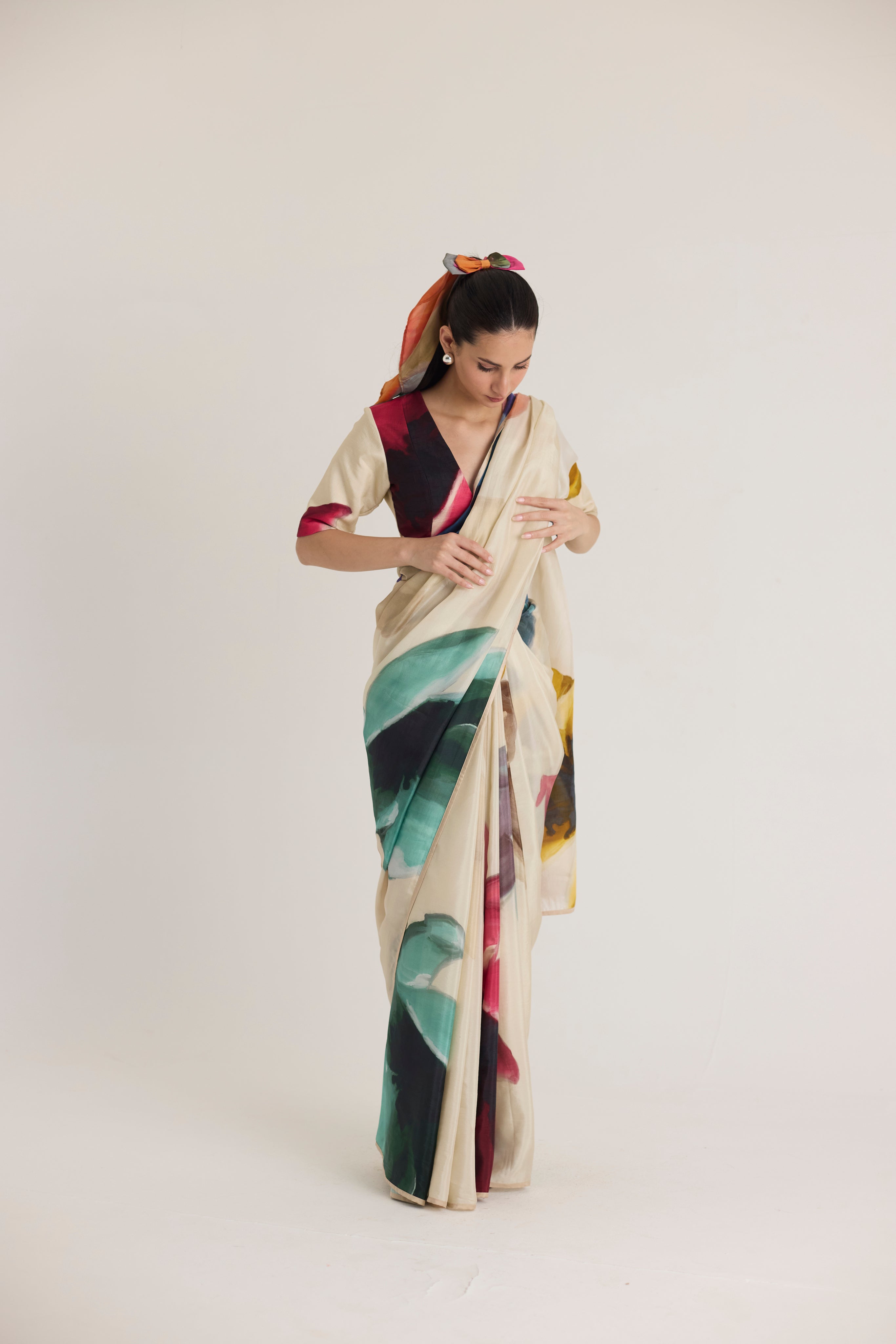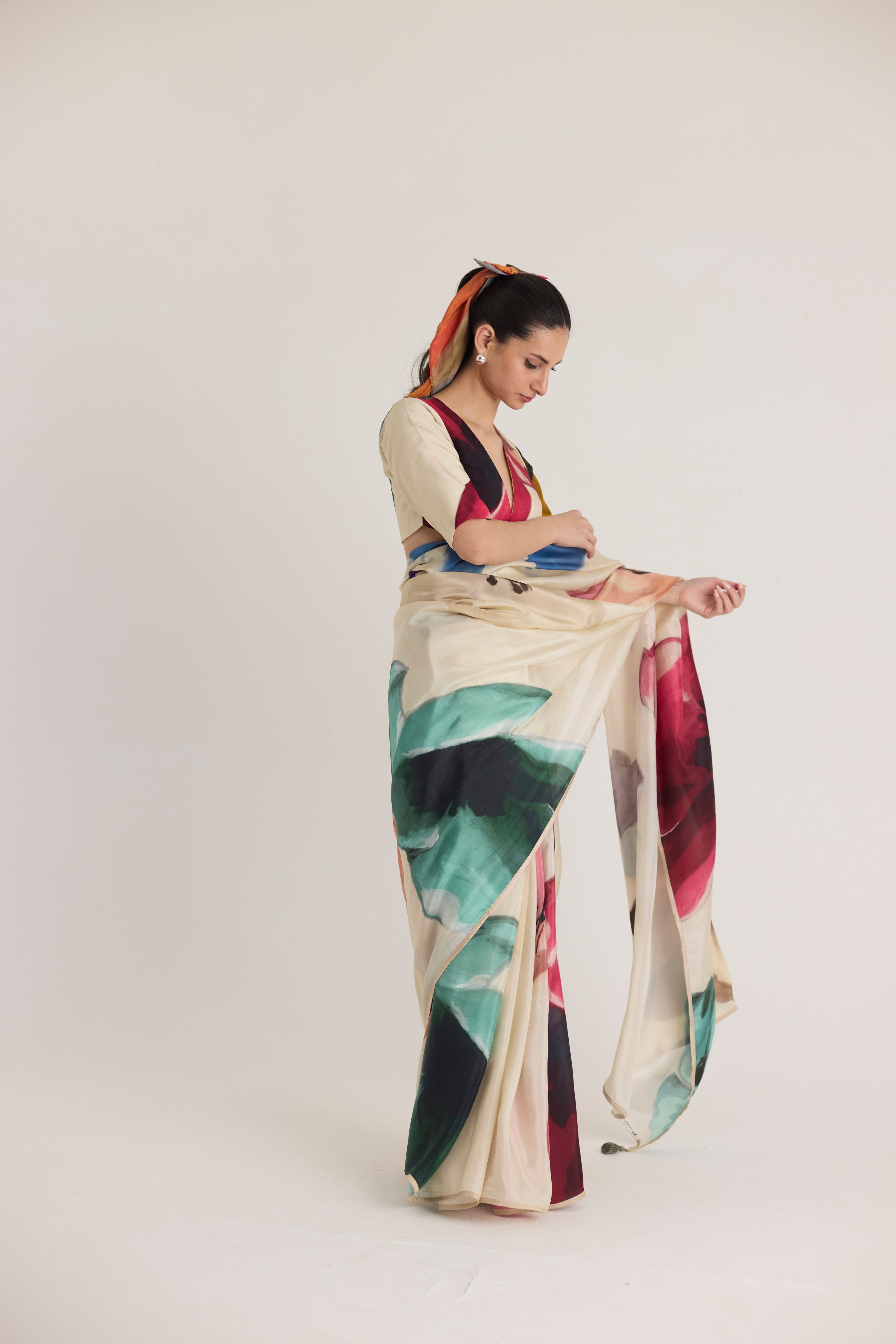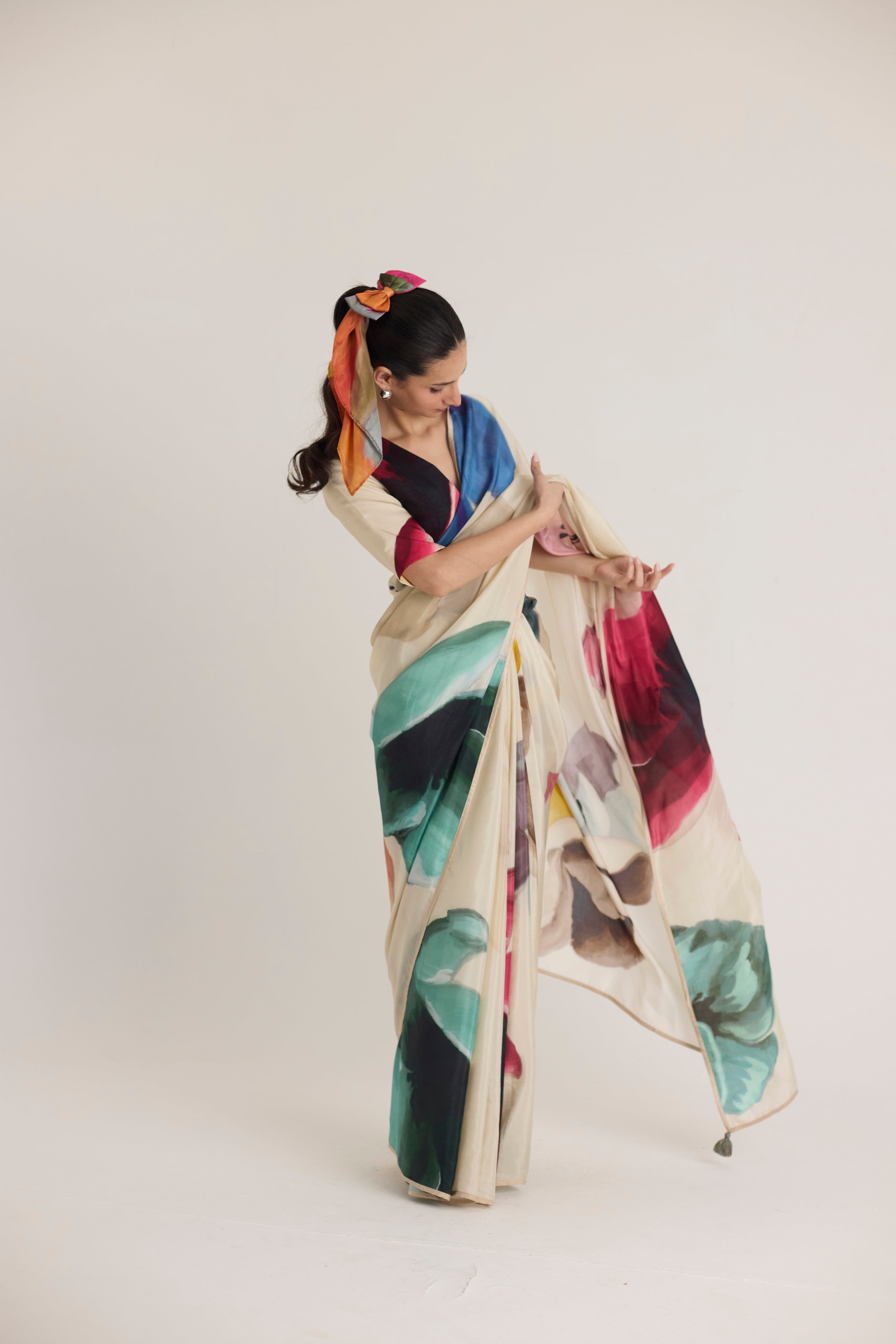 A breathtaking abstract floral print, this saree is a work of art inspired by bold brushstrokes and fluid forms. The oversized watercolor blooms in rich jewel tones of emerald green, deep red, and midnight black contrast beautifully against the soft beige base. This print exudes an effortless charm, perfect for modern elegance with an artistic touch.