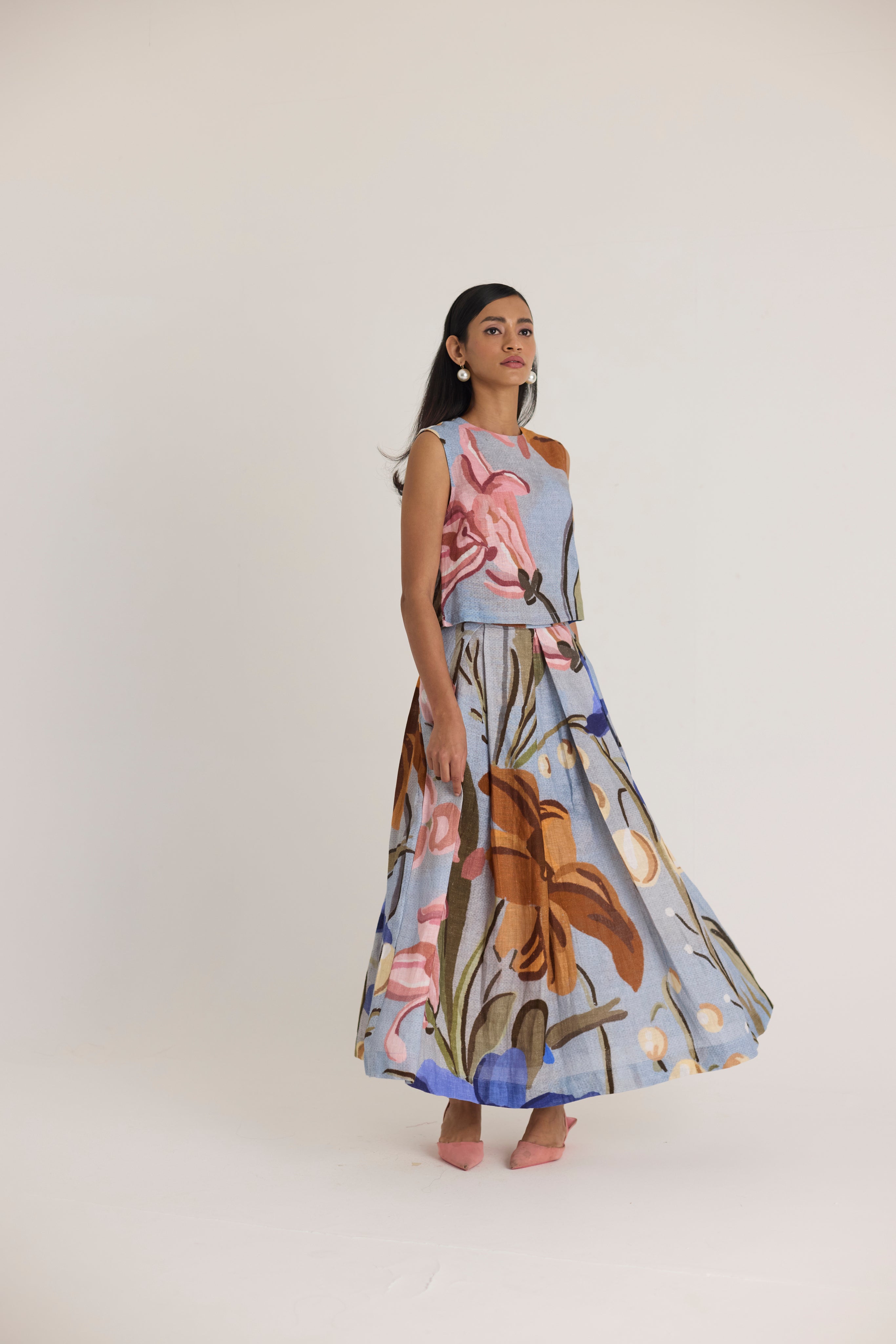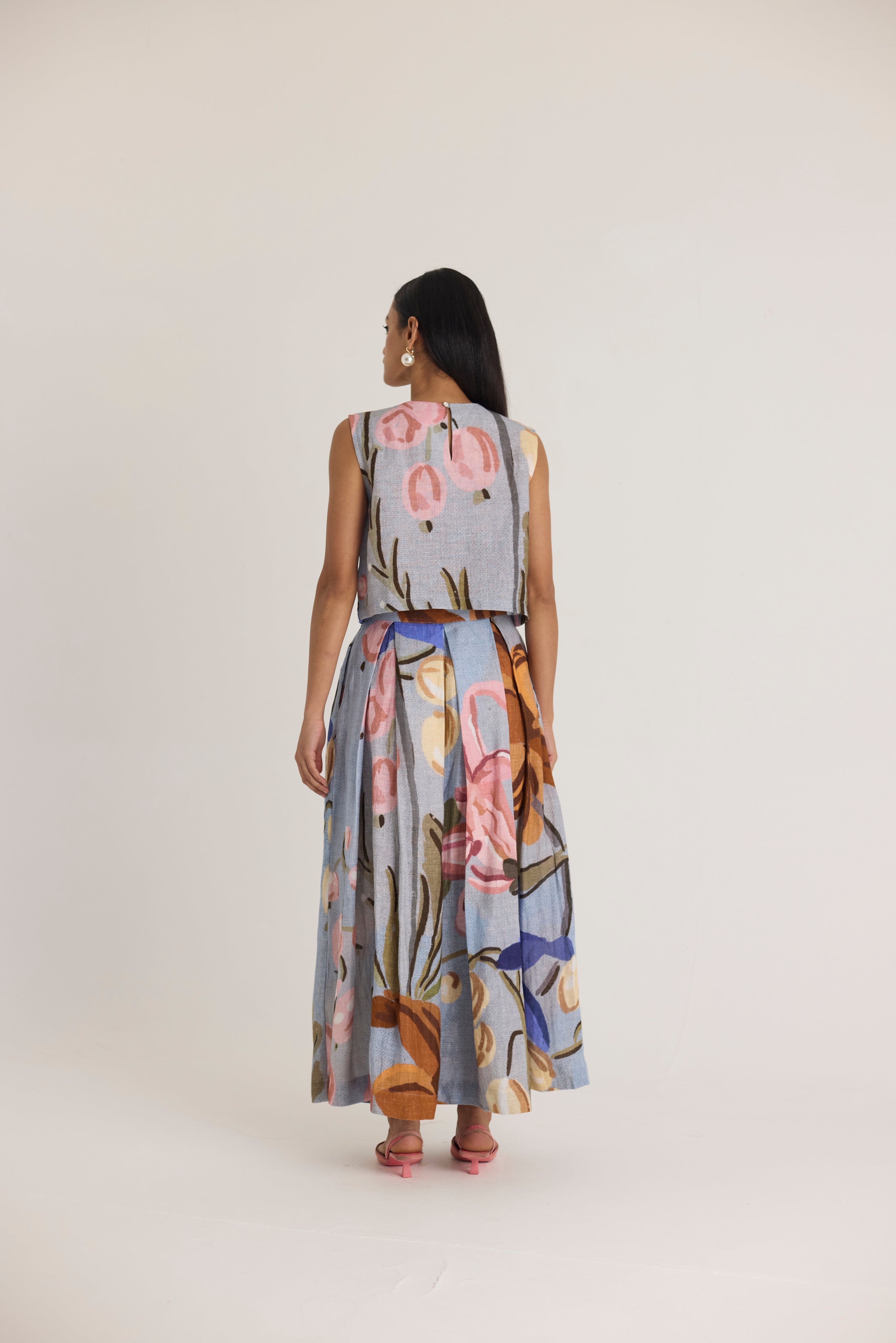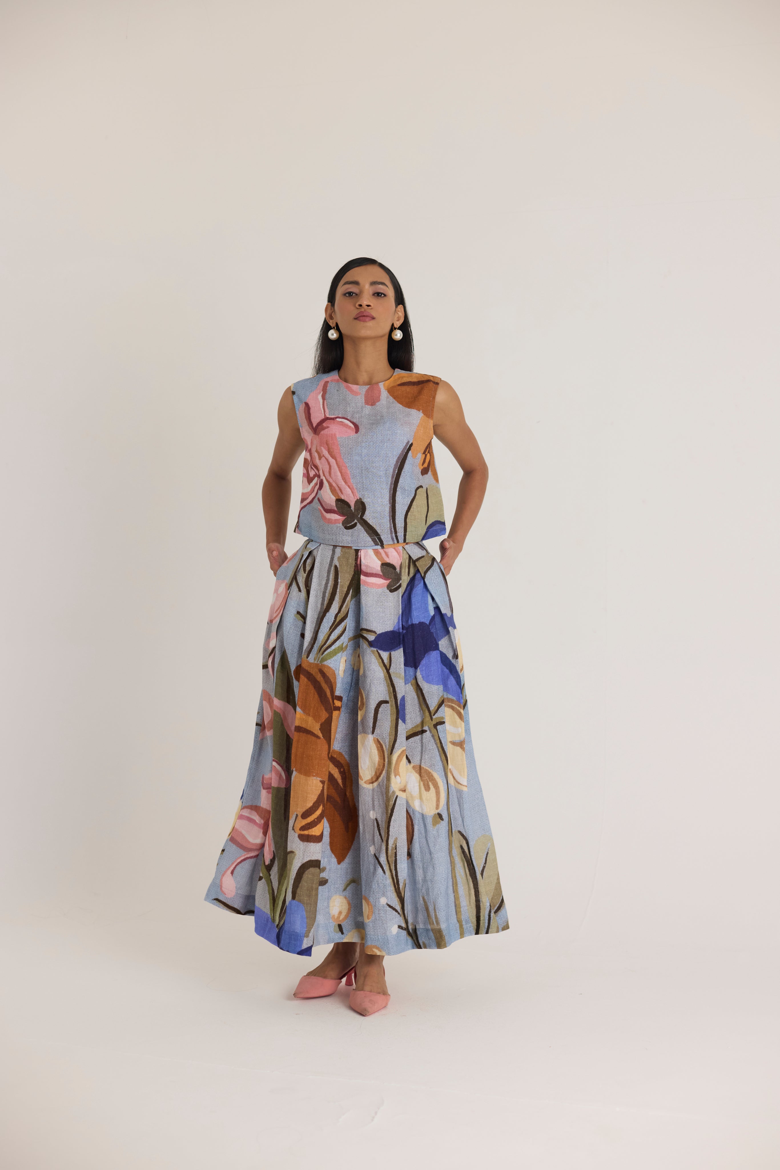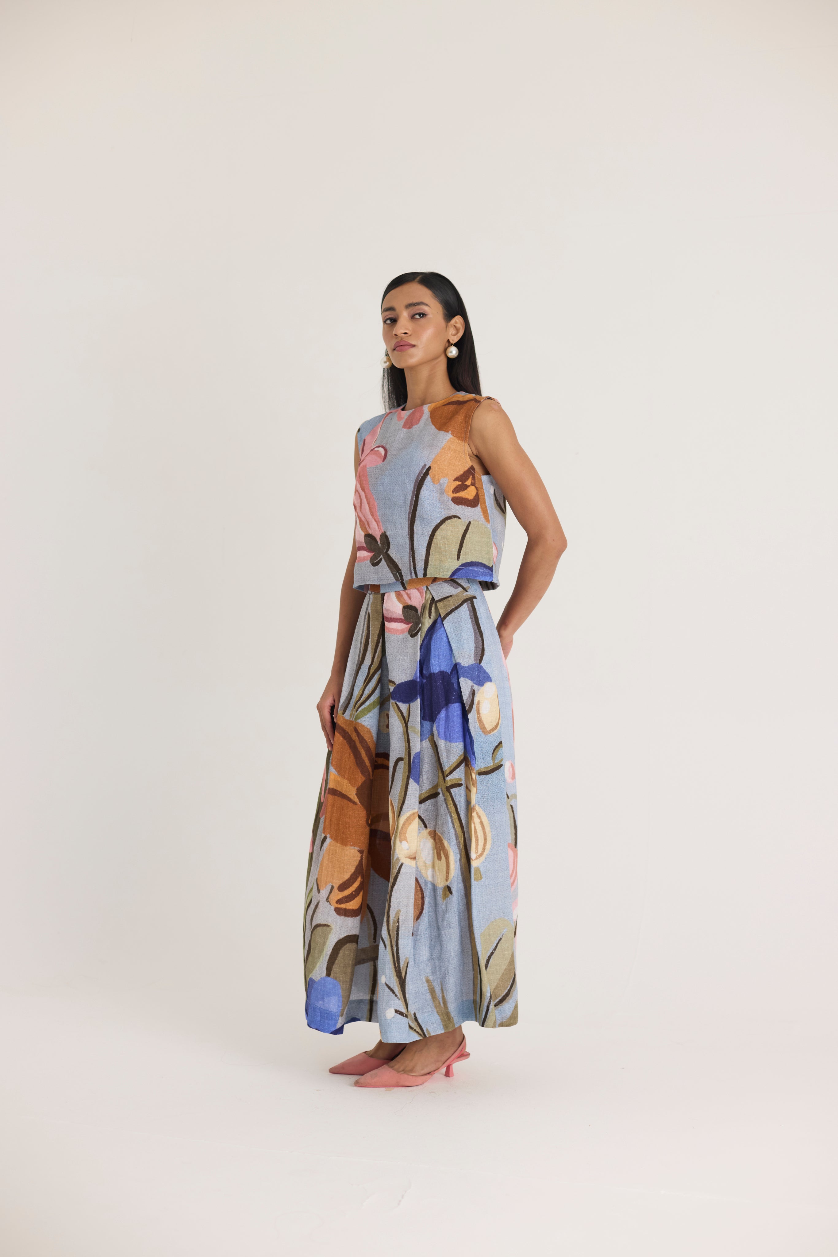 A stunning two-piece co-ord set that effortlessly combines structure with fluidity. Featuring a sleeveless crop top and a voluminous maxi skirt, this set is designed for modern elegance with a touch of artistic charm. Perfect for both casual and dressy occasions, it offers a chic yet comfortable silhouette.