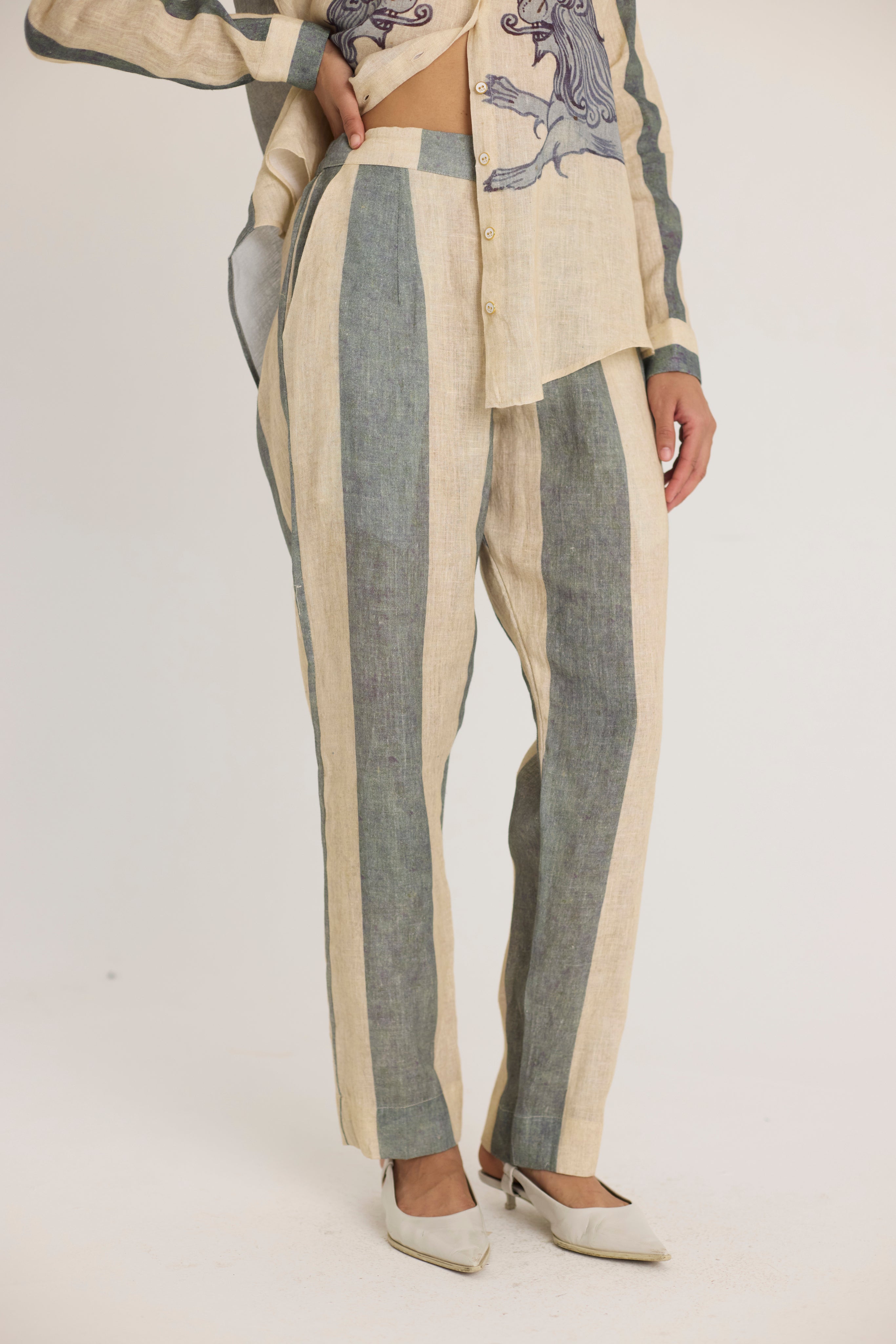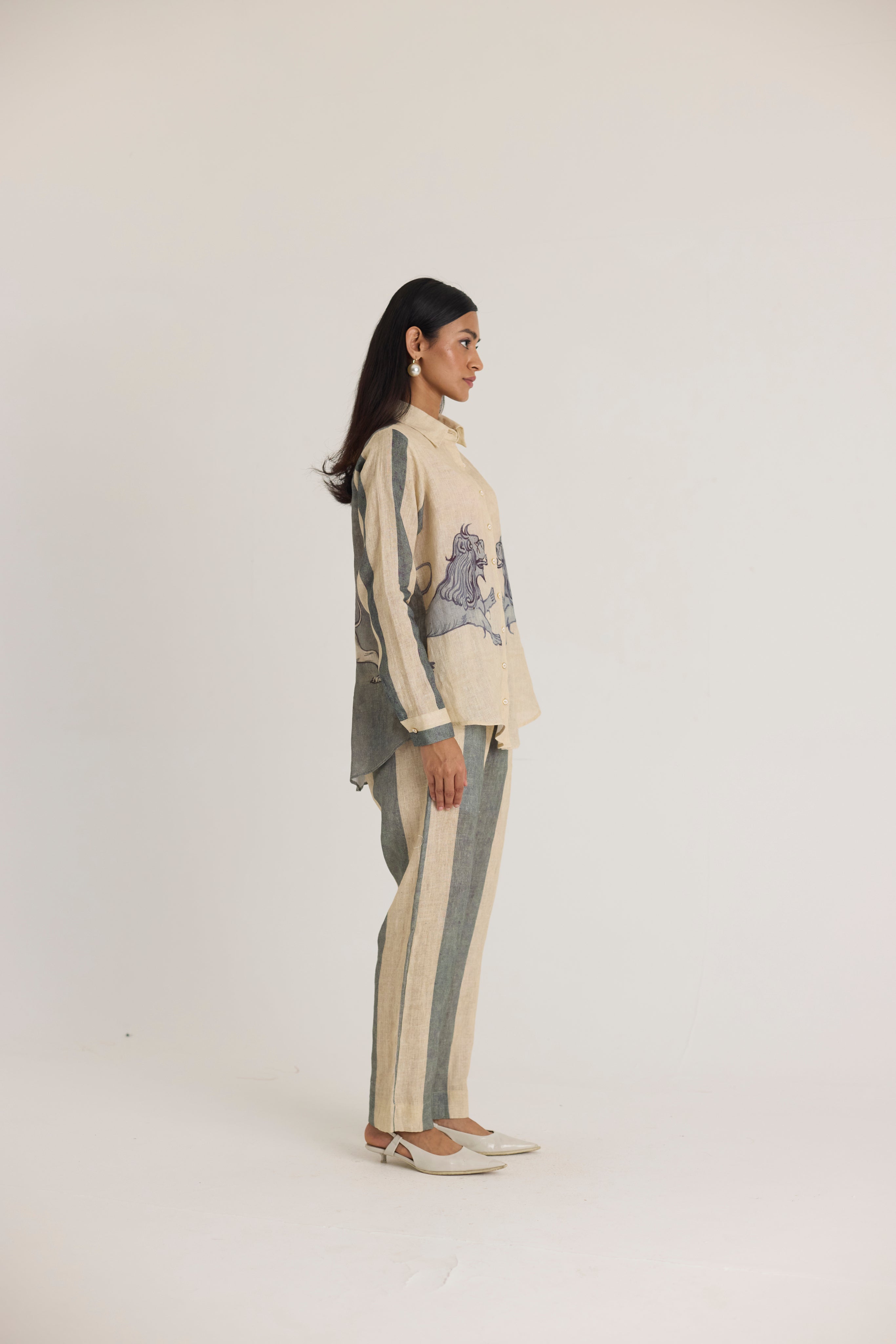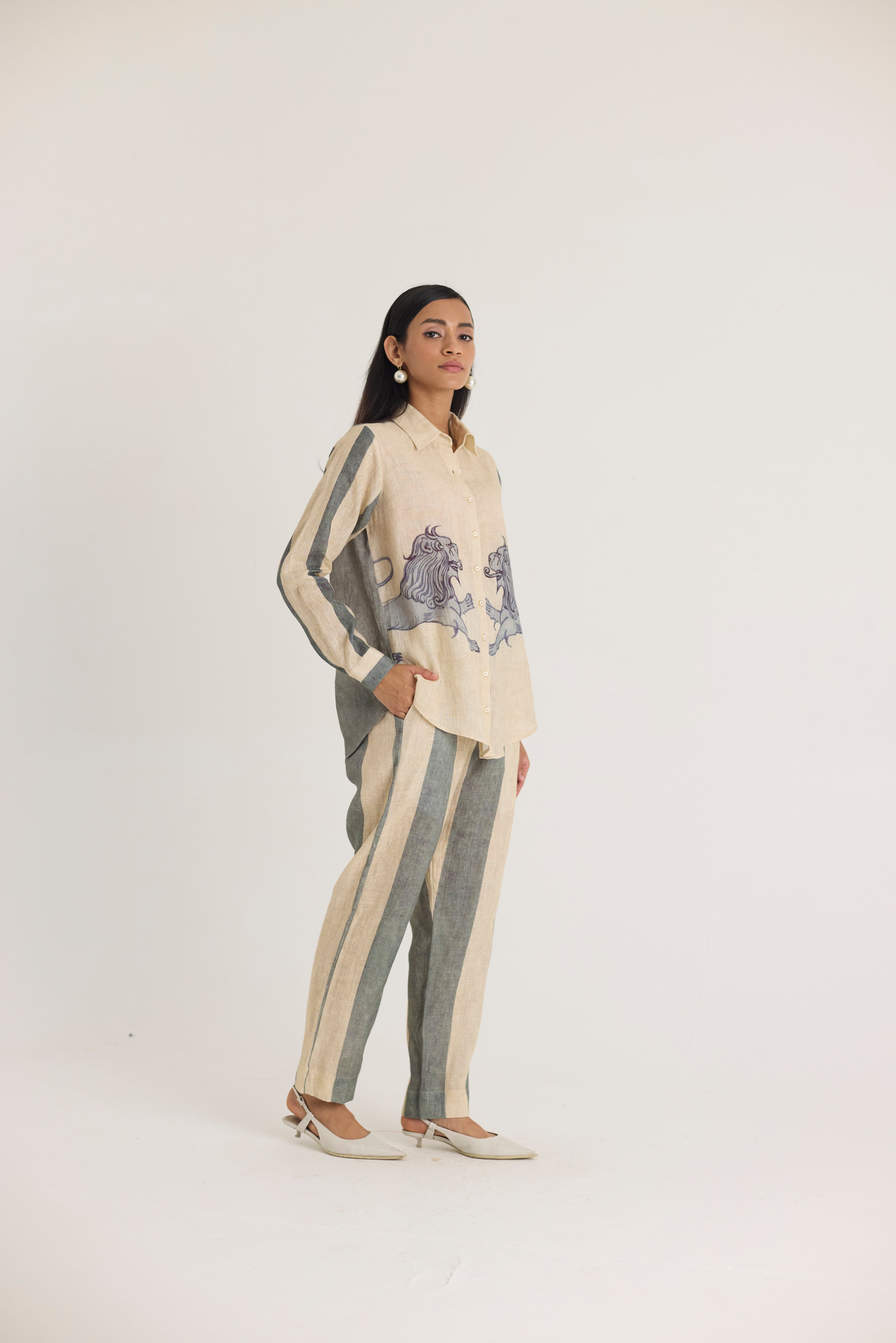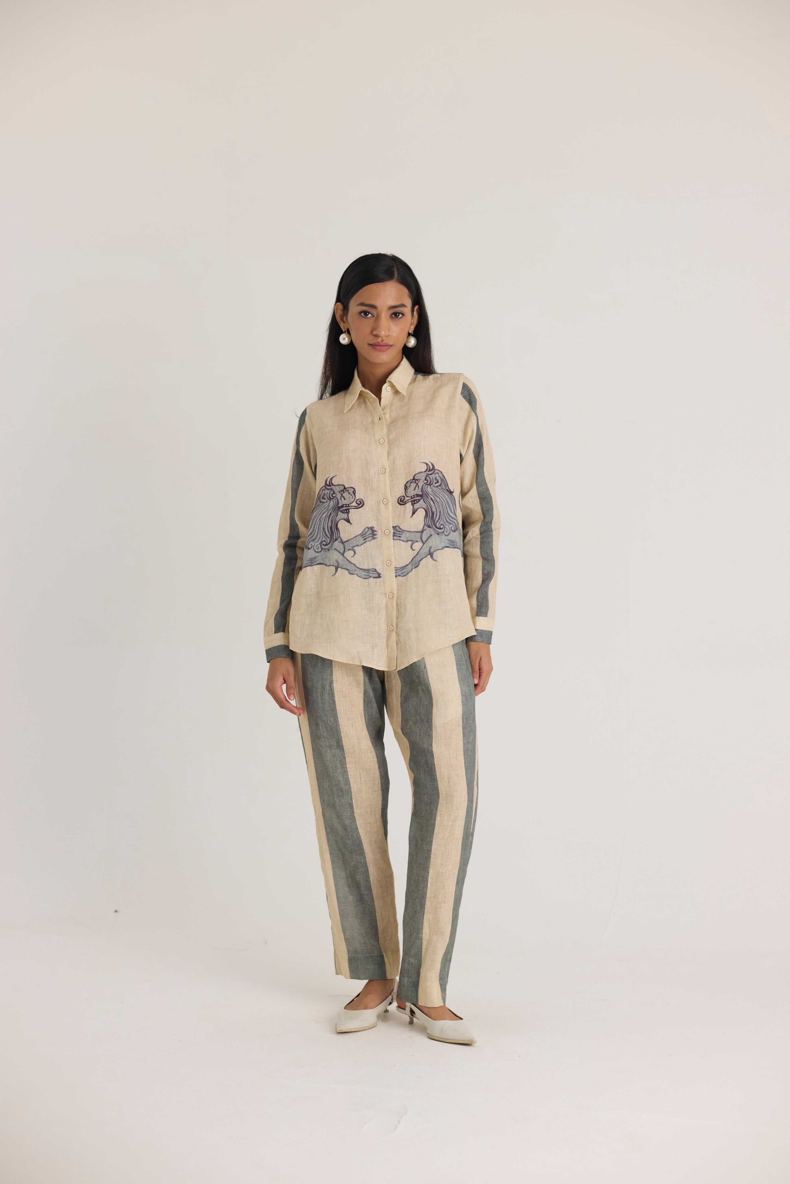 This ensemble features a striking mythical lion motif on the shirt, symbolizing strength and heritage. The hand-drawn artwork is reminiscent of traditional folk art, lending a regal yet contemporary aesthetic. Complementing the detailed print, the trousers showcase bold vertical stripes in earthy tones, adding a structured and elongated silhouette.