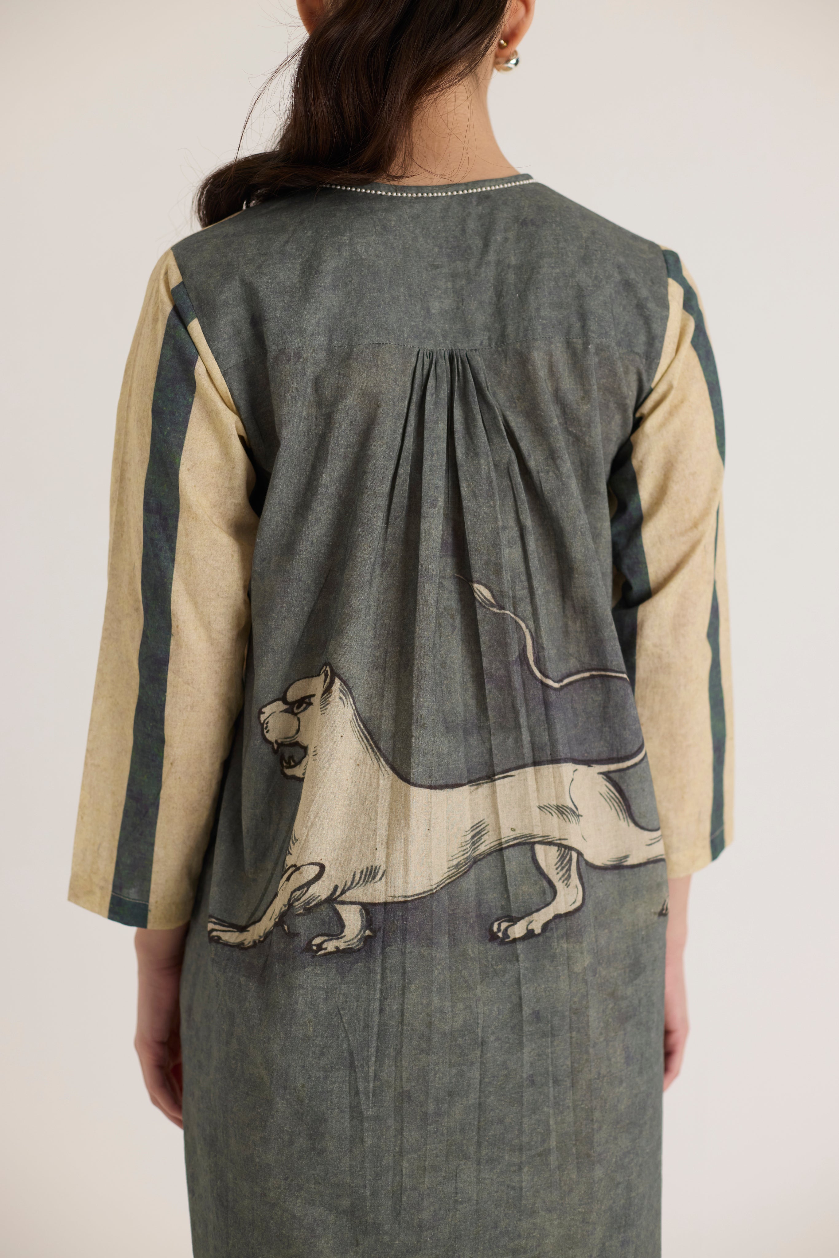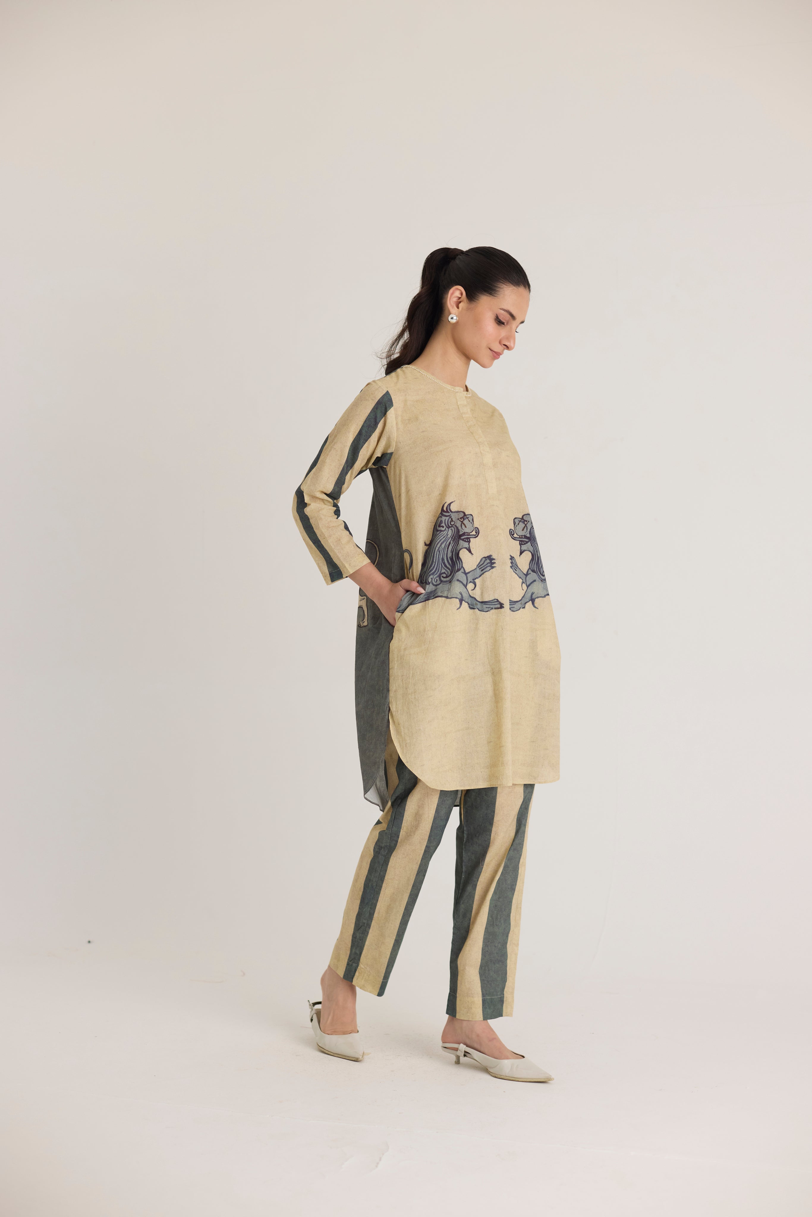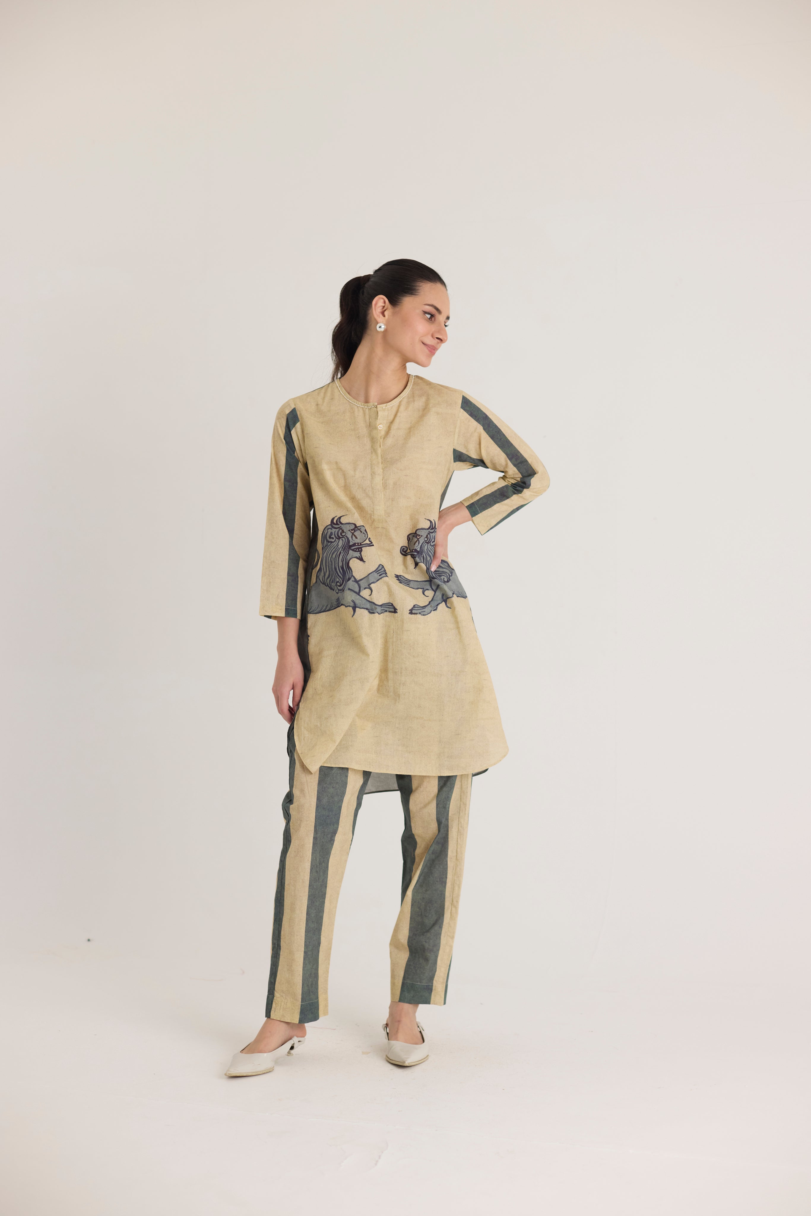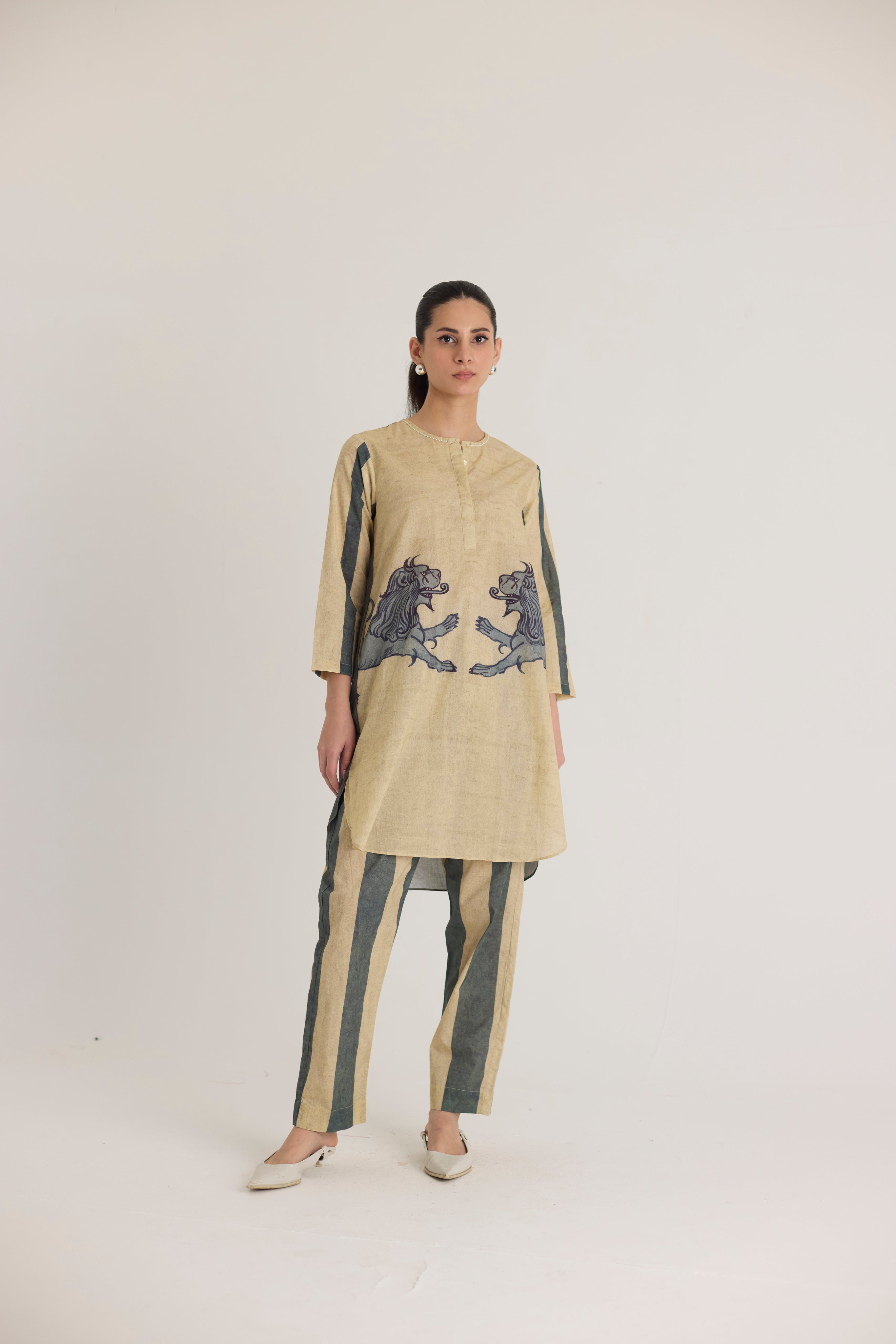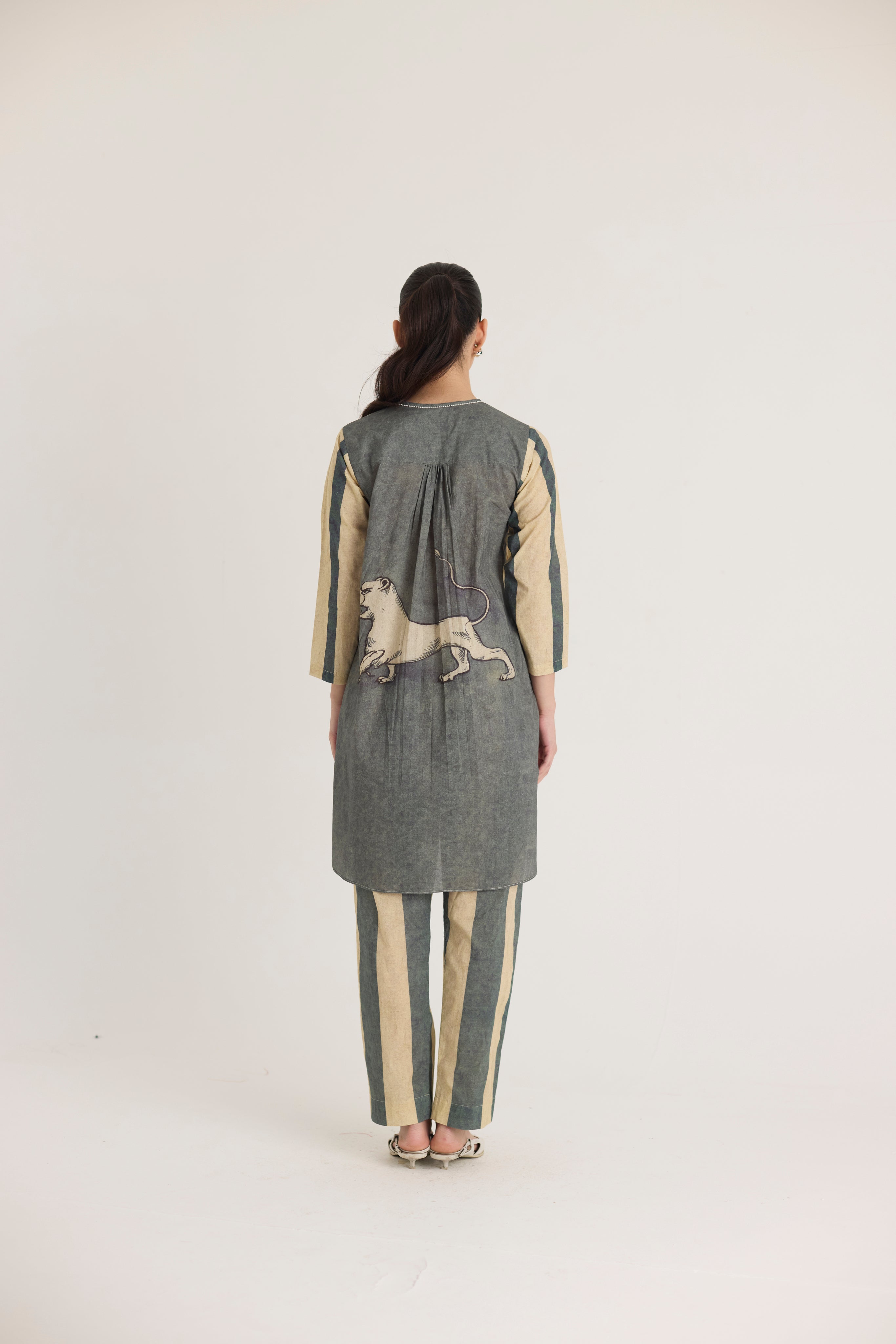 This ensemble features a striking mythical lion motif on the shirt, symbolizing strength and heritage. The hand-drawn artwork is reminiscent of traditional folk art, lending a regal yet contemporary aesthetic. Complementing the detailed print, the trousers showcase bold vertical stripes in earthy tones, adding a structured and elongated silhouette.