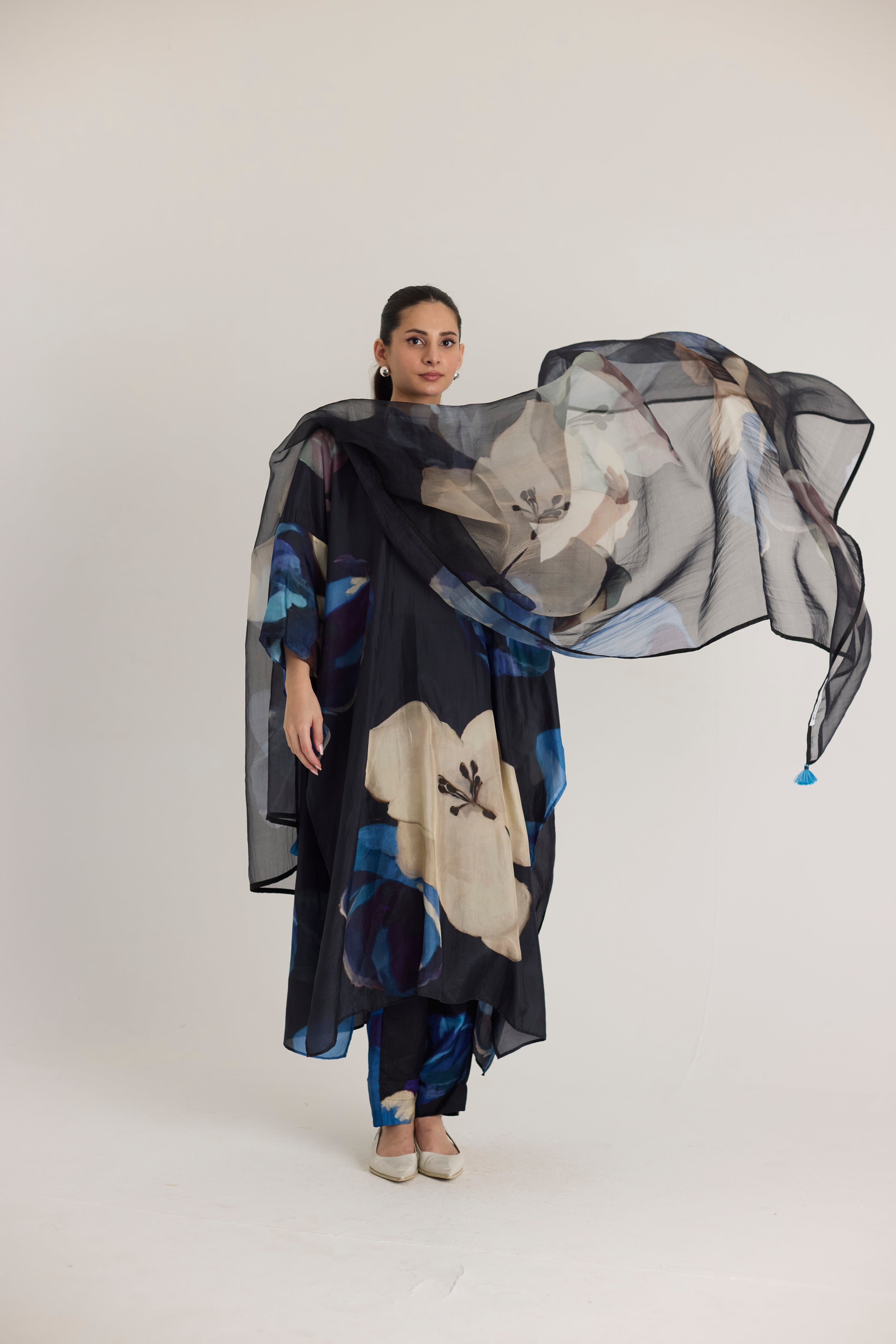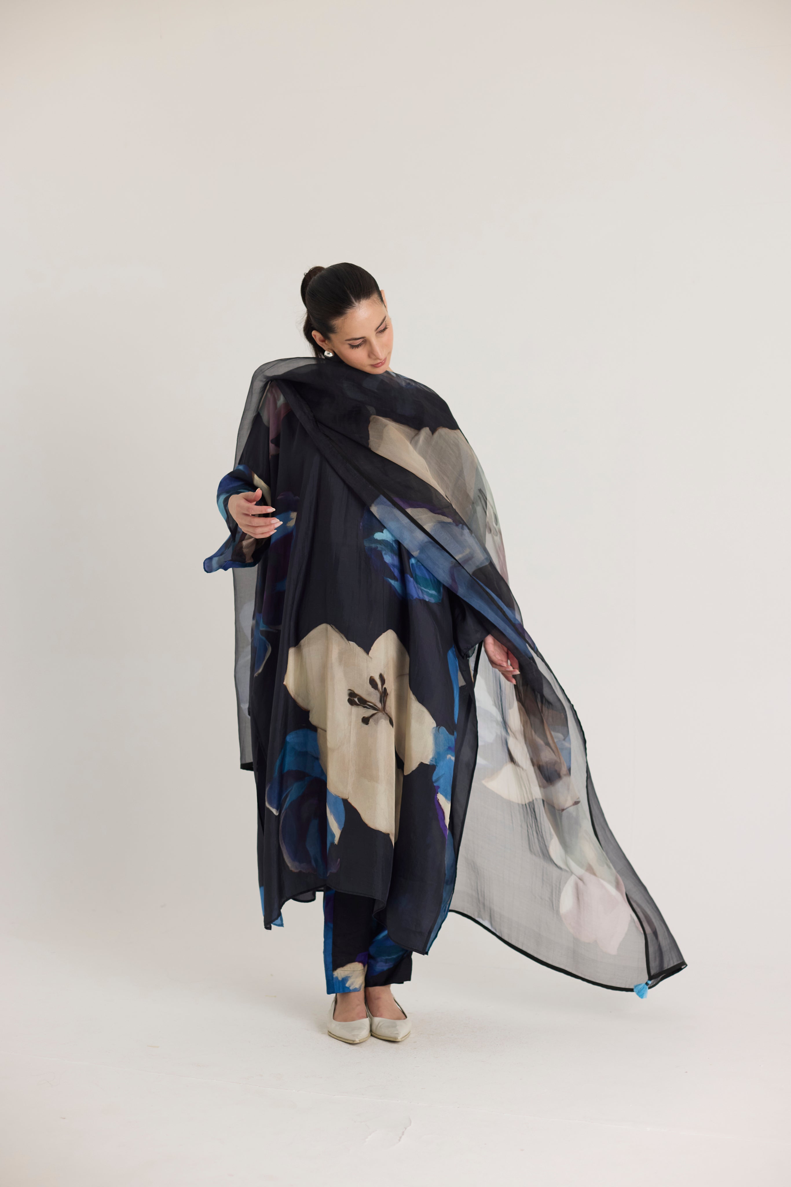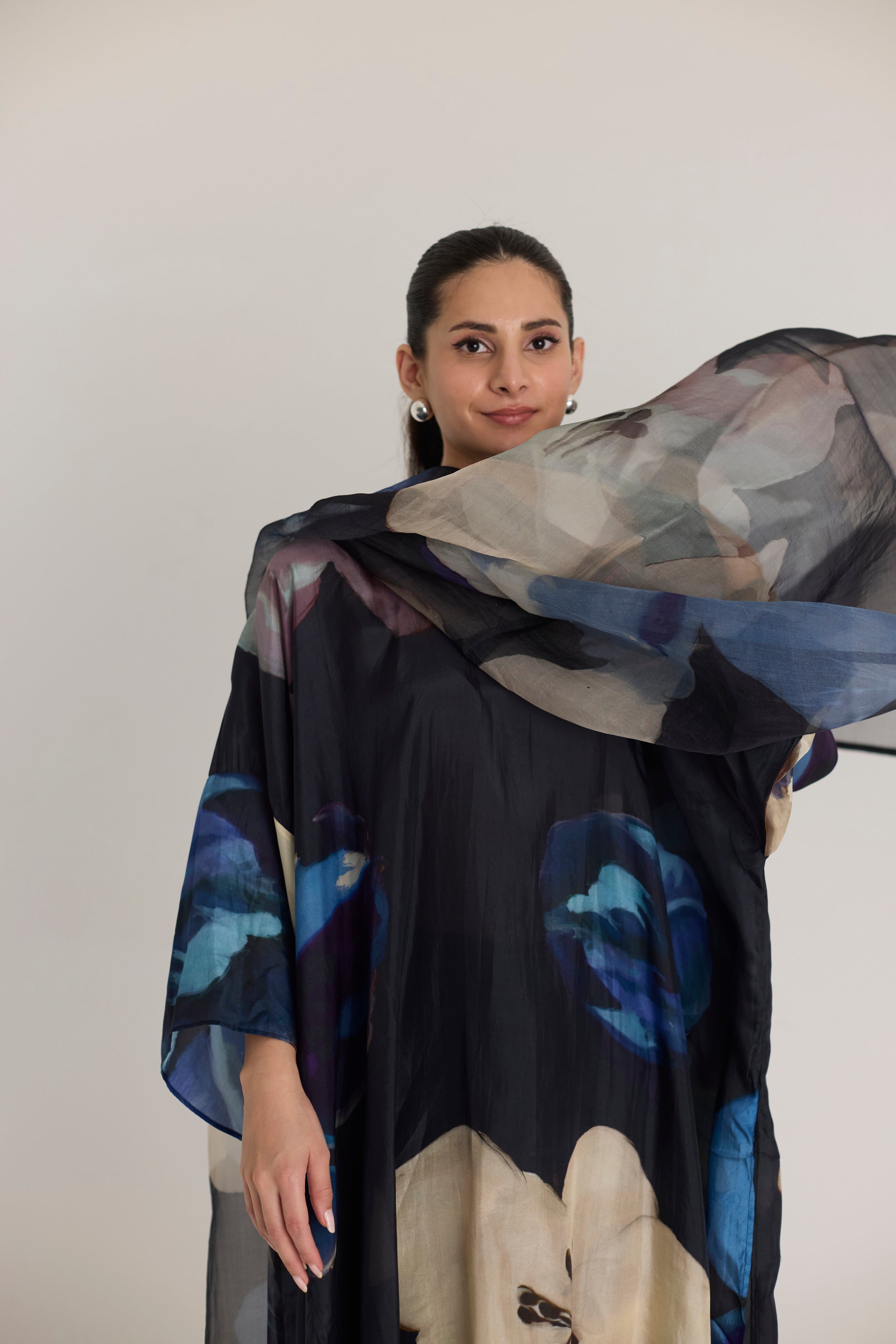 A stunning fusion of textures, this saree is designed for modern elegance and the shades of ivory, sand, sapphire, and inky blue blend into a moody, painterly composition, evoking the allure of a moonlit garden. Each flower is rendered with delicate, artistic strokes that lend a hand-painted, contemporary charm to the piece.