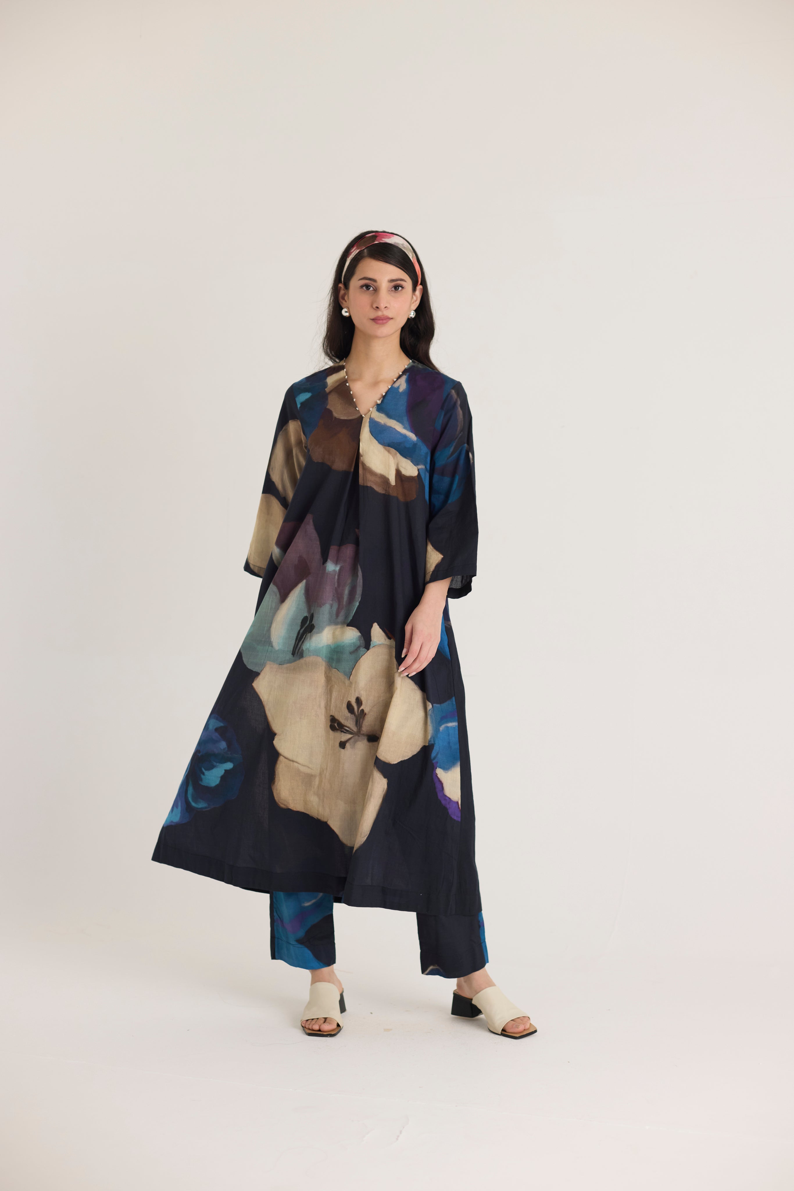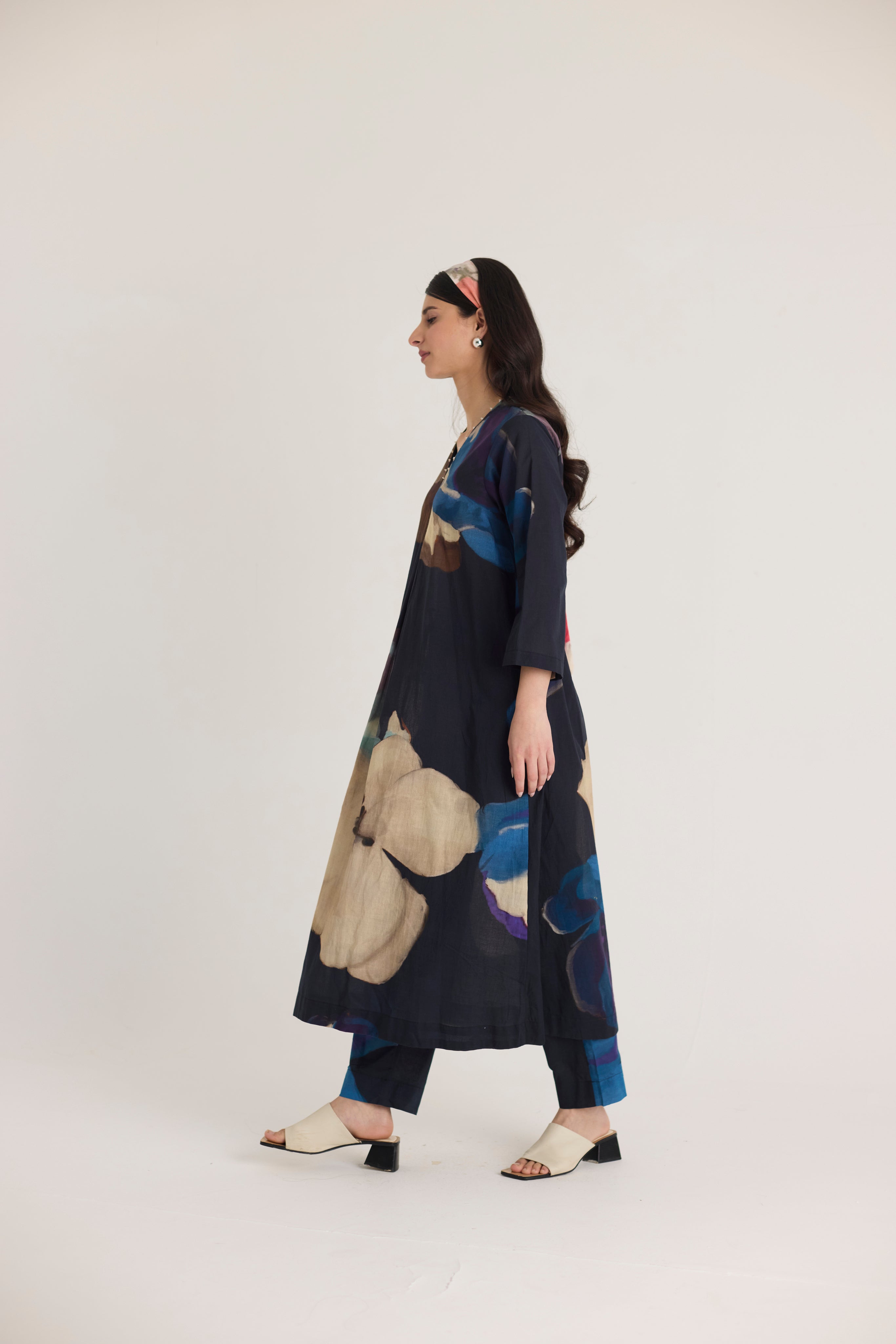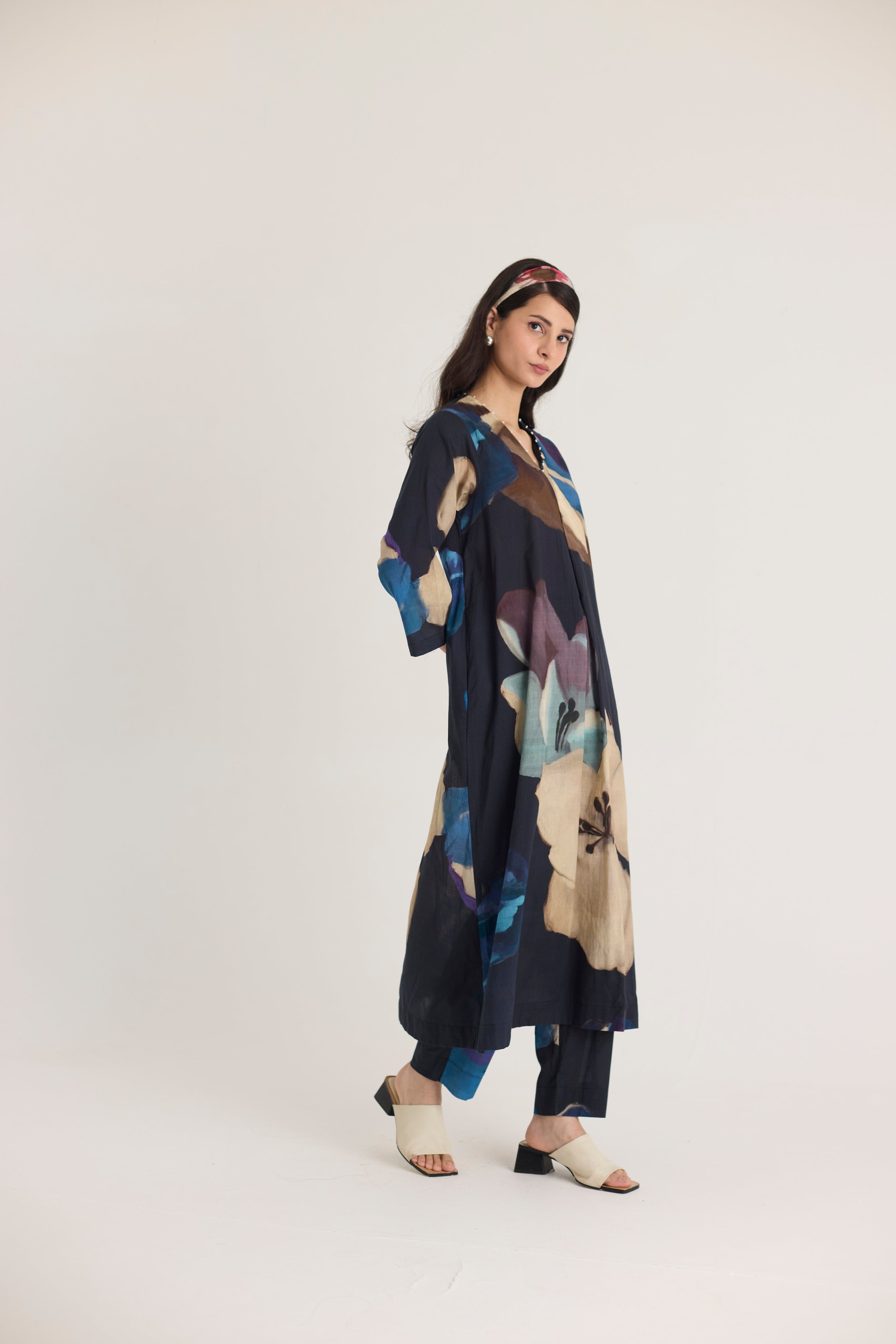 Embrace effortless elegance with this beautifully crafted kurta set, featuring an abstract floral print in deep, rich hues of midnight blue, beige, and purple. The flowy A-line kurta is designed with a V-neckline adorned with delicate embellishments, offering a touch of understated glamour. Paired with straight-fit trousers, this set strikes the perfect balance between comfort and sophistication.