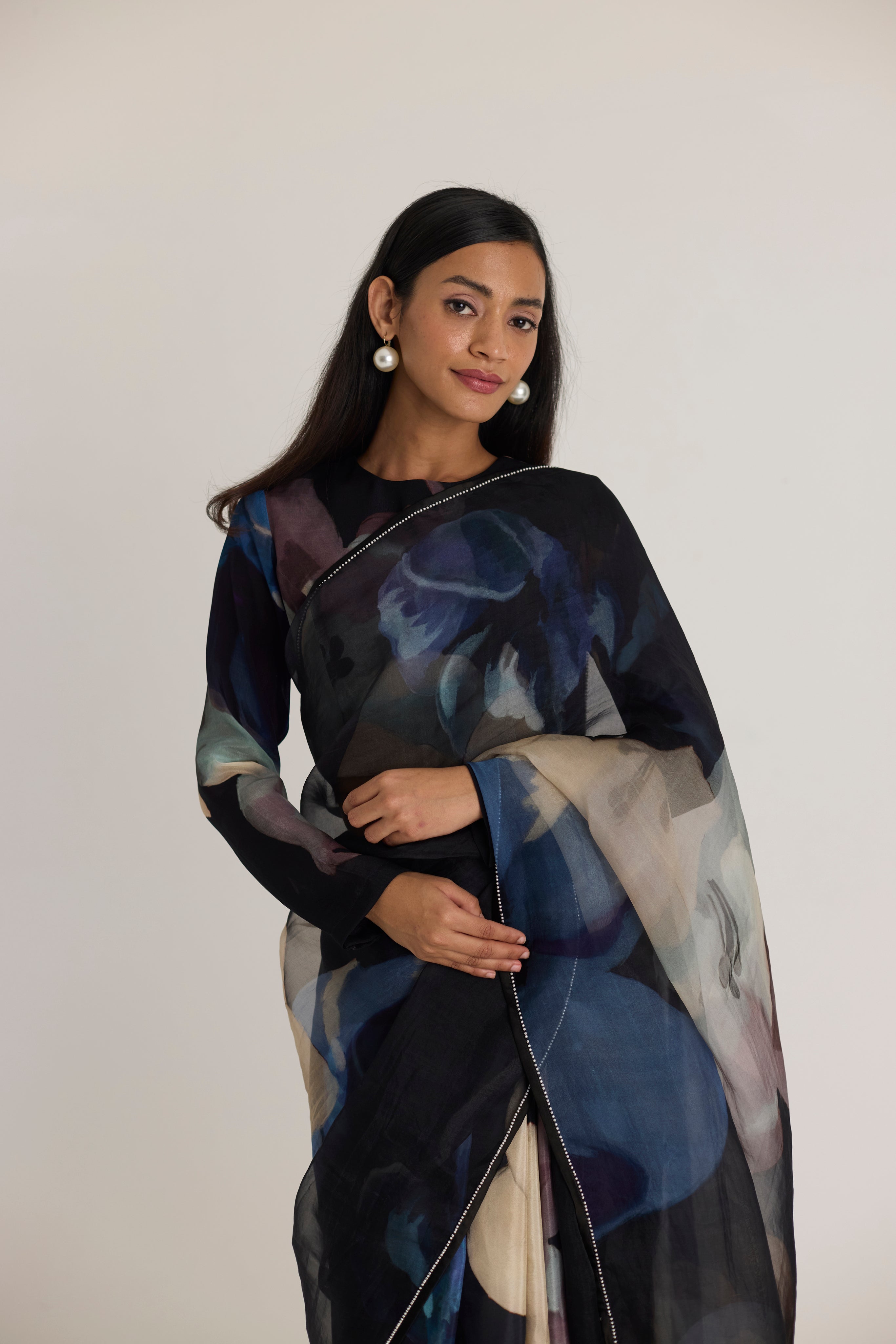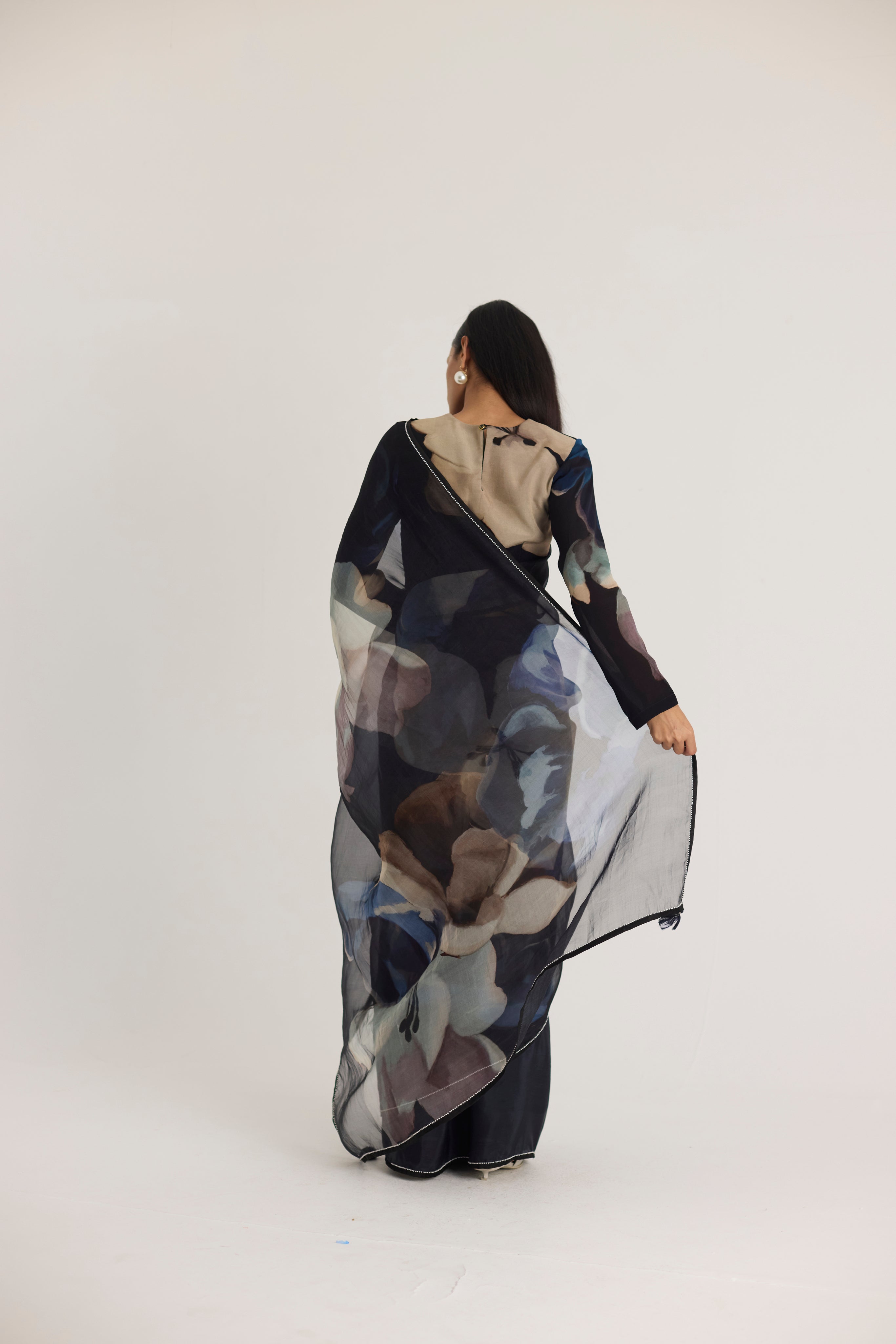 A stunning fusion of textures, this saree is designed for modern elegance. The pleats are crafted from luxurious pure silk, offering a rich, structured drape, while the palla flows in airy organza, creating an ethereal contrast. The abstract floral print in deep blues, blacks, and neutrals adds a touch of artistic sophistication, making it a timeless statement piece.