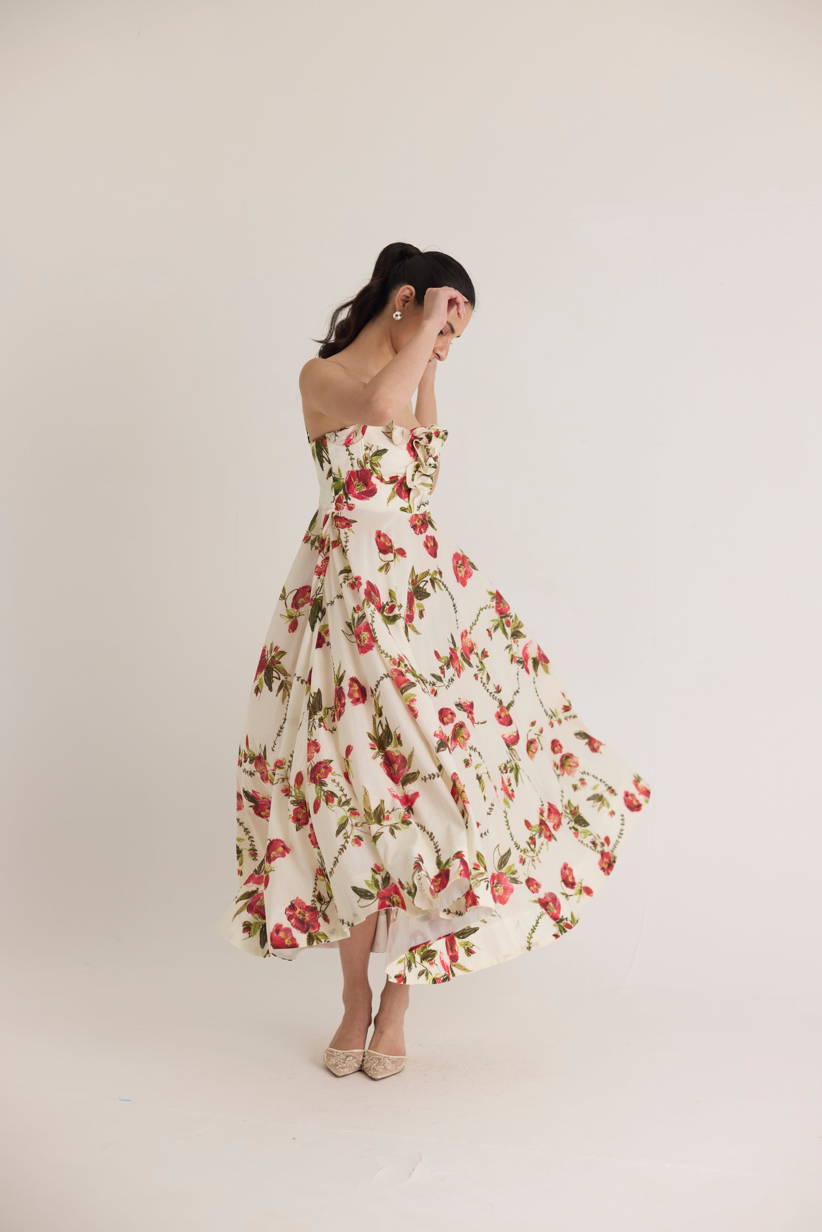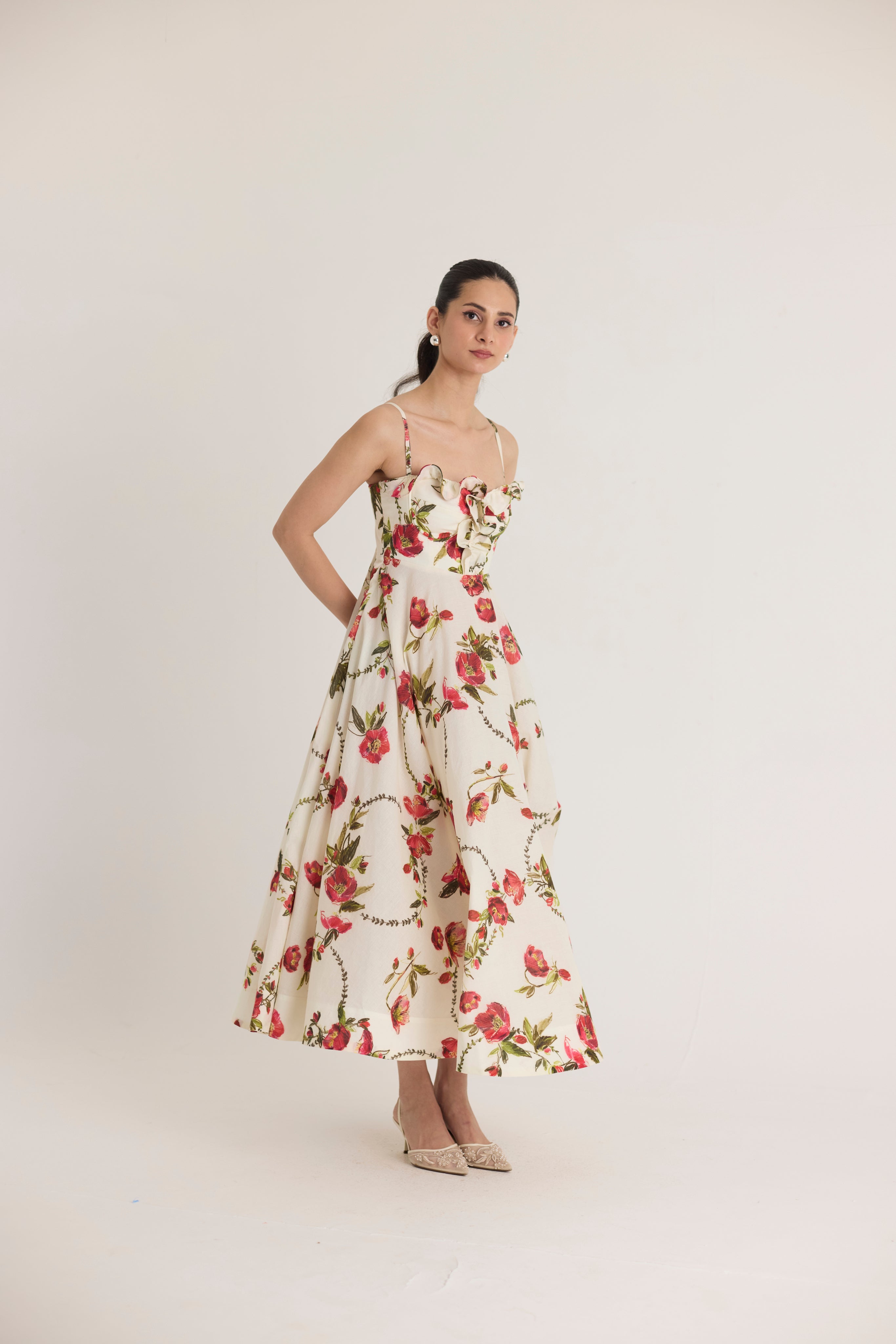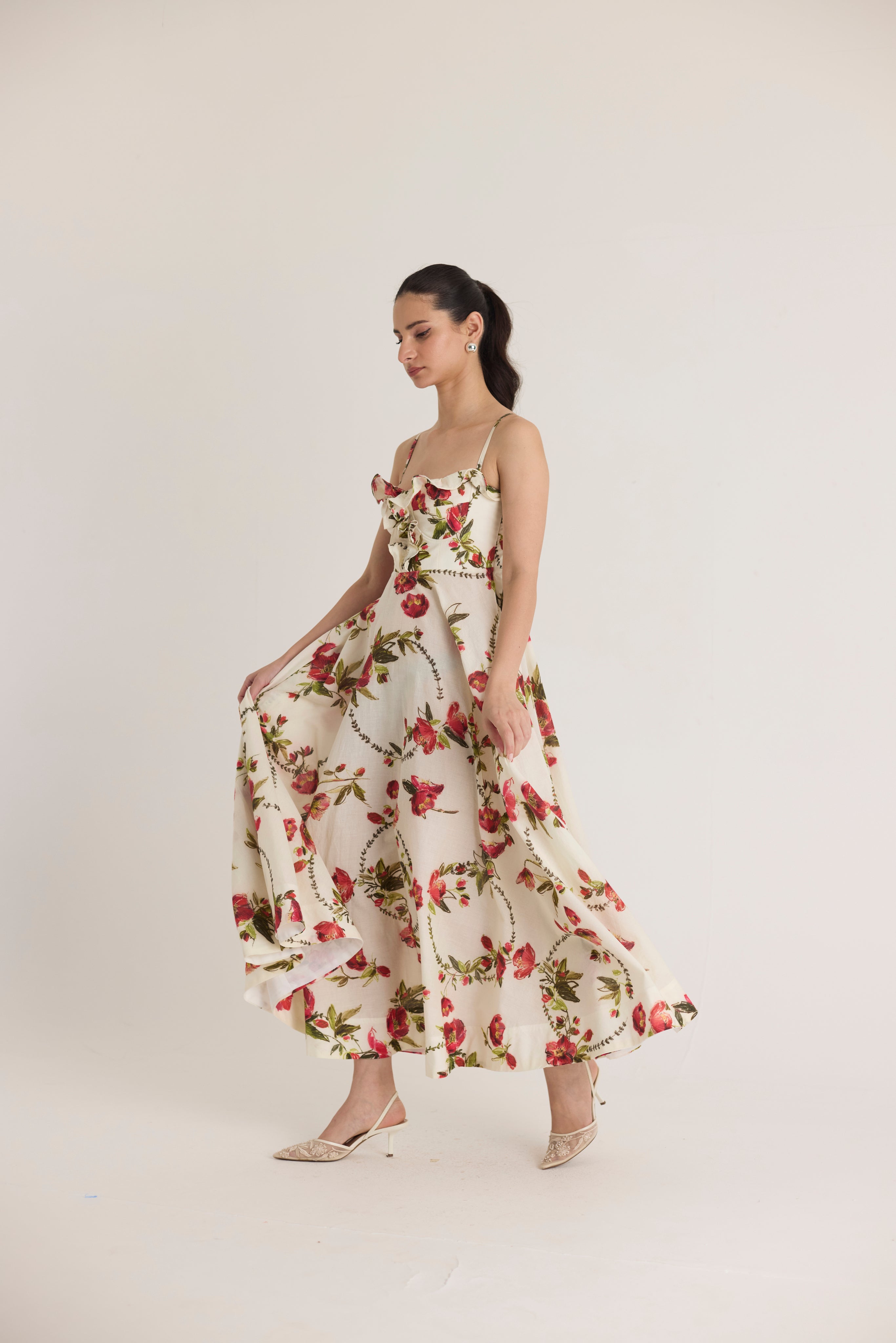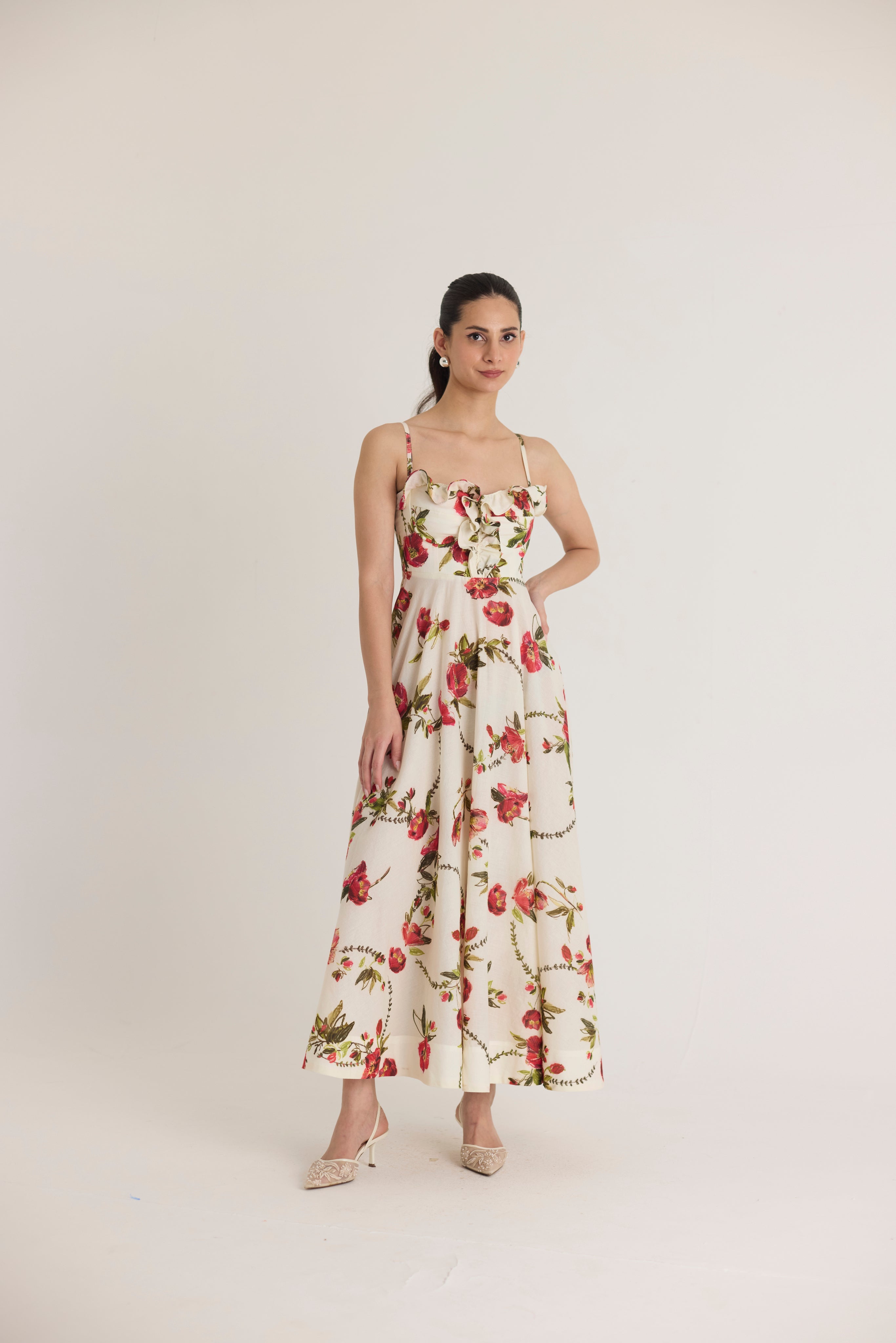 Adorned with a vibrant floral print on a soft ivory base, this dress features blooming red flowers with lush green foliage, creating a fresh and romantic aesthetic.