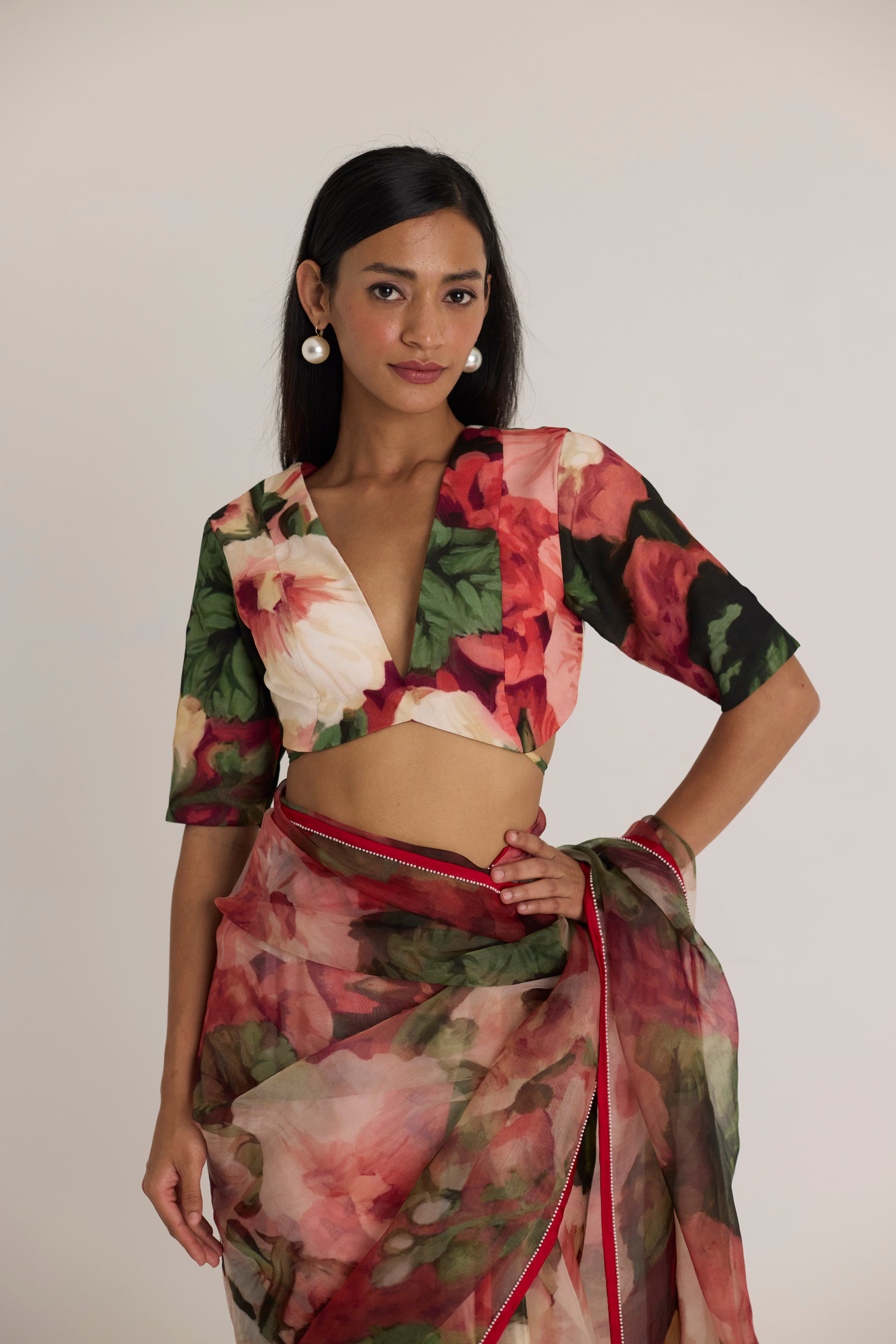 This statement floral print blouse is a modern take on traditional elegance. Designed with a deep V-neckline at the front and a bold open-back cut, it offers a striking balance of sophistication and allure. The vibrant rose-inspired print in red, pink, and green adds a fresh, romantic charm to any ensemble. Finished with tie-up detailing at the back for a secure yet stylish fit, this blouse is a versatile piece that complements both sarees and lehengas.