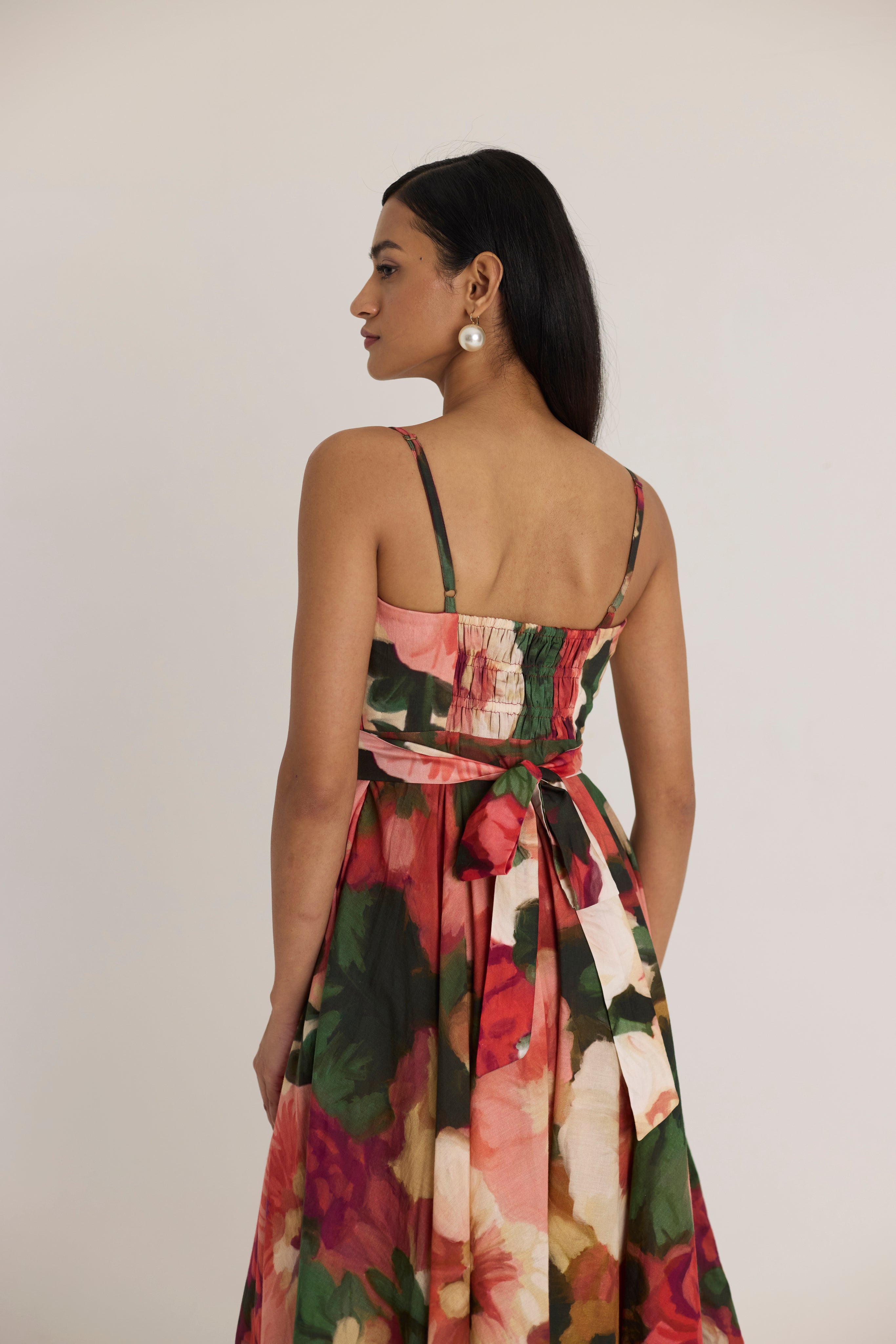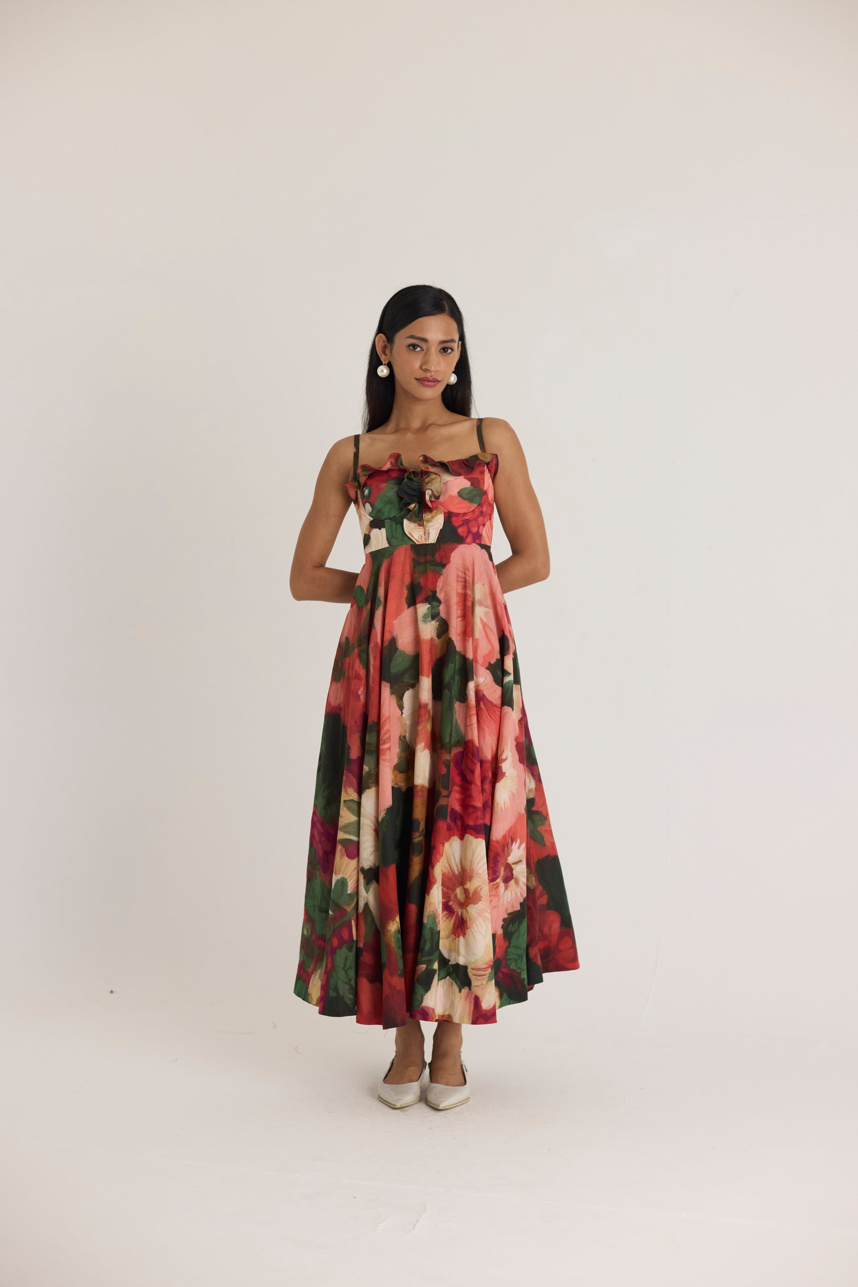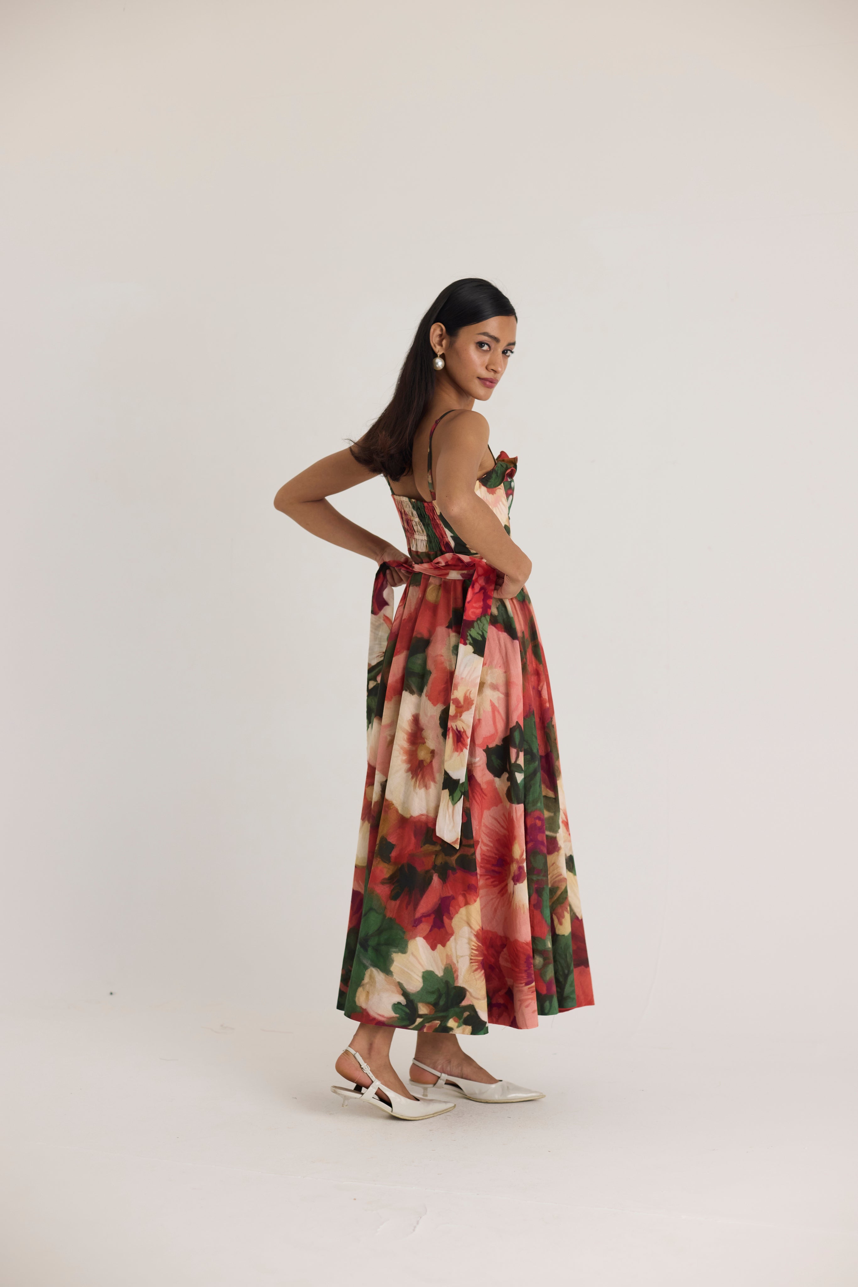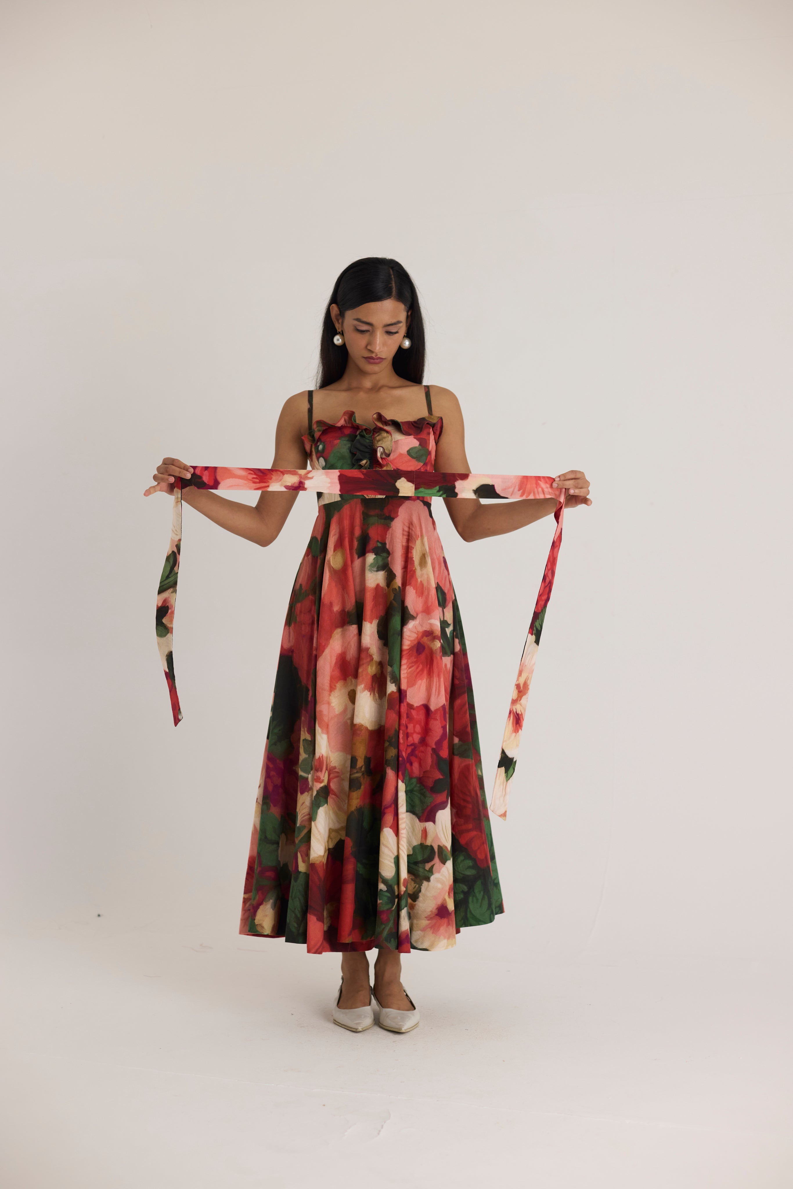 A beautifully feminine floral-print maxi dress featuring vibrant red, pink, and green hues. The romantic silhouette is enhanced by a fitted bodice with delicate ruffle detailing at the neckline, adjustable spaghetti straps, and a smocked back for a perfect fit. A cinched waist with a self-tie bow at the back flows into a voluminous, pleated skirt for effortless elegance.