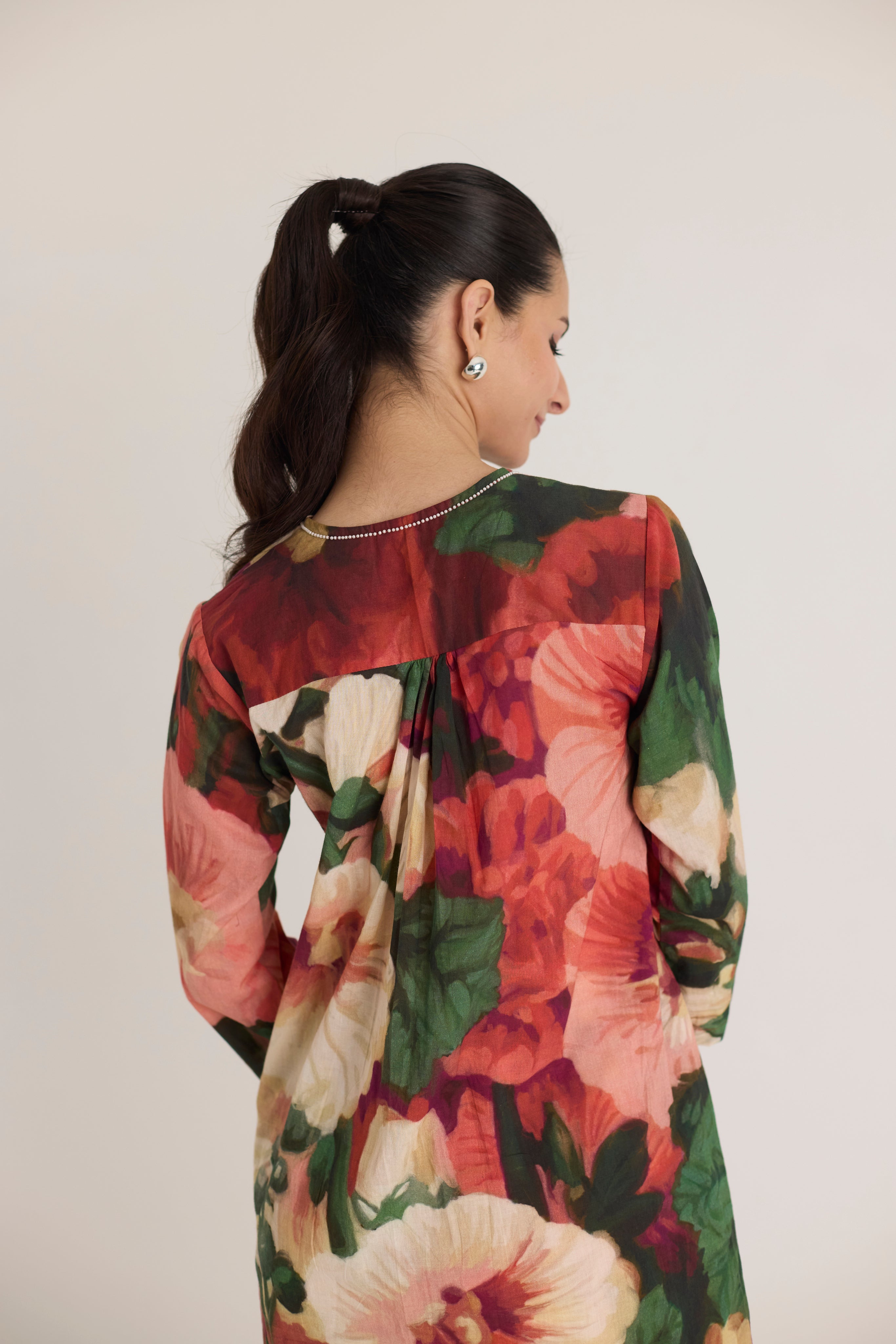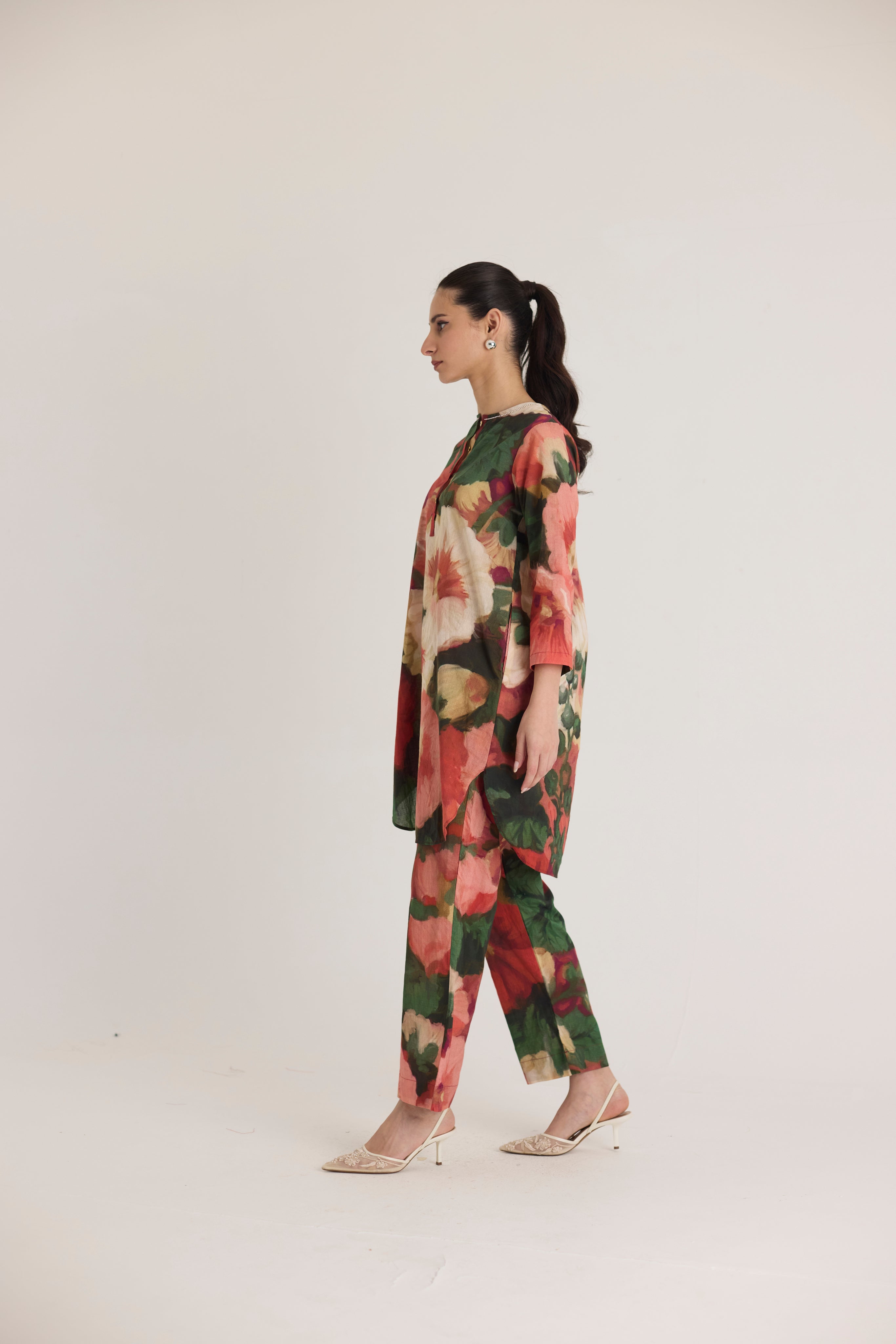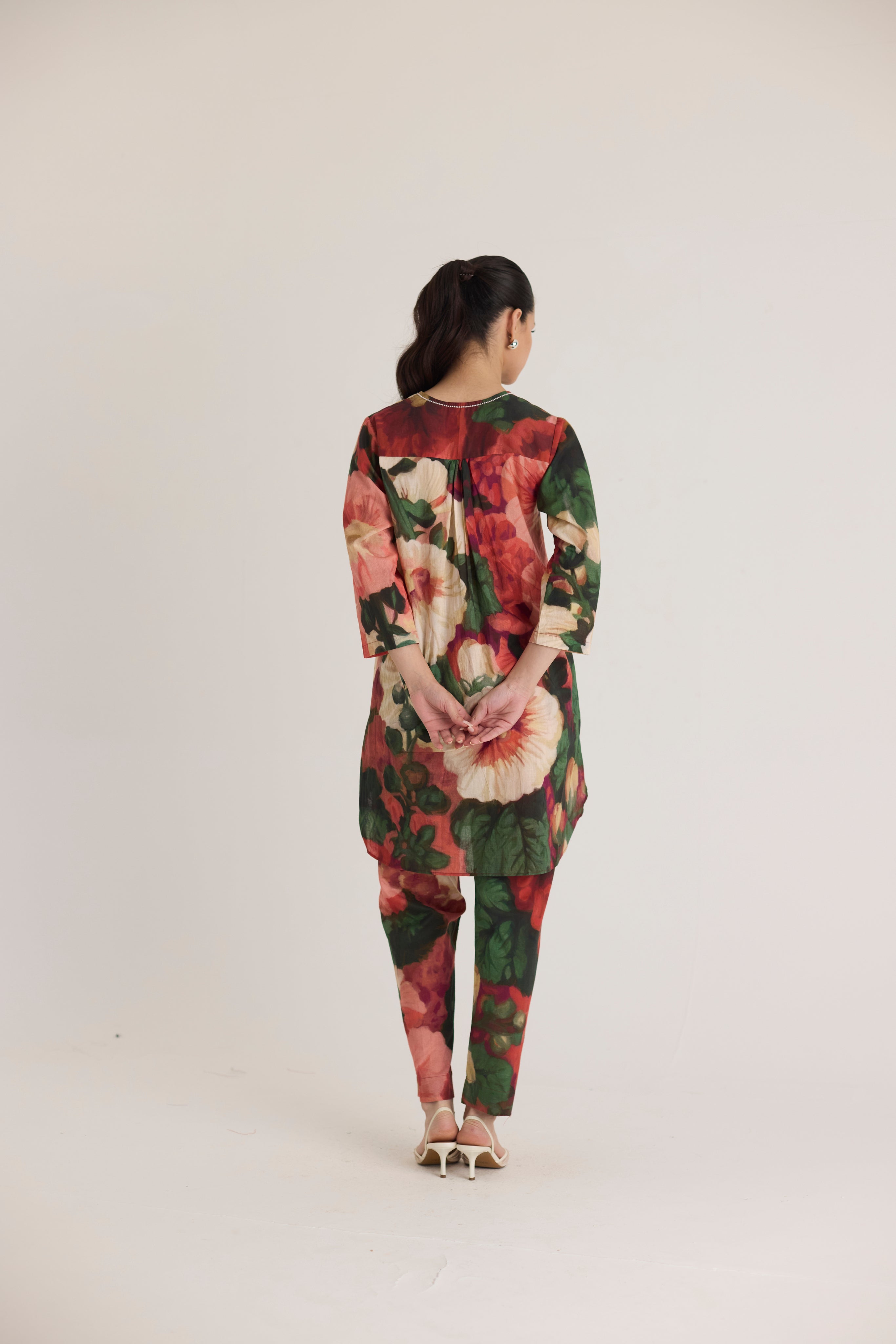A vibrant floral-printed Kurta set featuring a relaxed fit tunic and matching straight-leg pants. This ensemble is crafted from a lightweight, breathable fabric, perfect for effortless elegance.