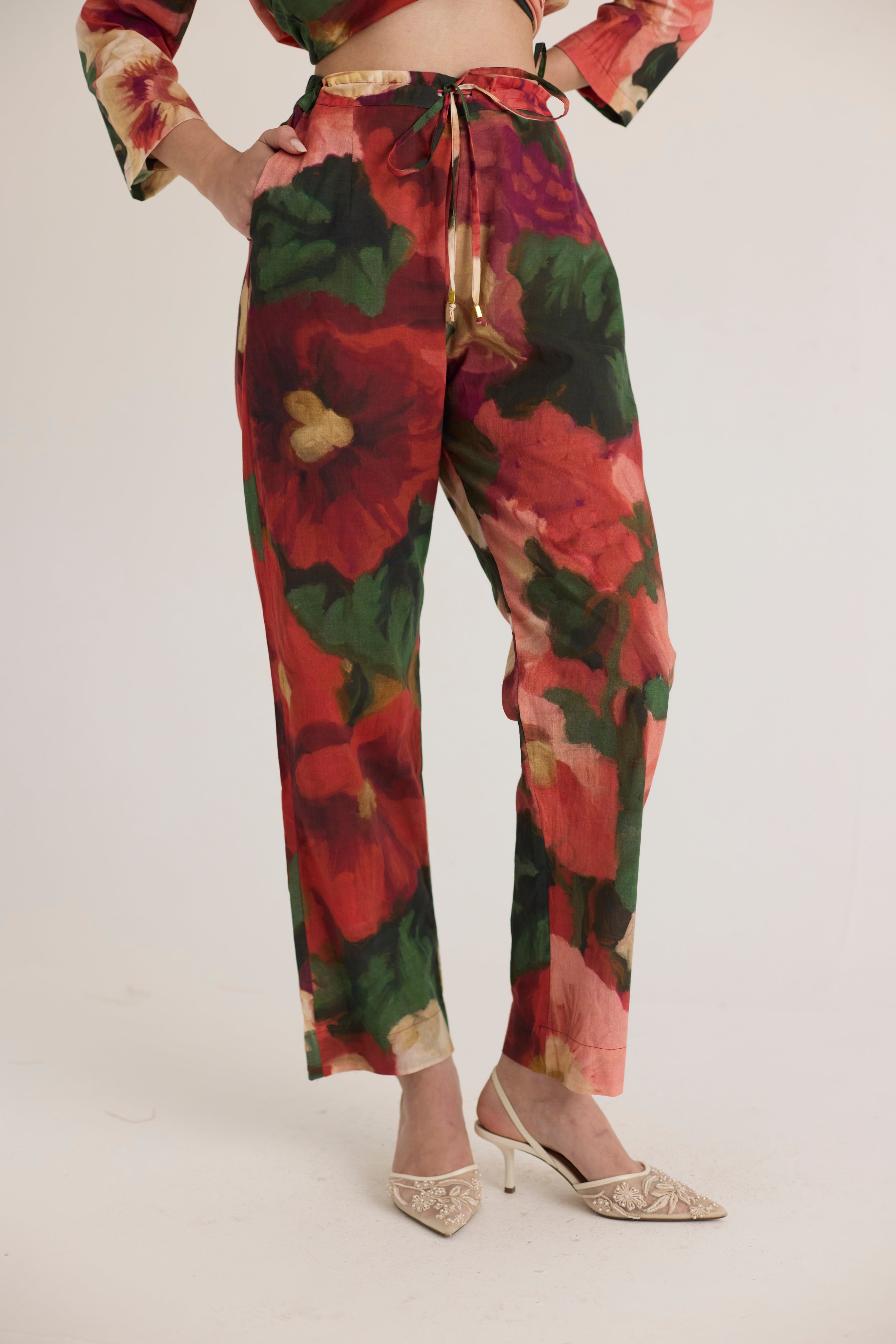 The print showcases oversized painterly florals in warm hues of red, green, and cream, adding a bold and artistic touch to the outfit.