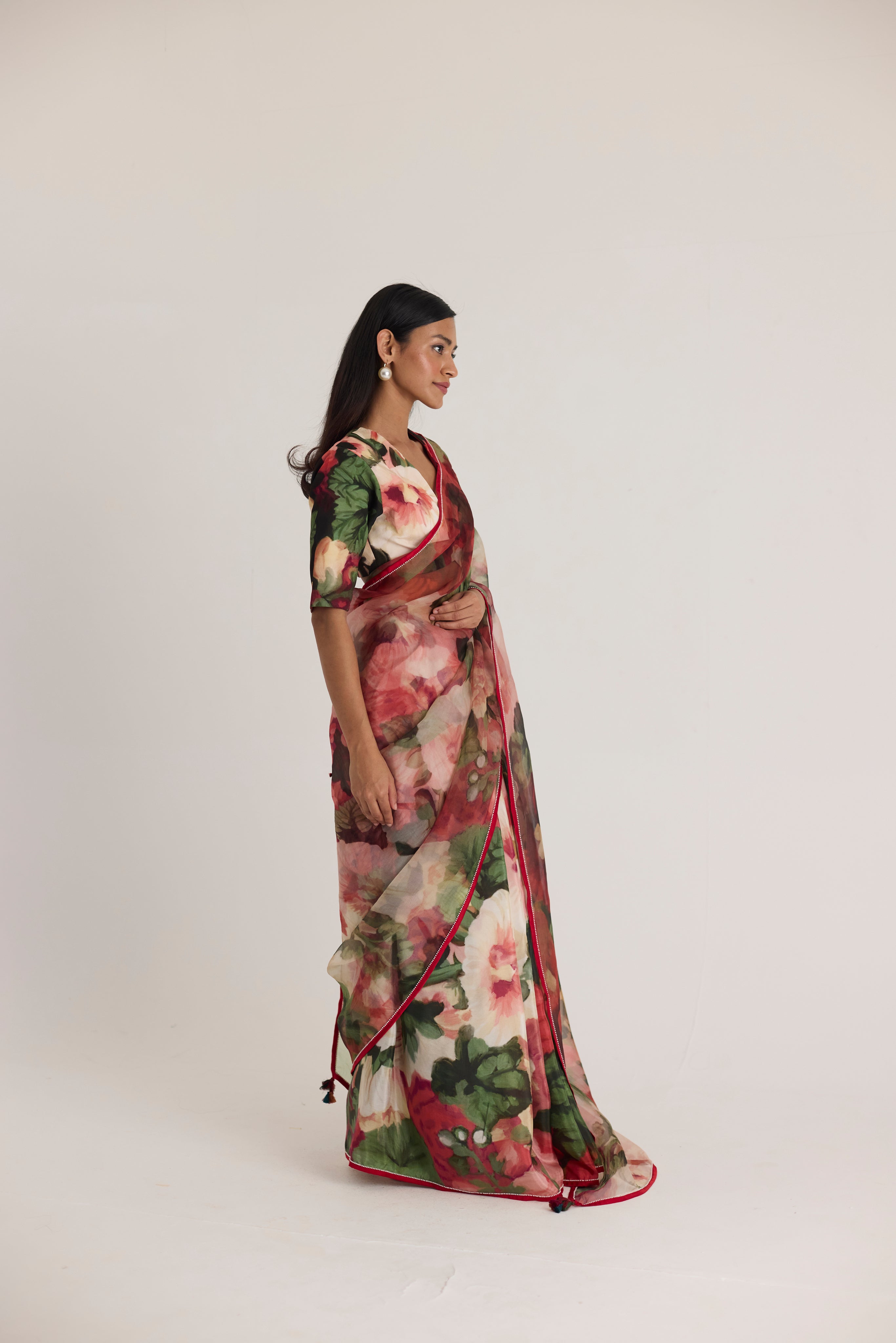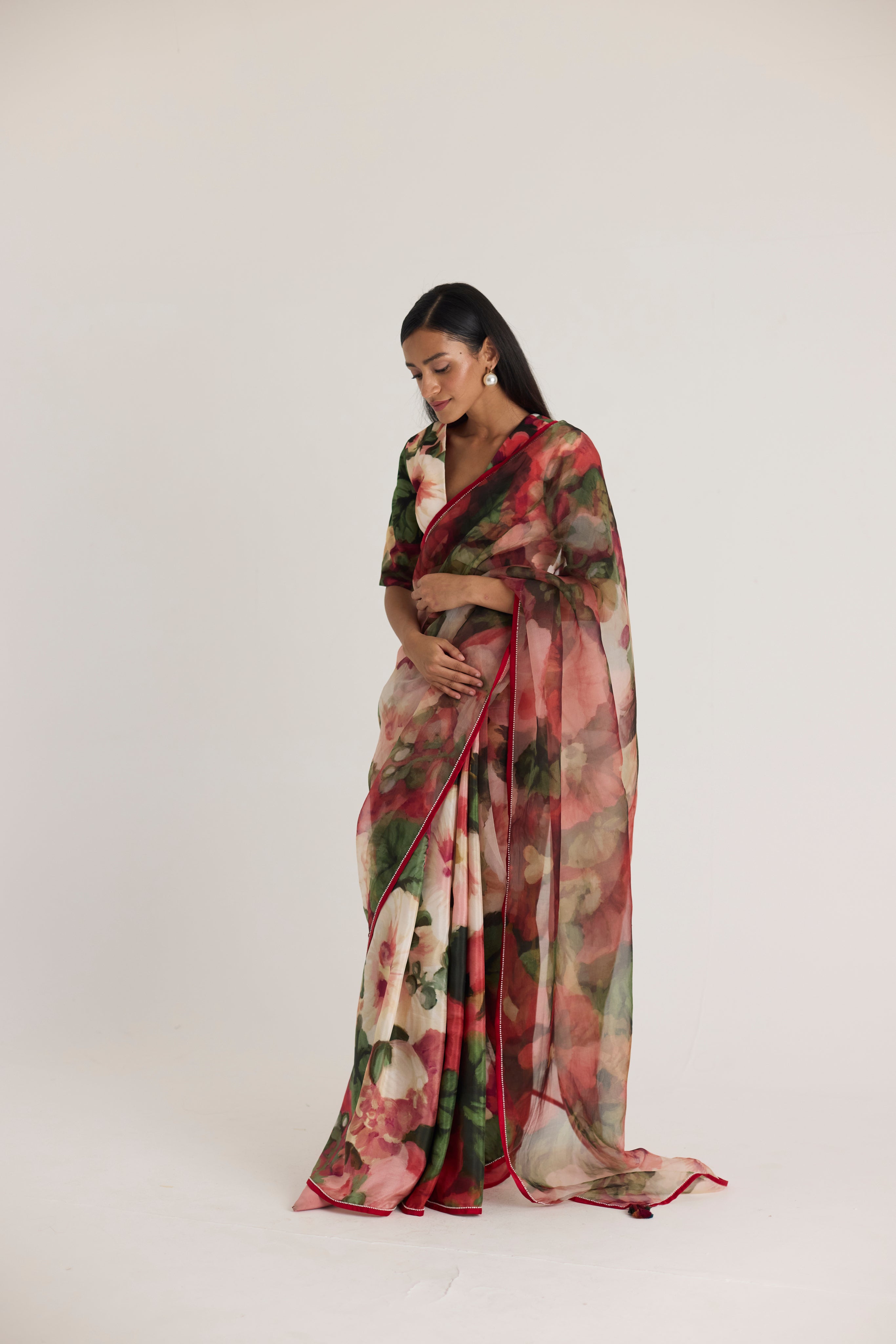 A dreamy, ethereal saree featuring a sheer fabric adorned with a painterly floral print in deep reds, pinks, and lush greens. The fluid drape and delicate red piping along the edges add to its timeless elegance, making it a versatile choice for both festive and formal occasions.