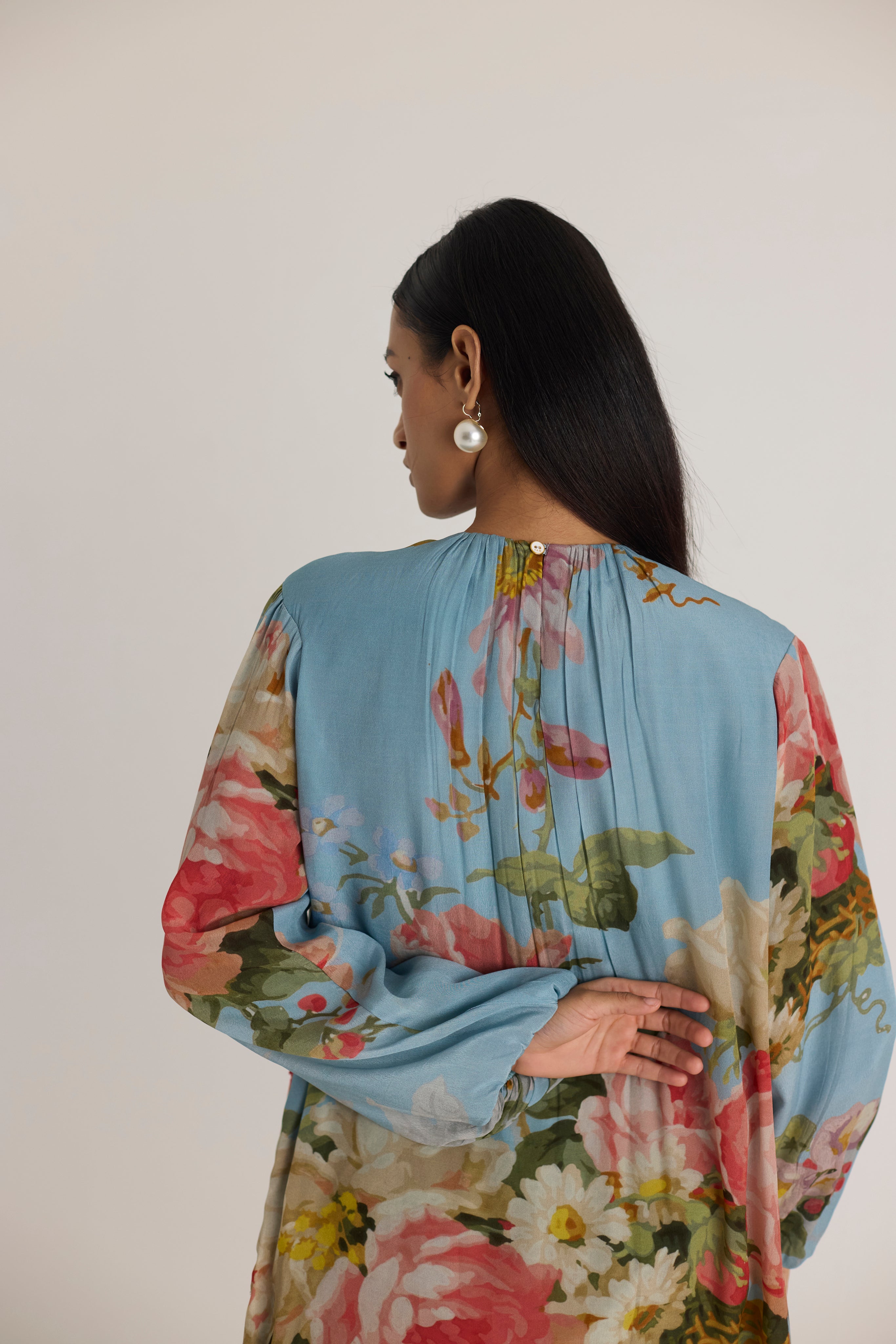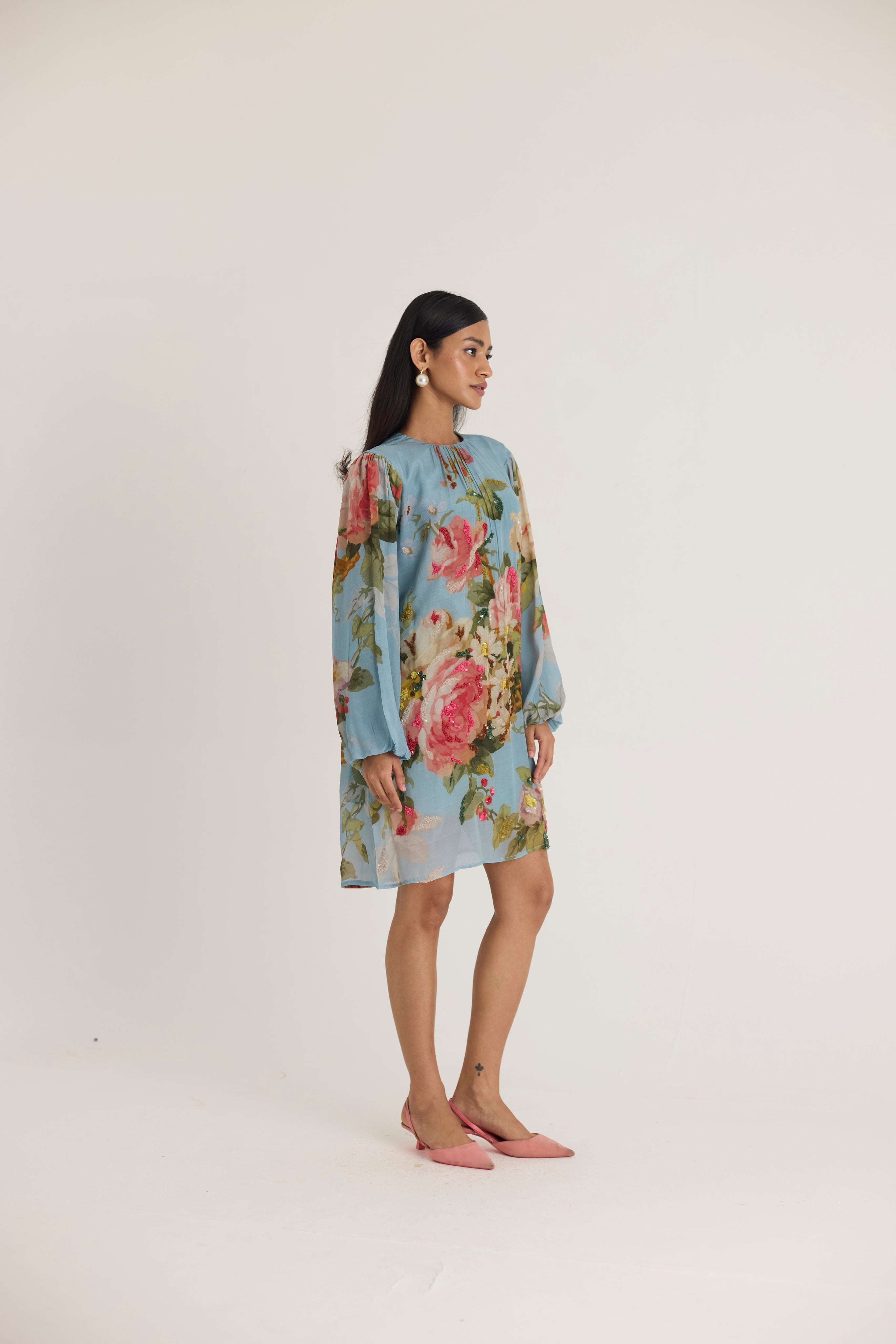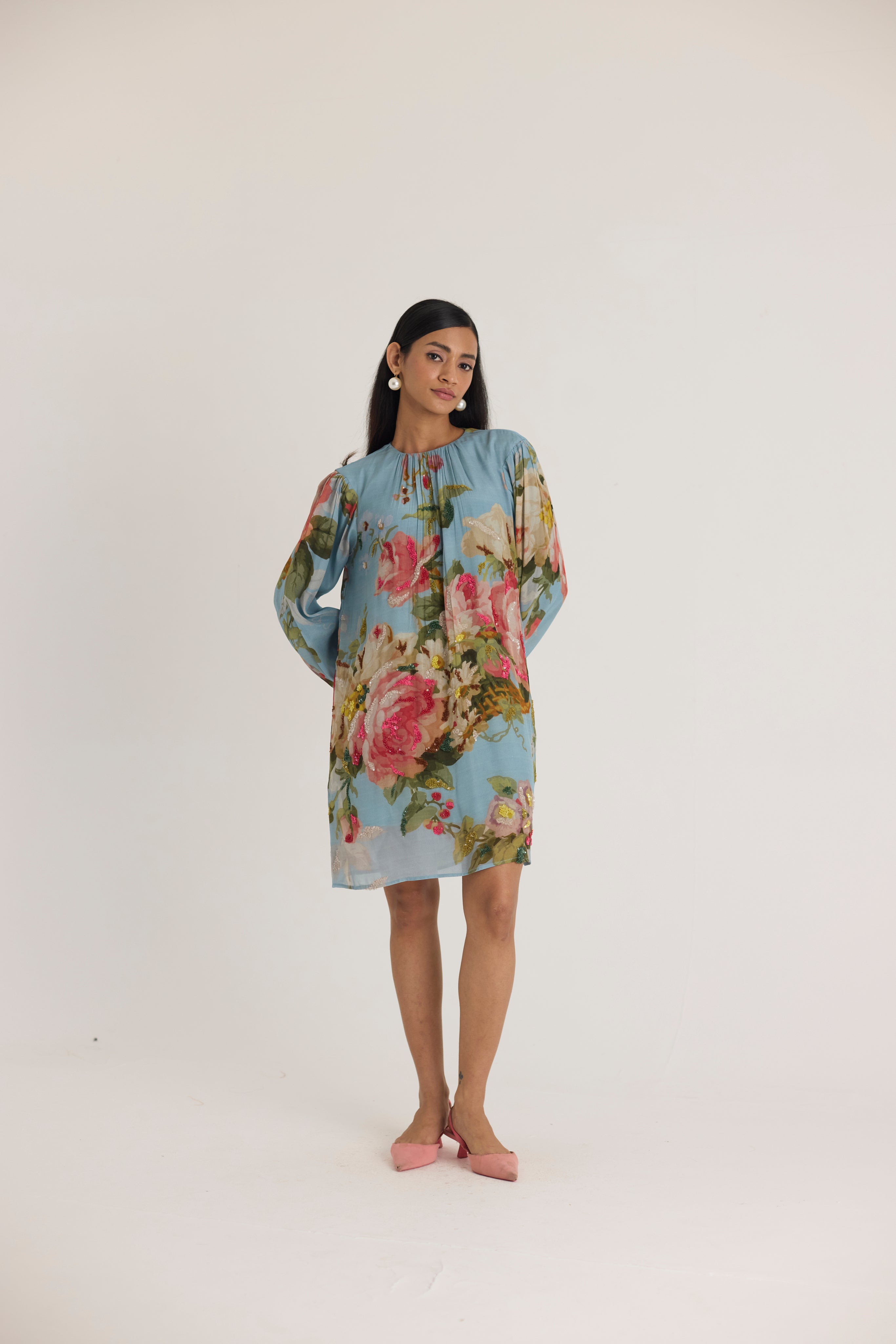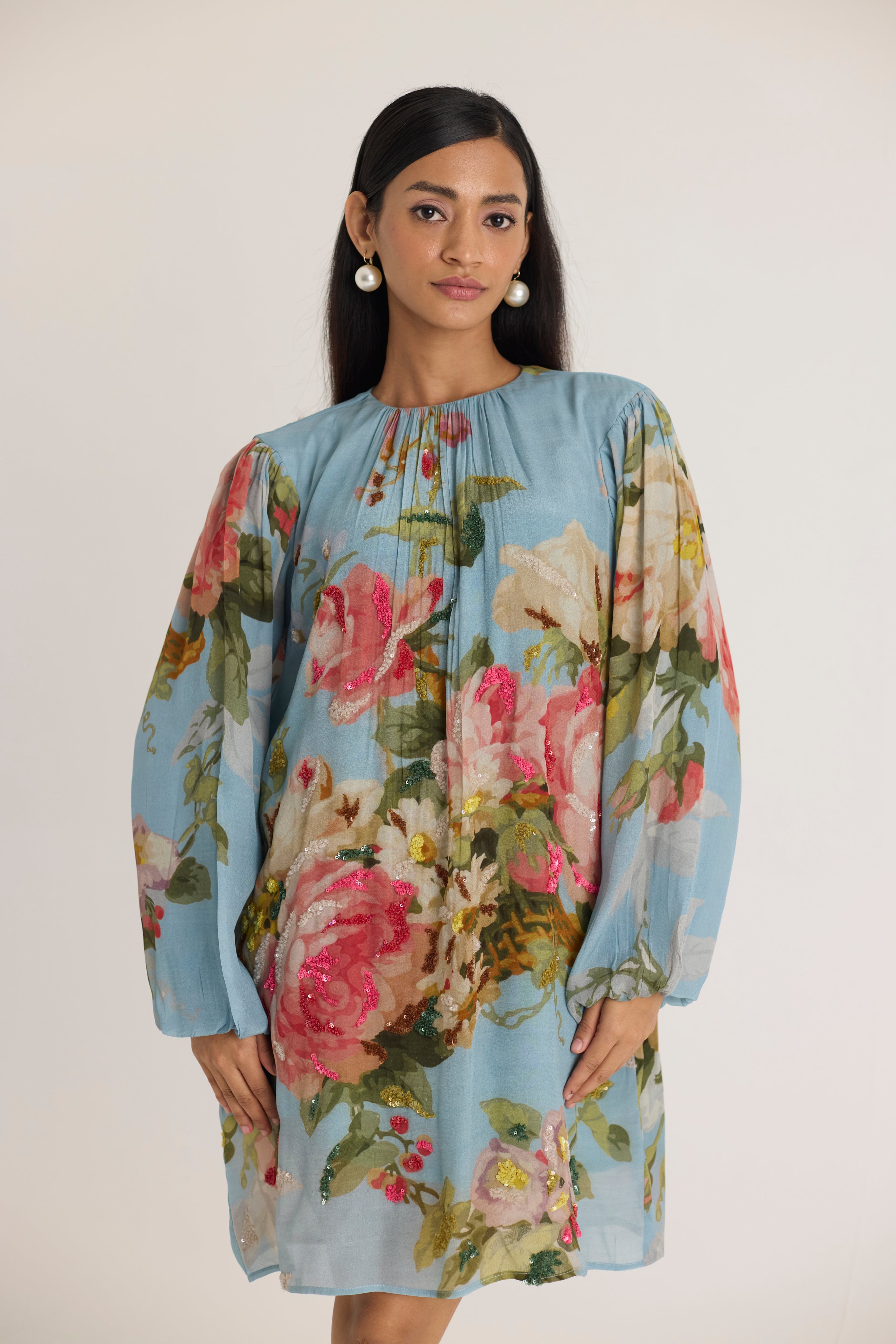 Step into effortless elegance with this Floral Breeze Mini Dress, crafted in a delicate sky blue base with blooming floral prints. adorned with oversized watercolor floral prints, evoking a sense of vintage charm and effortless grace. The print features lush blossoms in shades of blush pink, ivory, and green, giving the dress a delicate, hand-painted feel. Featuring a relaxed silhouette, billowing sleeves, and a softly gathered neckline, this dress embodies grace and comfort.