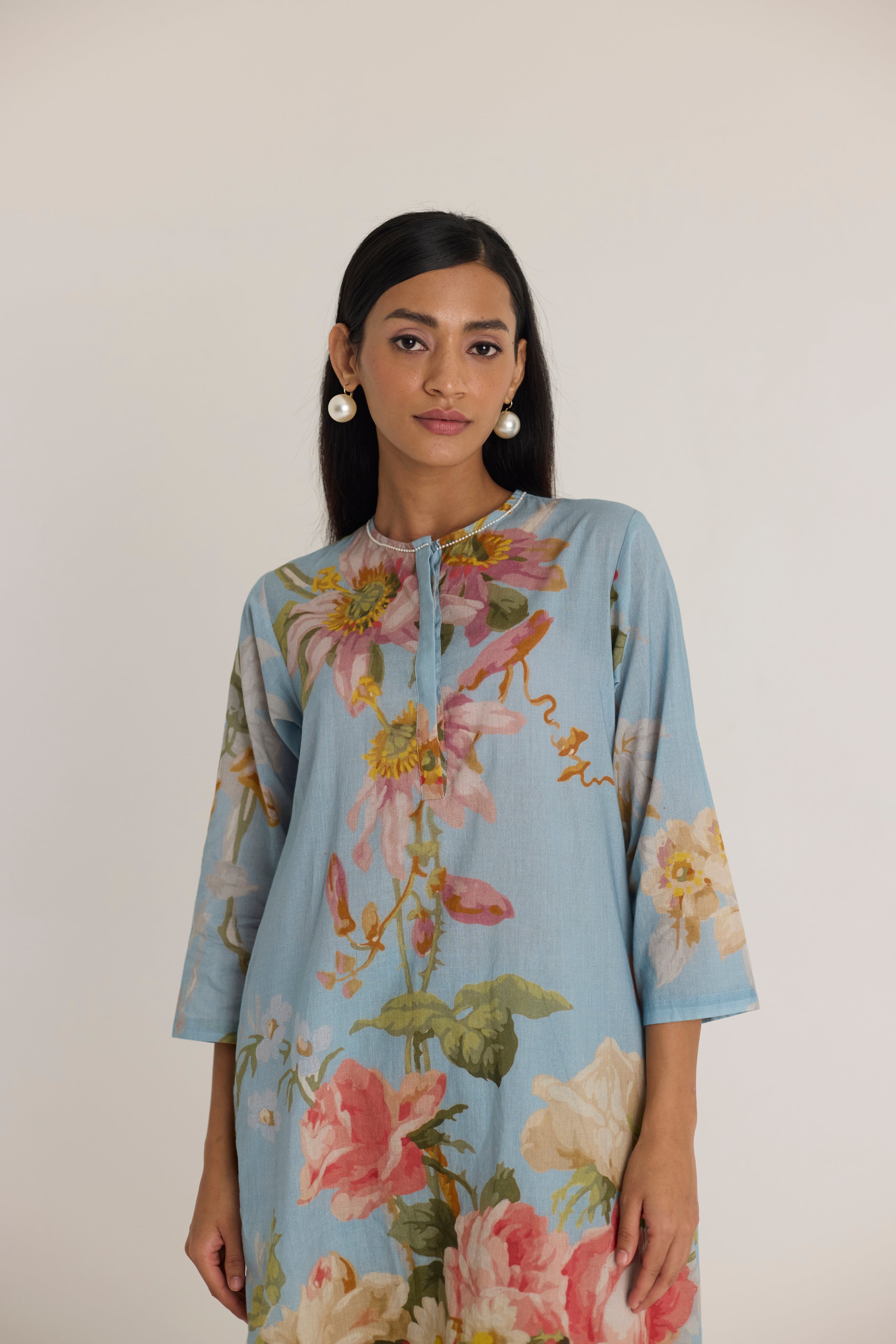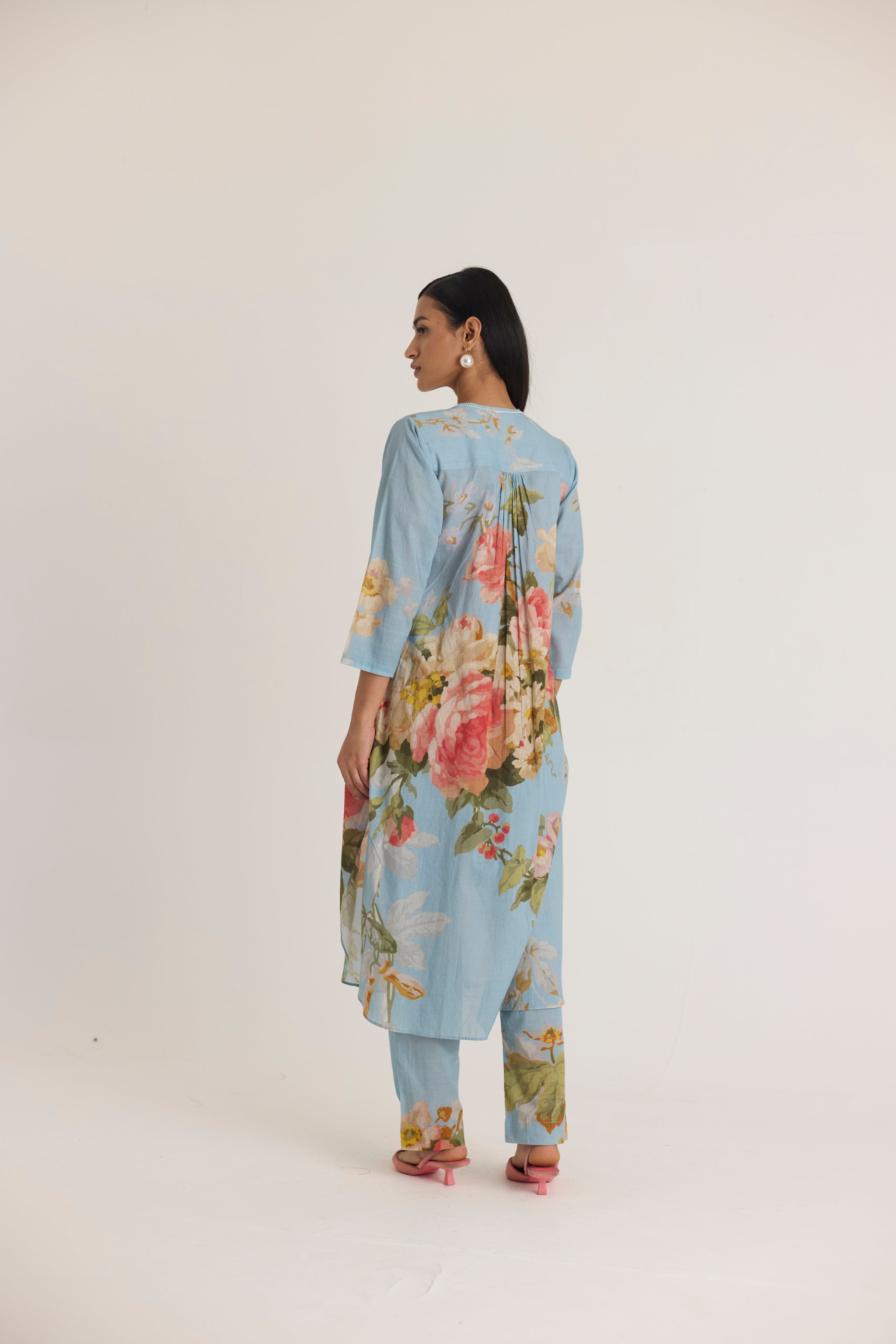 Step into effortless elegance with this beautifully crafted sky blue kurta set, adorned with delicate floral prints that exude grace and charm. Designed for the modern woman who appreciates comfort and style, this ensemble is perfect for both casual gatherings and festive occasions.