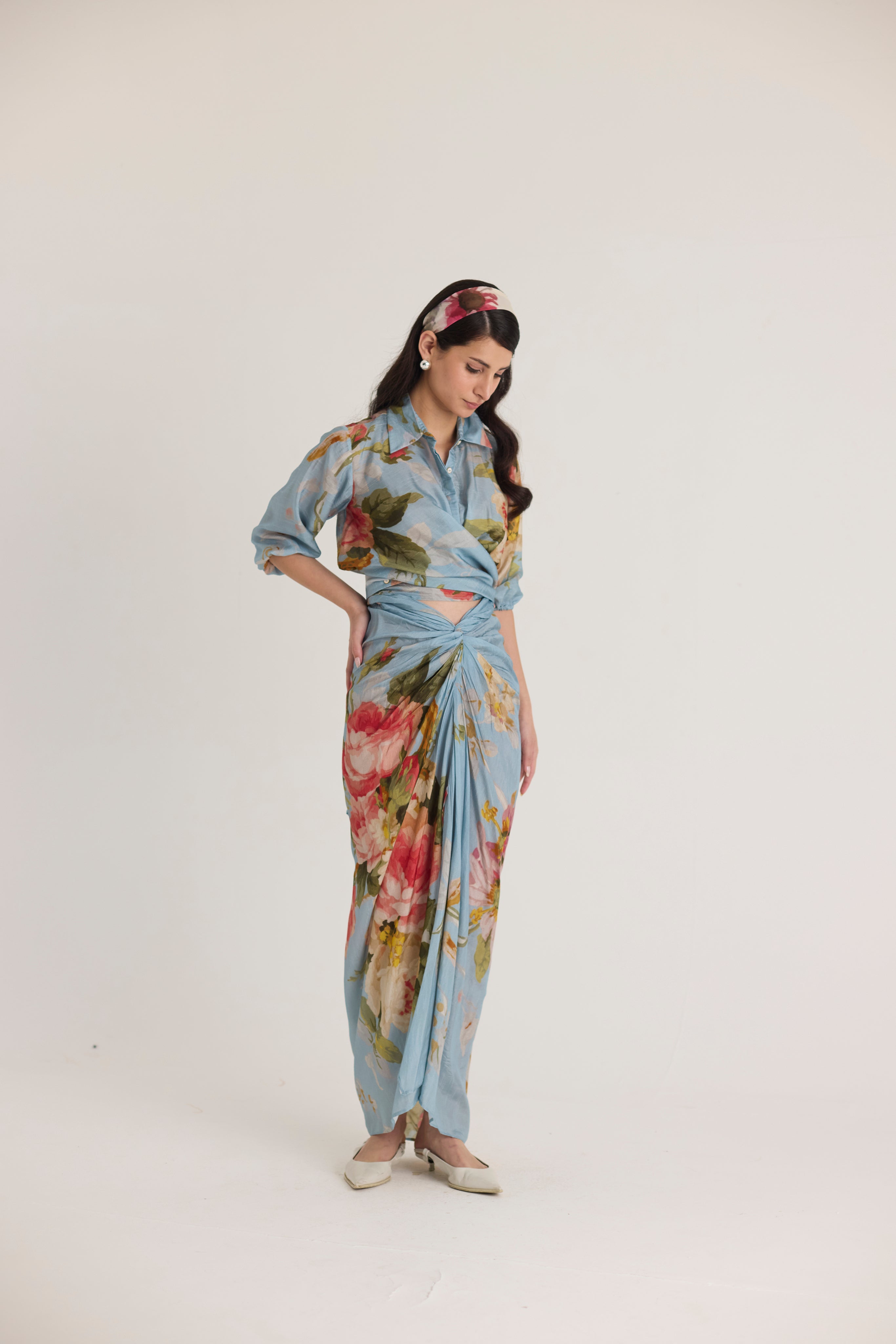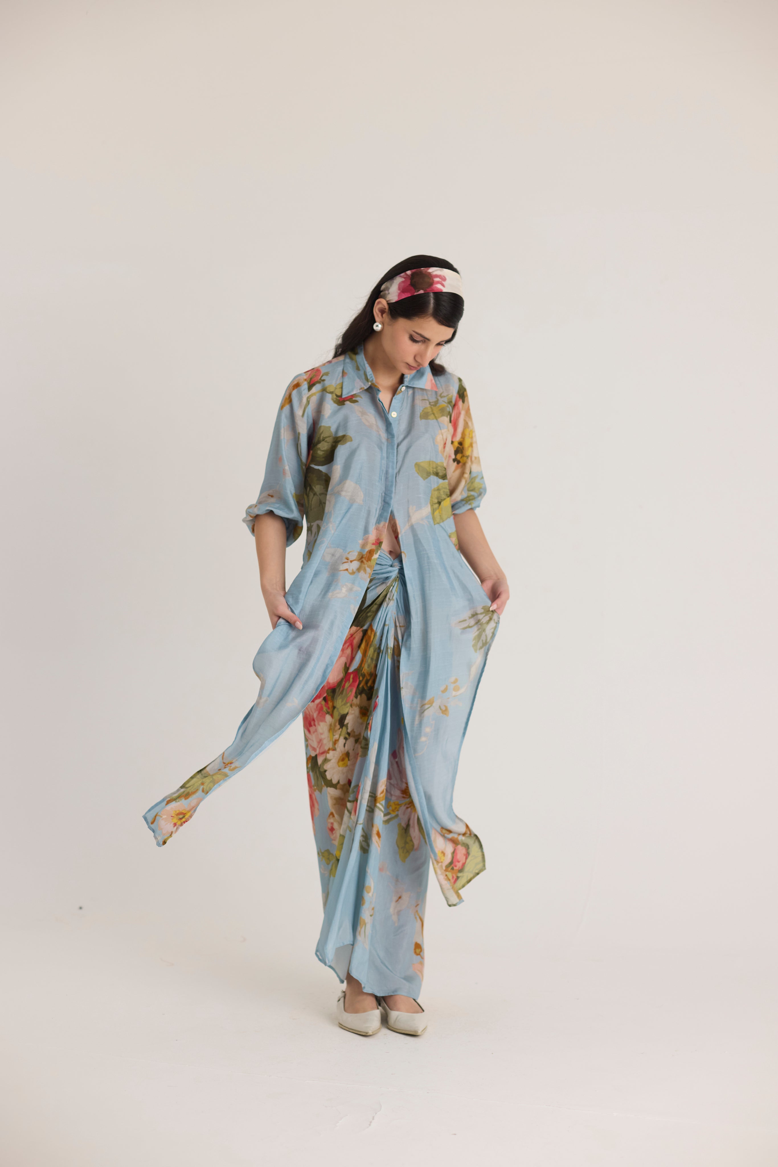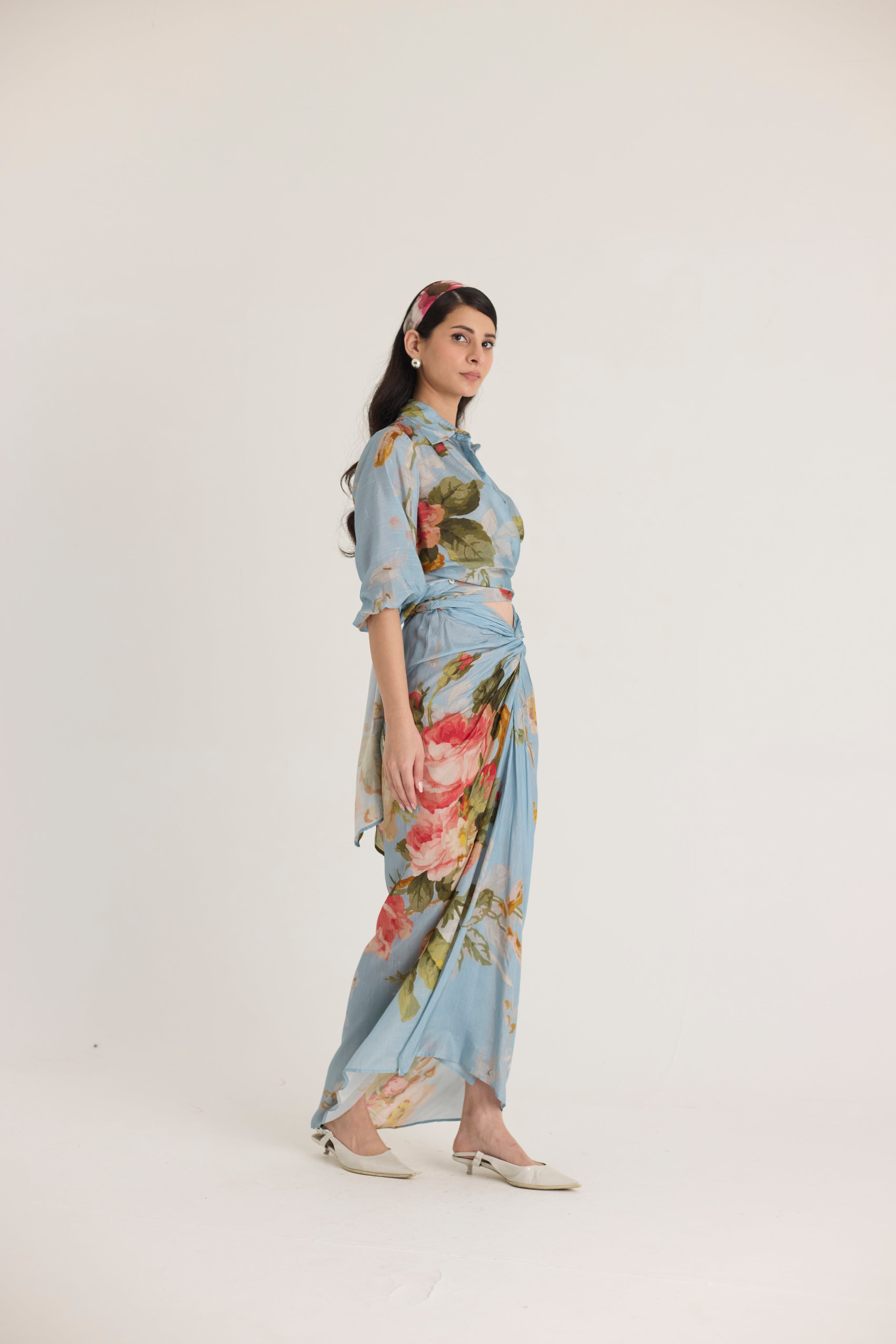 Elevate your style with this chic floral set, featuring a structured collared shirt and a gracefully draped skirt. Designed in a soft sky blue hue with romantic floral prints, this set blends sophistication with modern femininity, making it perfect for special occasions and statement dressing.