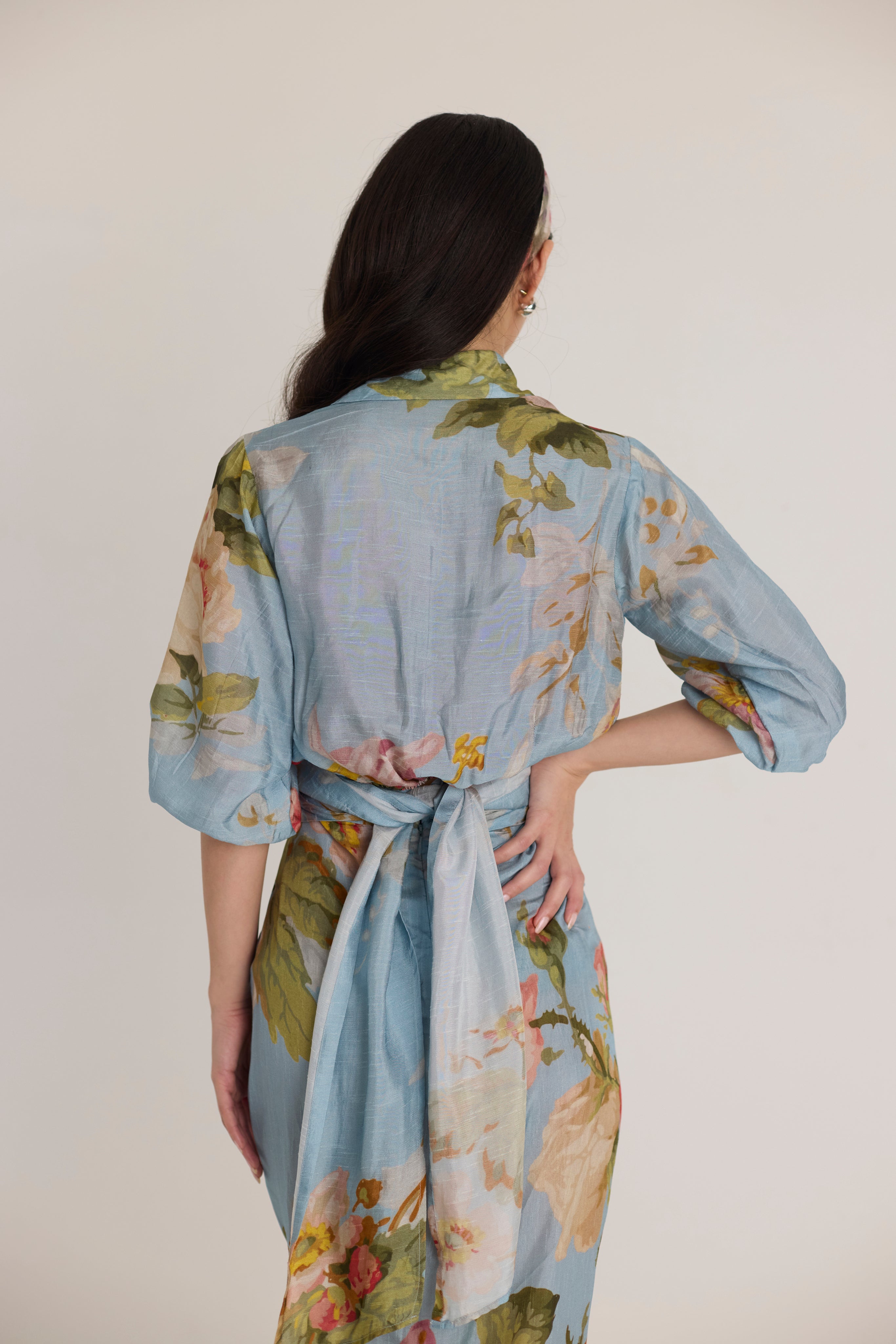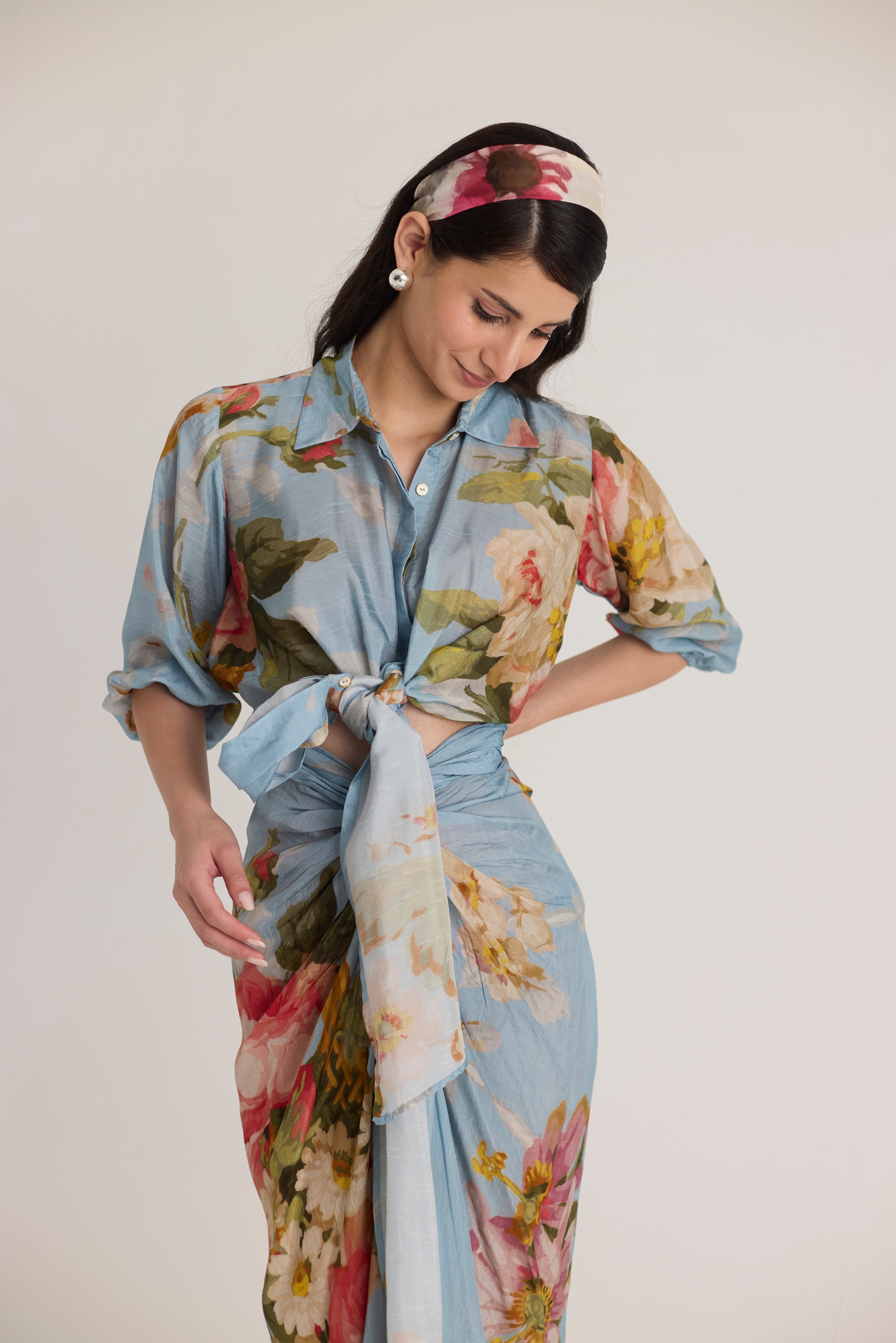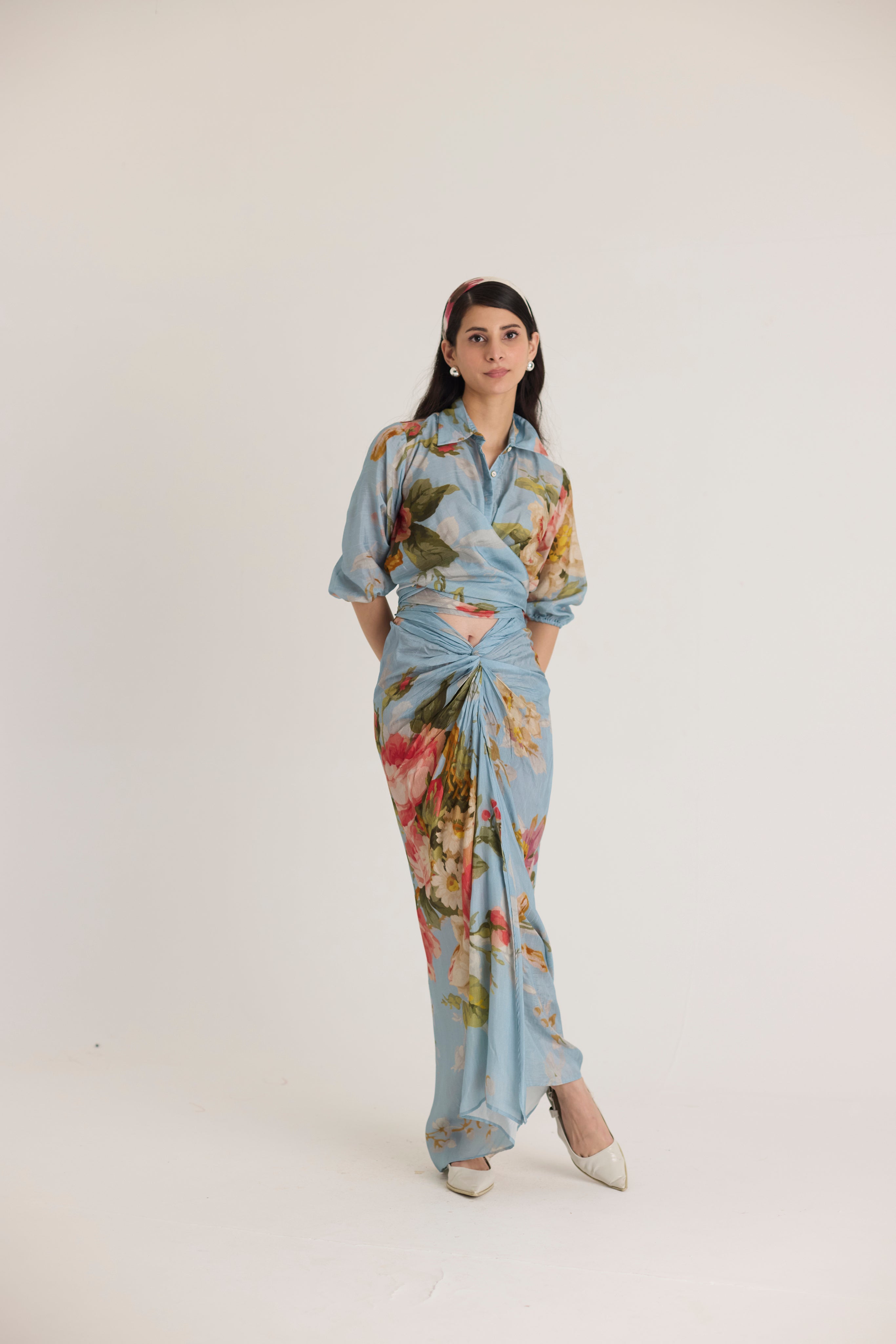 Elevate your style with this chic floral set, featuring a structured collared shirt and a gracefully draped skirt. Designed in a soft sky blue hue with romantic floral prints, this set blends sophistication with modern femininity, making it perfect for special occasions and statement dressing.