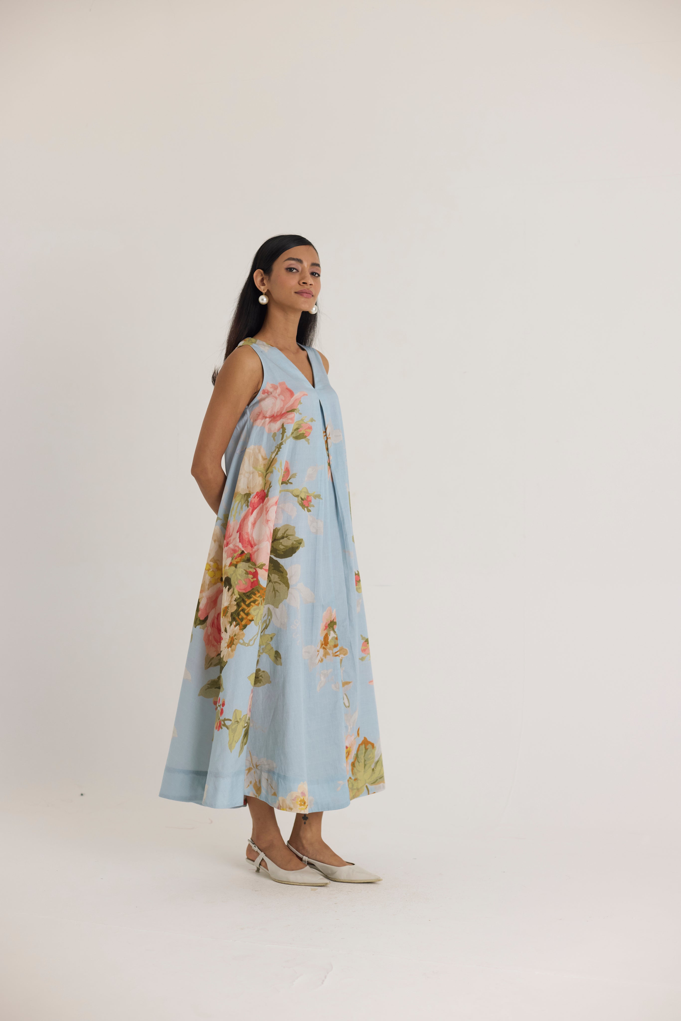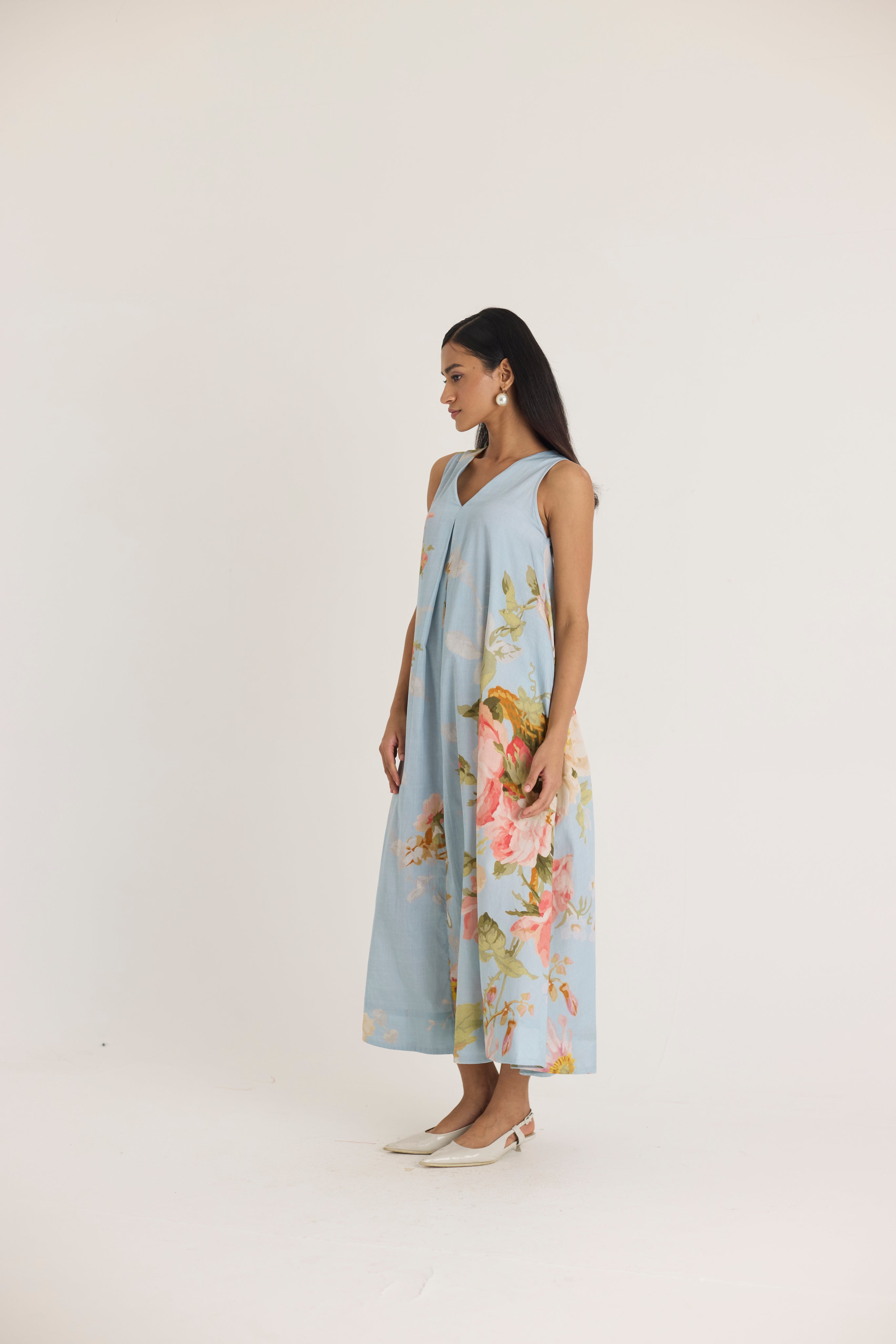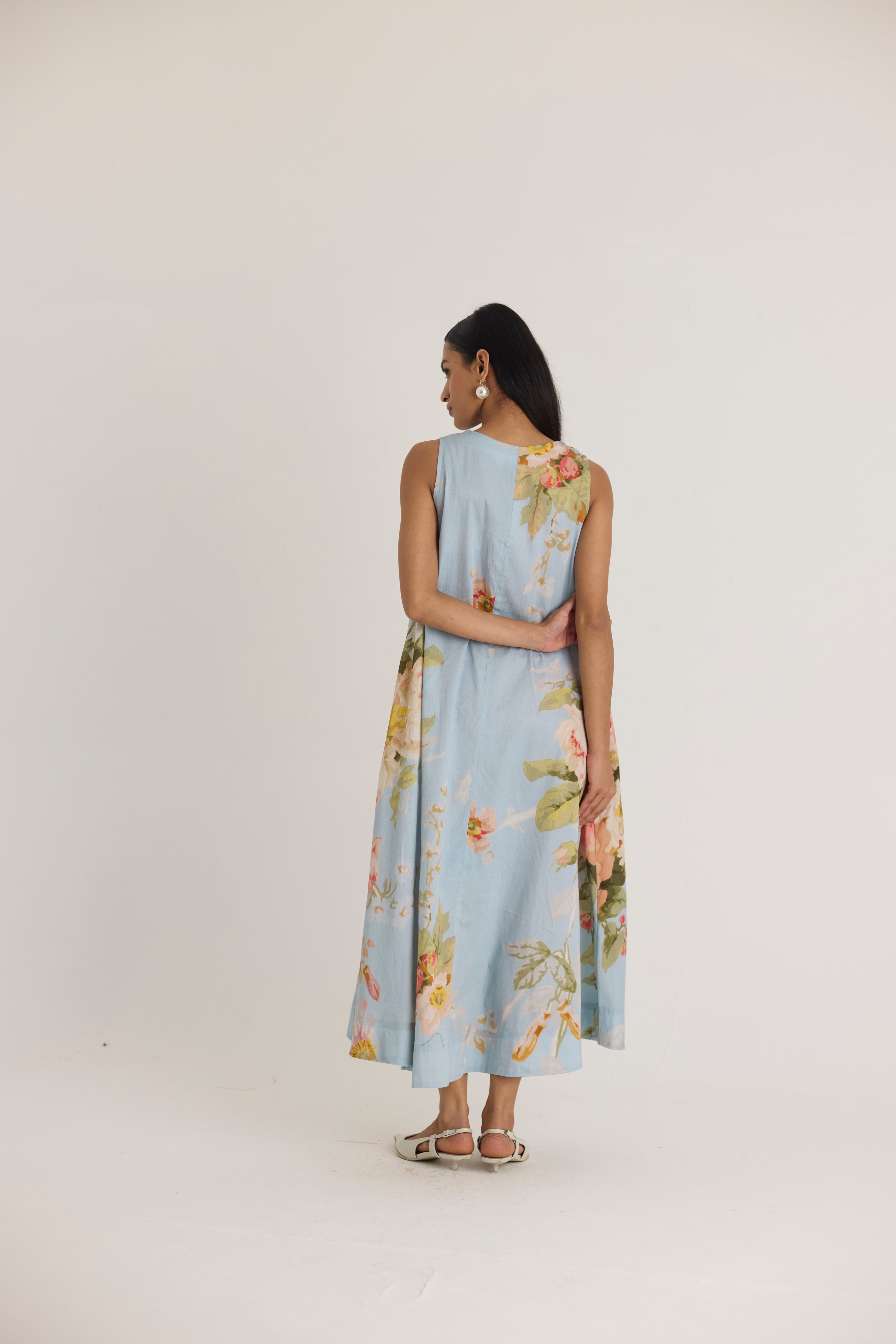 Flow into elegance with this sky blue sleeveless maxi dress, featuring a soft floral print that embodies grace and effortless charm. Designed for the modern woman who values both style and comfort, this flowy silhouette is perfect for summer soirées, brunches, and vacations.