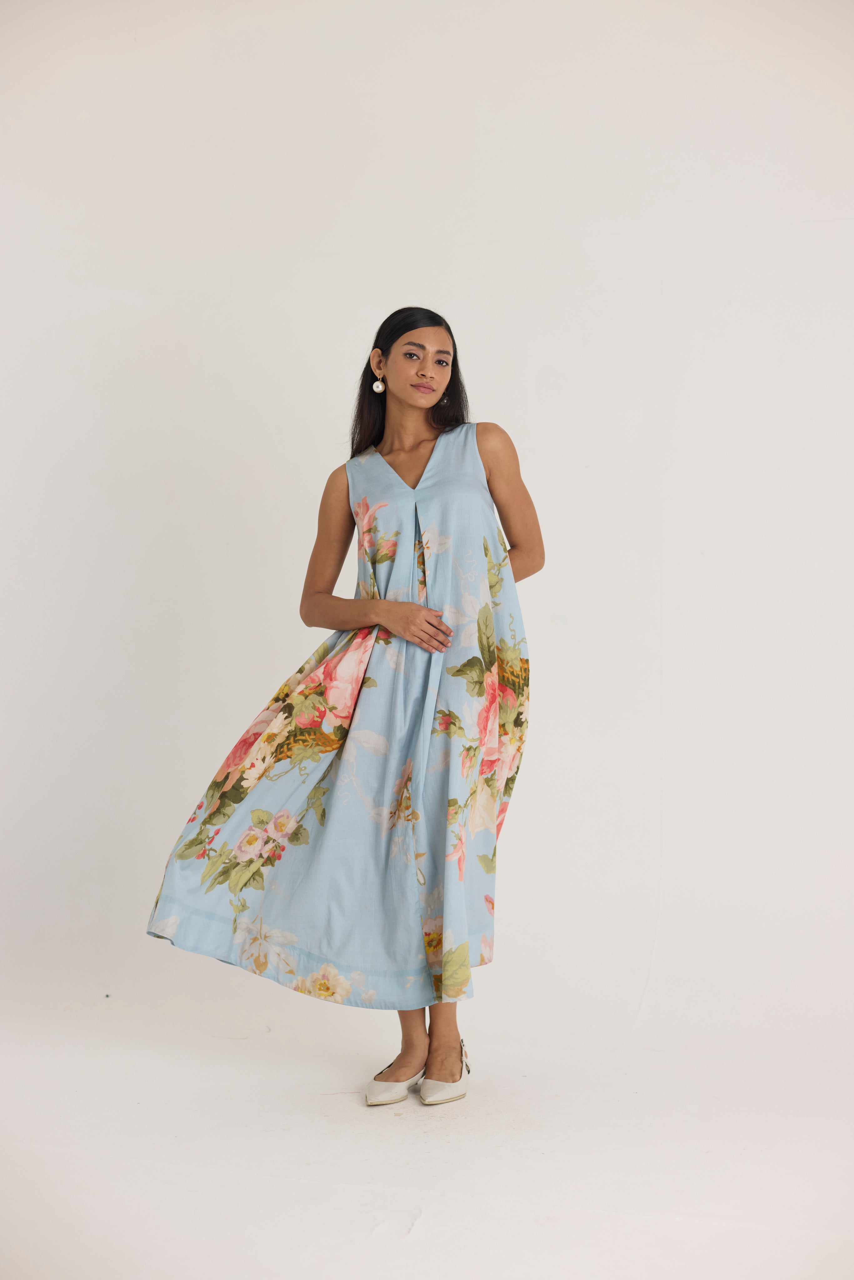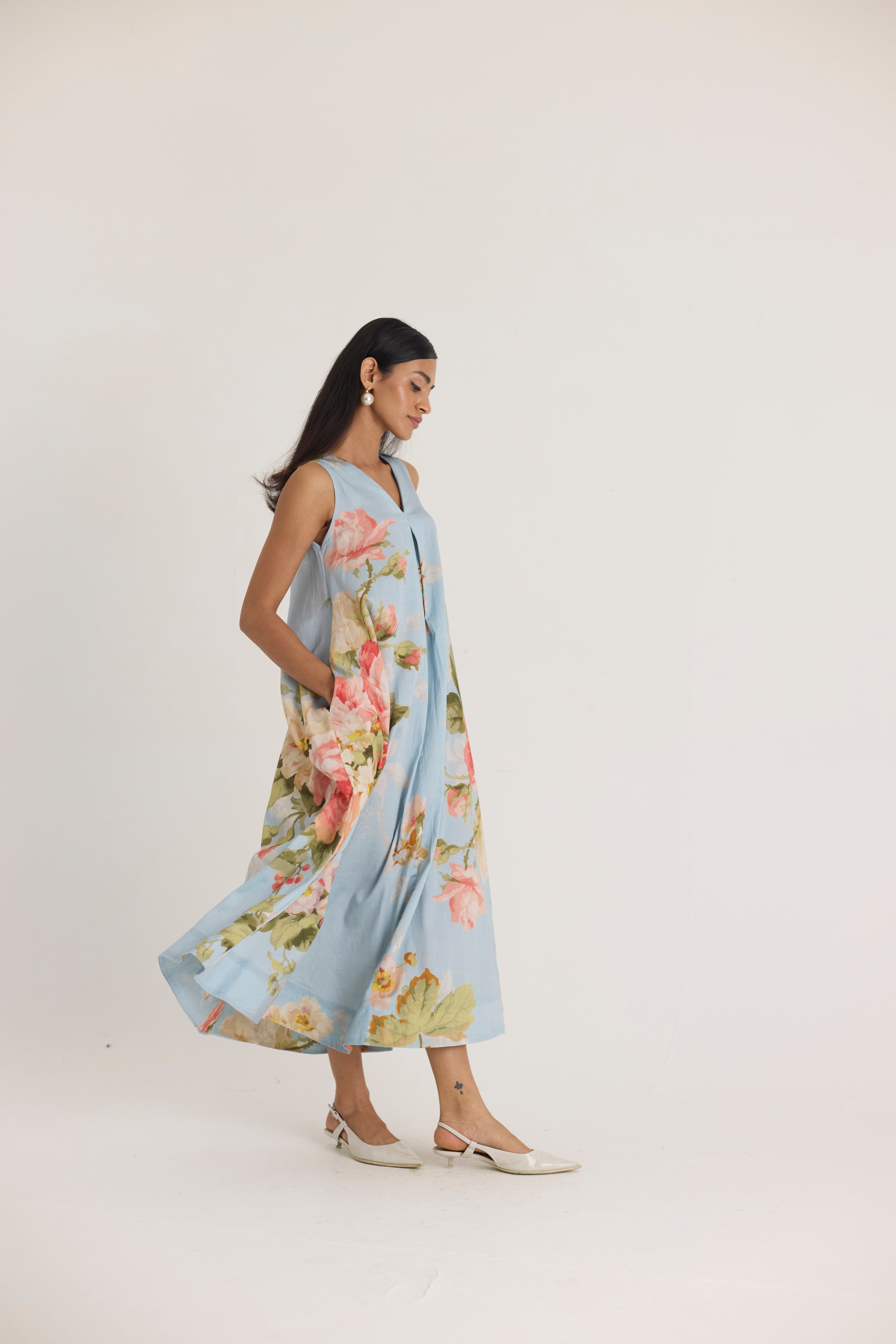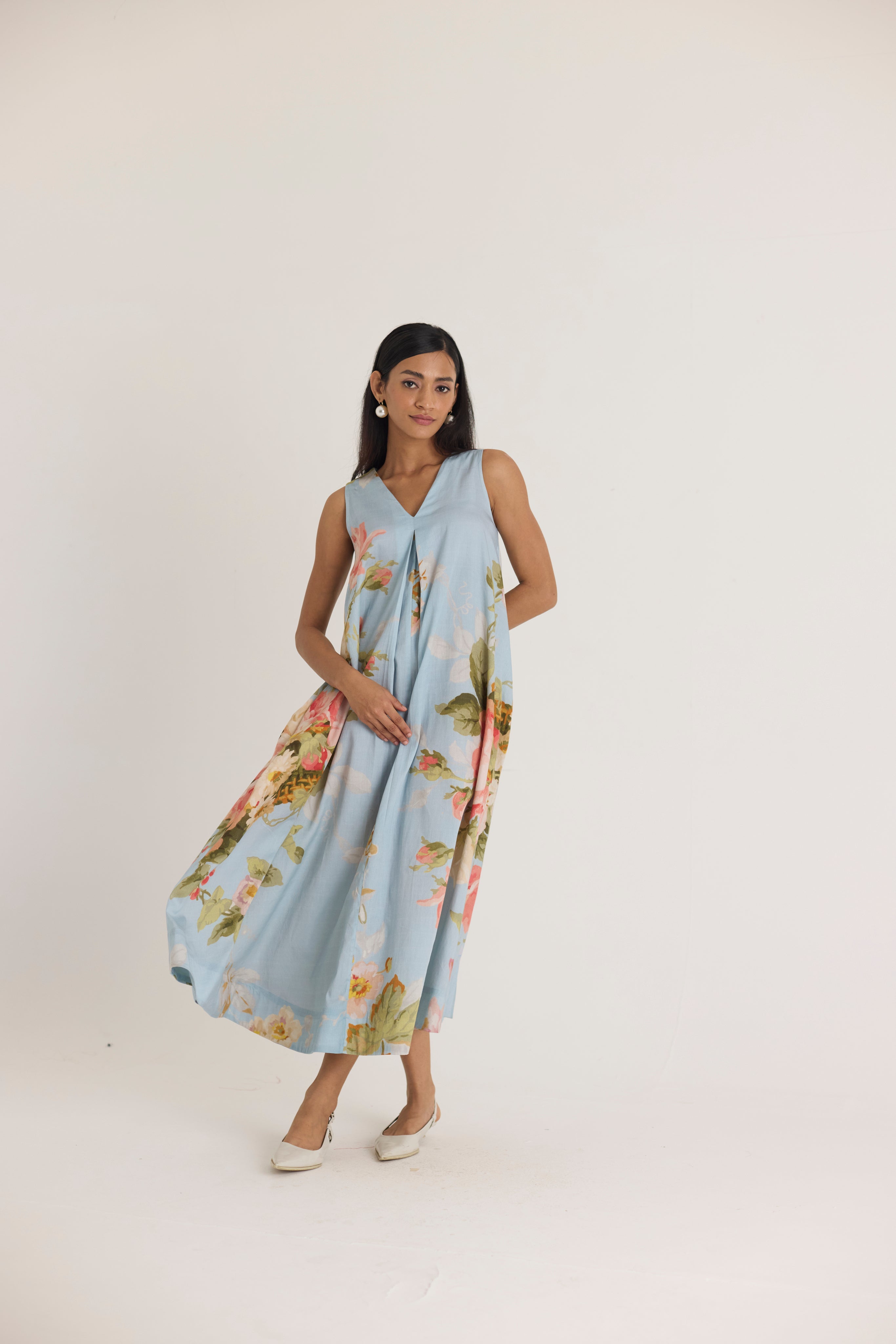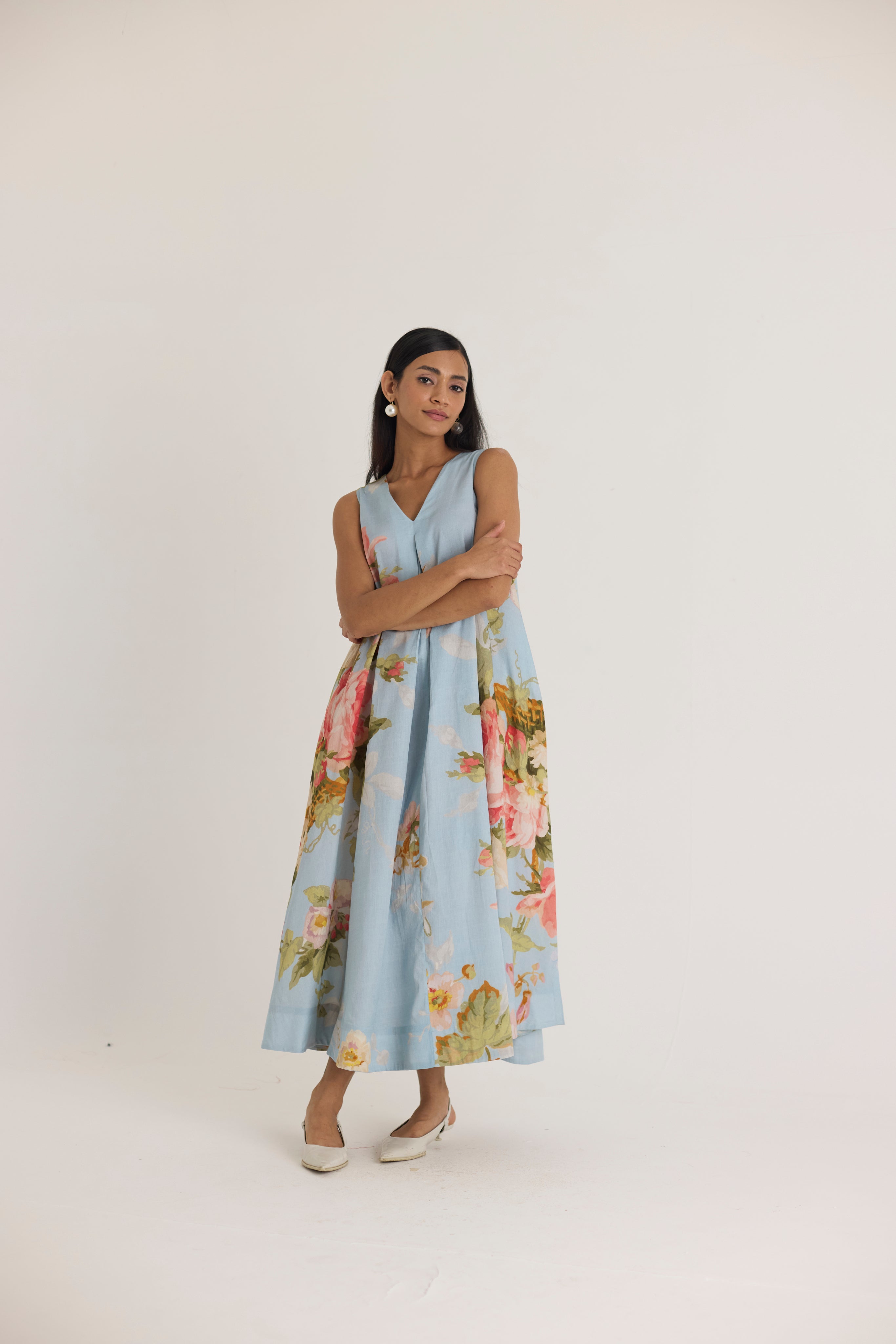 Flow into elegance with this sky blue sleeveless maxi dress, featuring a soft floral print that embodies grace and effortless charm. Designed for the modern woman who values both style and comfort, this flowy silhouette is perfect for summer soirées, brunches, and vacations.