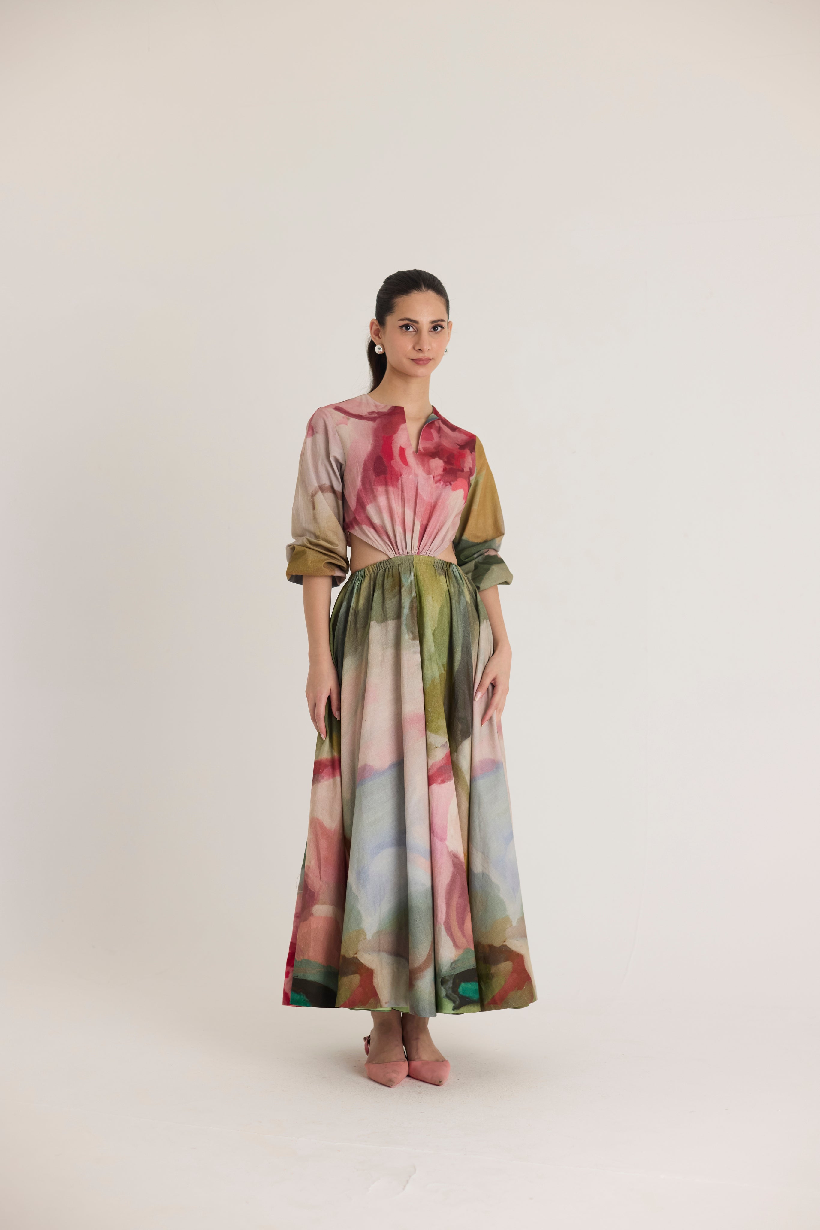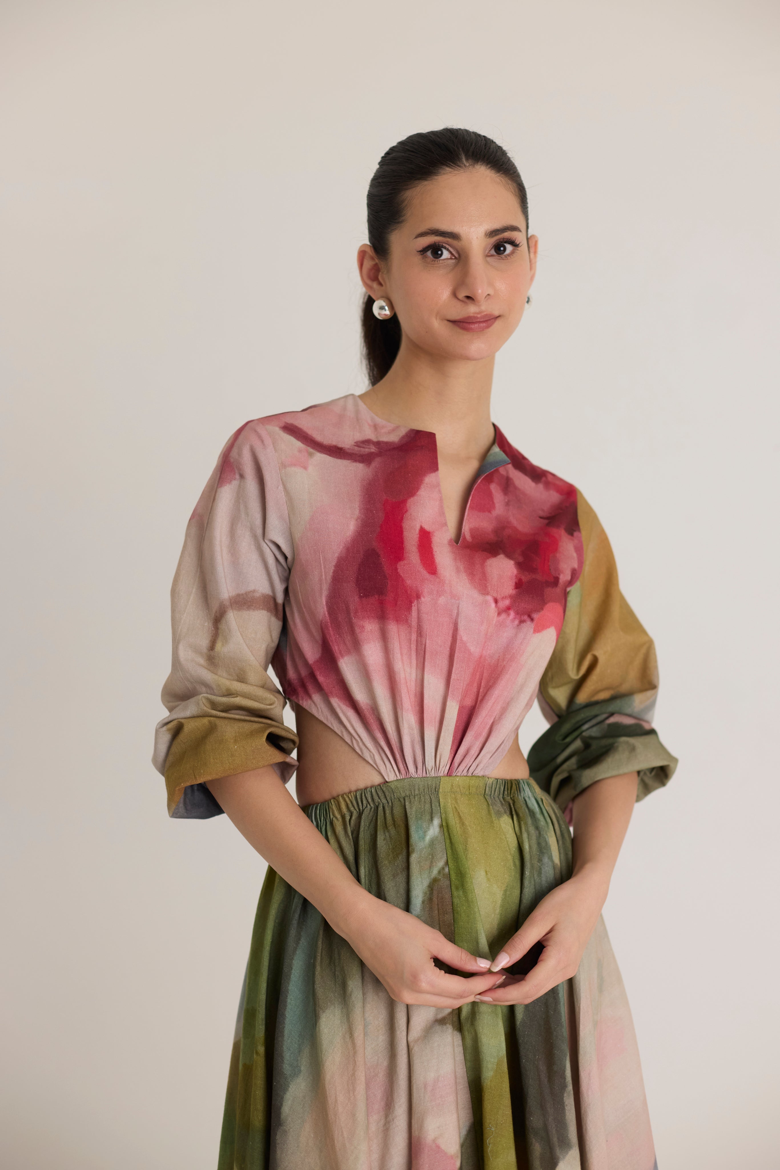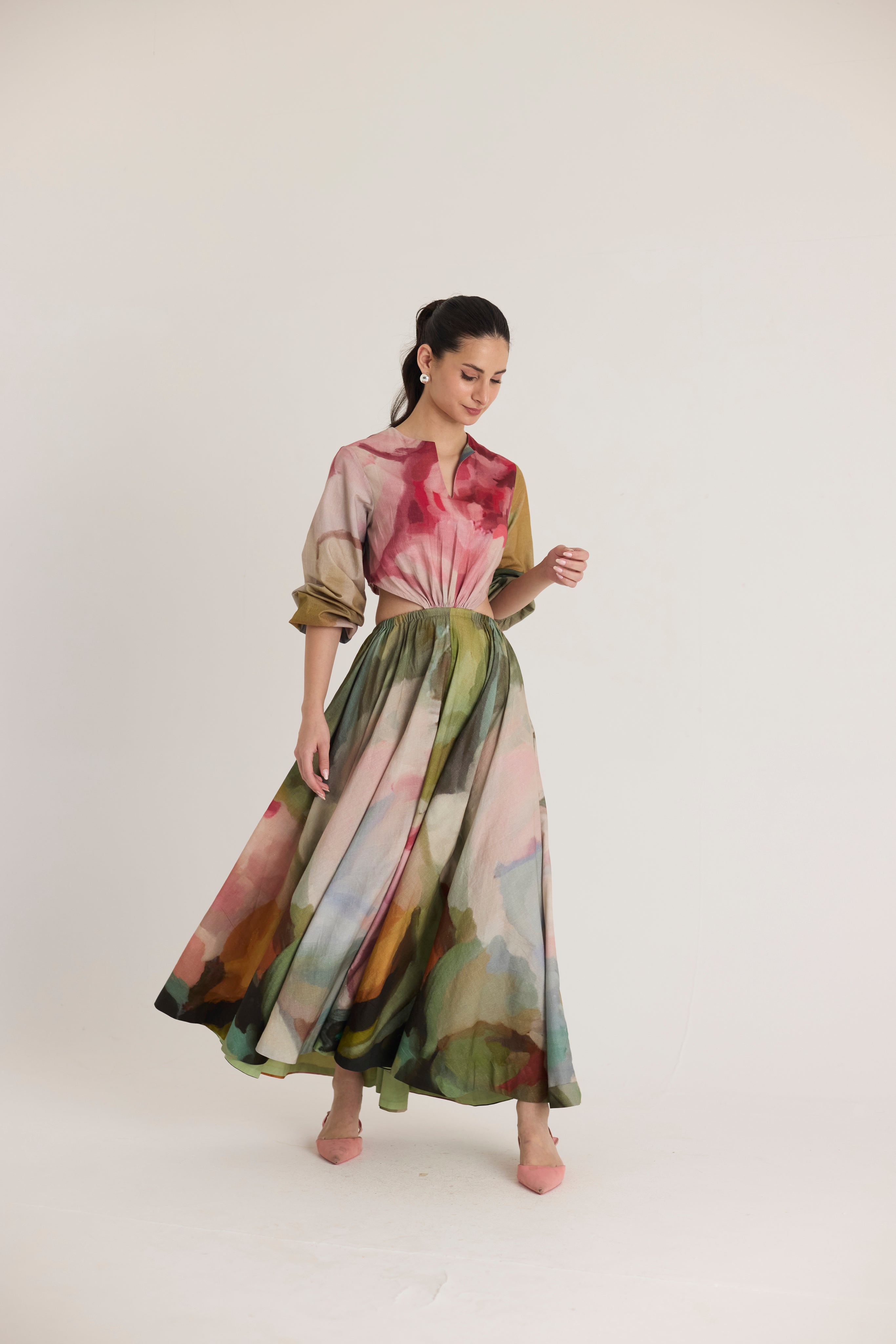 This captivating maxi dress features an artistic abstract floral print, resembling hand-painted brushstrokes in lush greens, deep reds, and muted neutrals. The dress is designed with a flowy silhouette and an elegant side cutout, adding a modern, playful touch while enhancing the waistline. Crafted from a lightweight, breathable fabric, it ensures effortless movement and comfort.